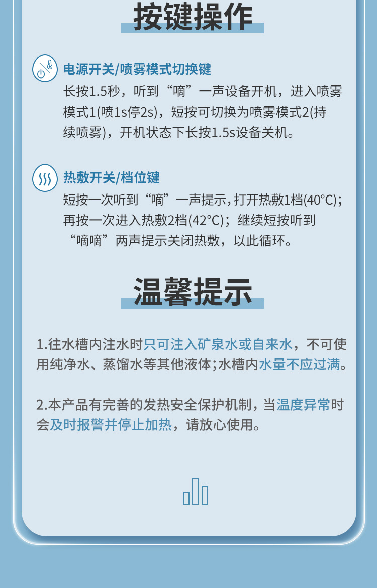 长按1.5秒,听到“嘀”一声设备开机,进入喷雾模式1(喷1秒停2秒),短接可切换为喷雾模式2(持续喷雾),开机状态长按1.5秒设备关机