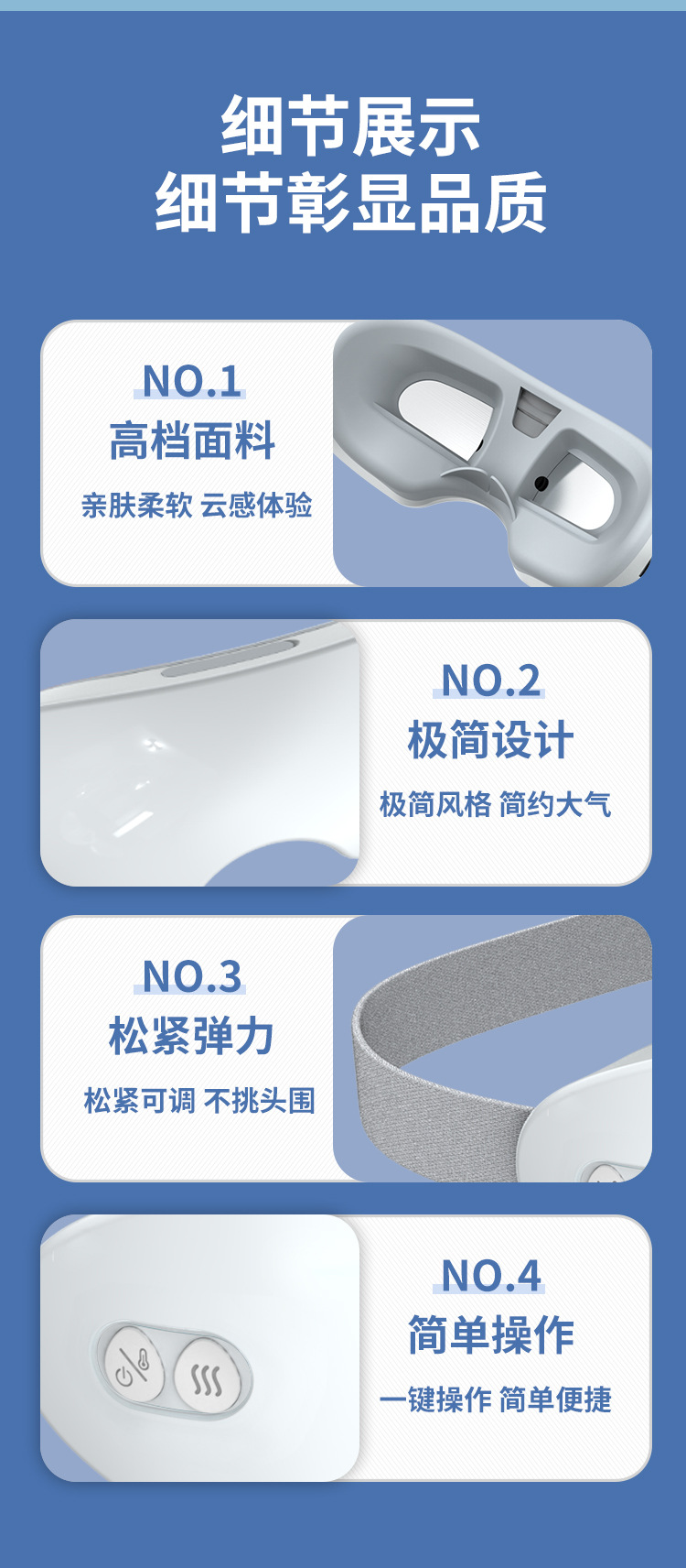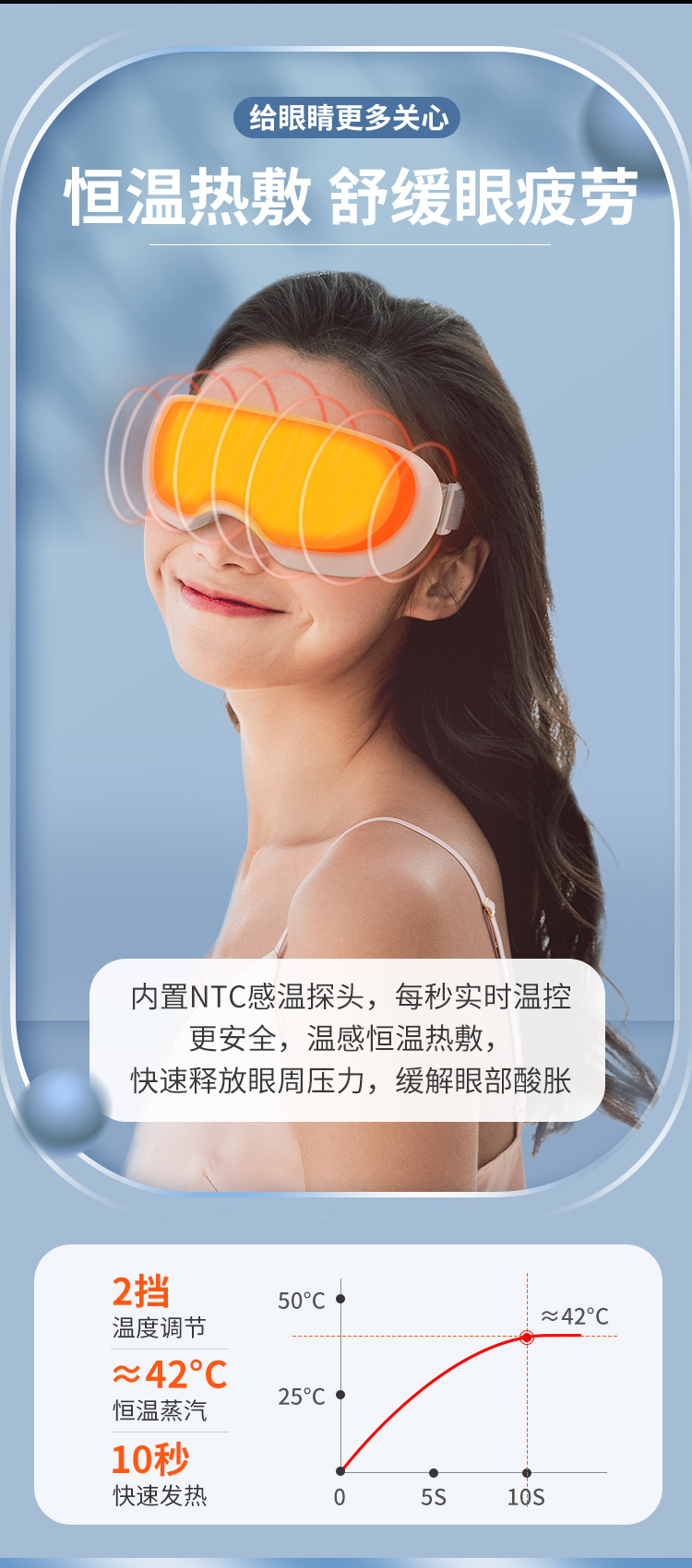 短按一次听到“嘀”一声提示,打开热敷1档(40度);再按一次进入热敷2档(42度);继续短接听到“嘀嘀”两声提示关闭热敷,以此循环。
