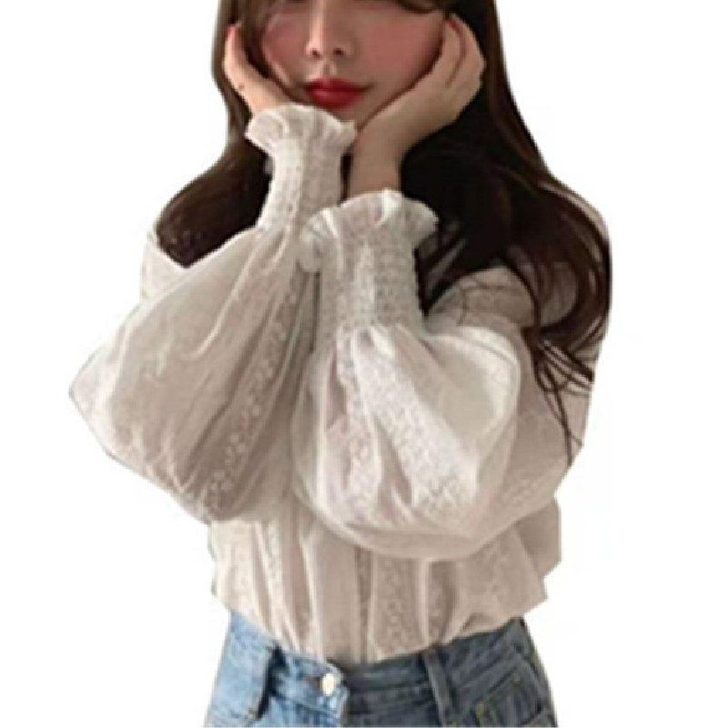 Элегантная рабочая одежда 2022, однотонный пуловер с рукавами-фонариками, белая кружевная рубашка с круглым вырезом в корейском стиле, элегантная рубашка большого размера