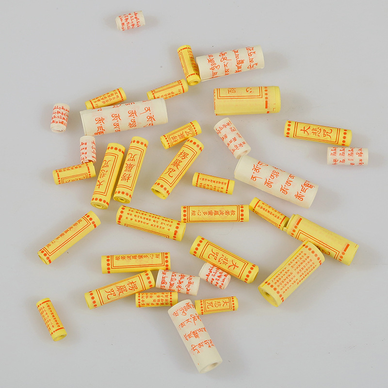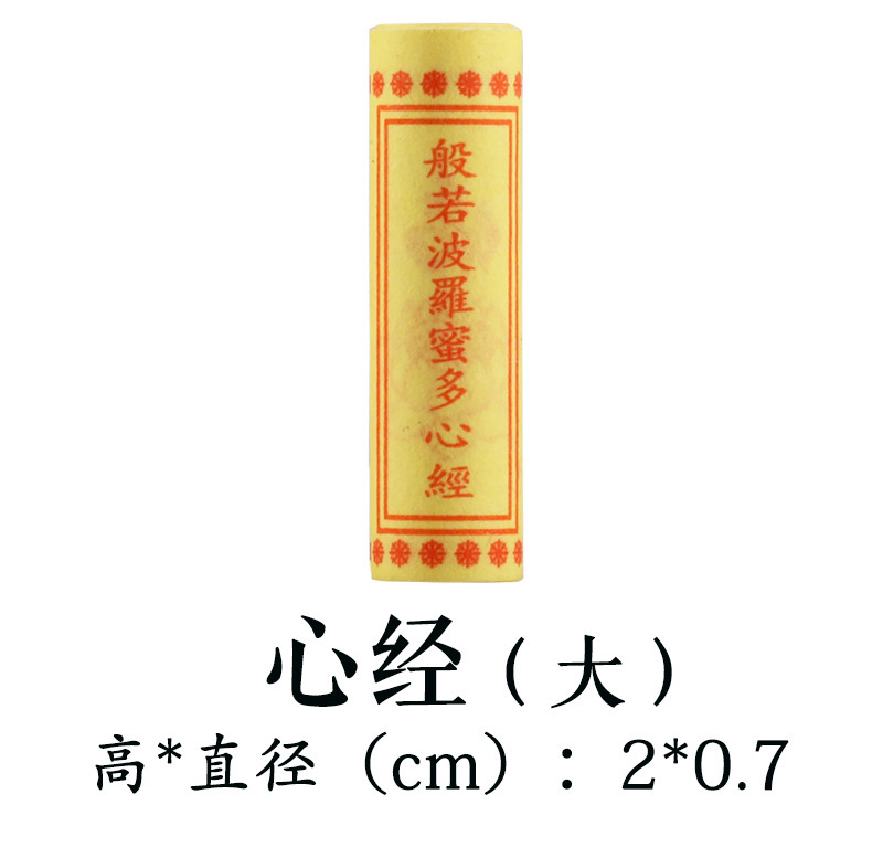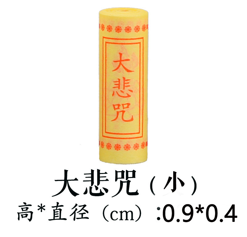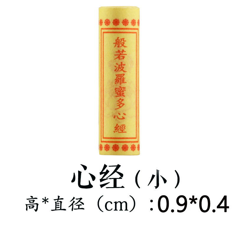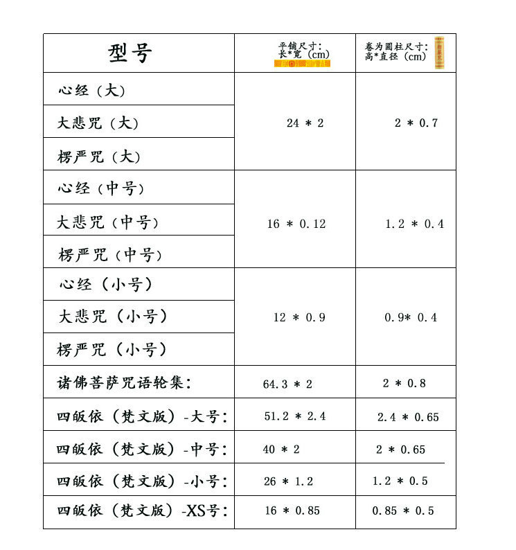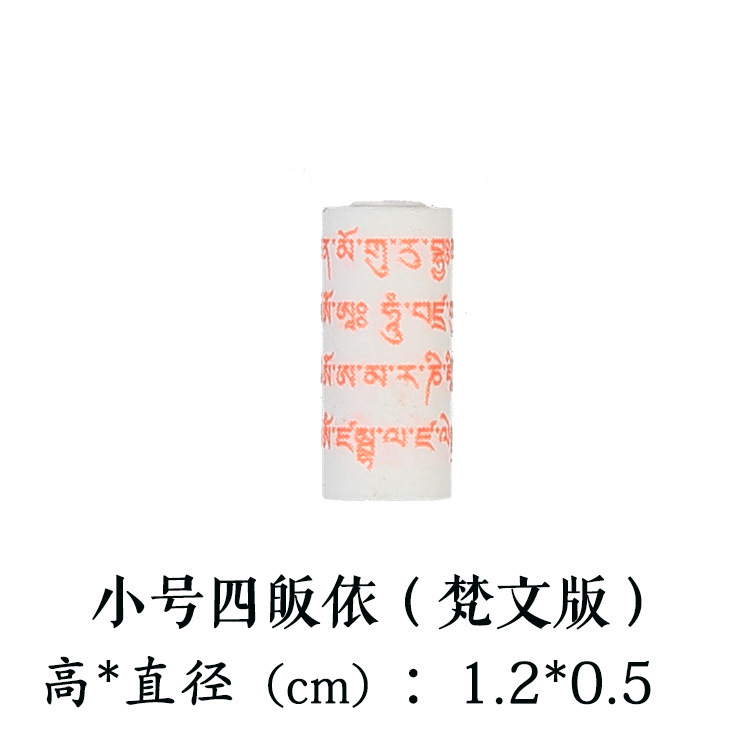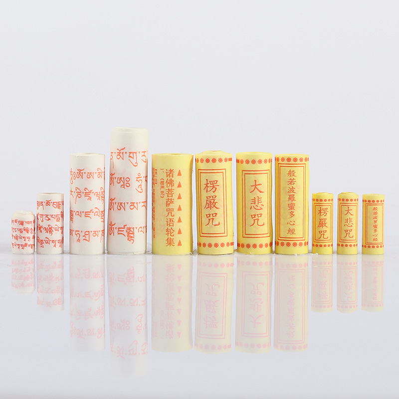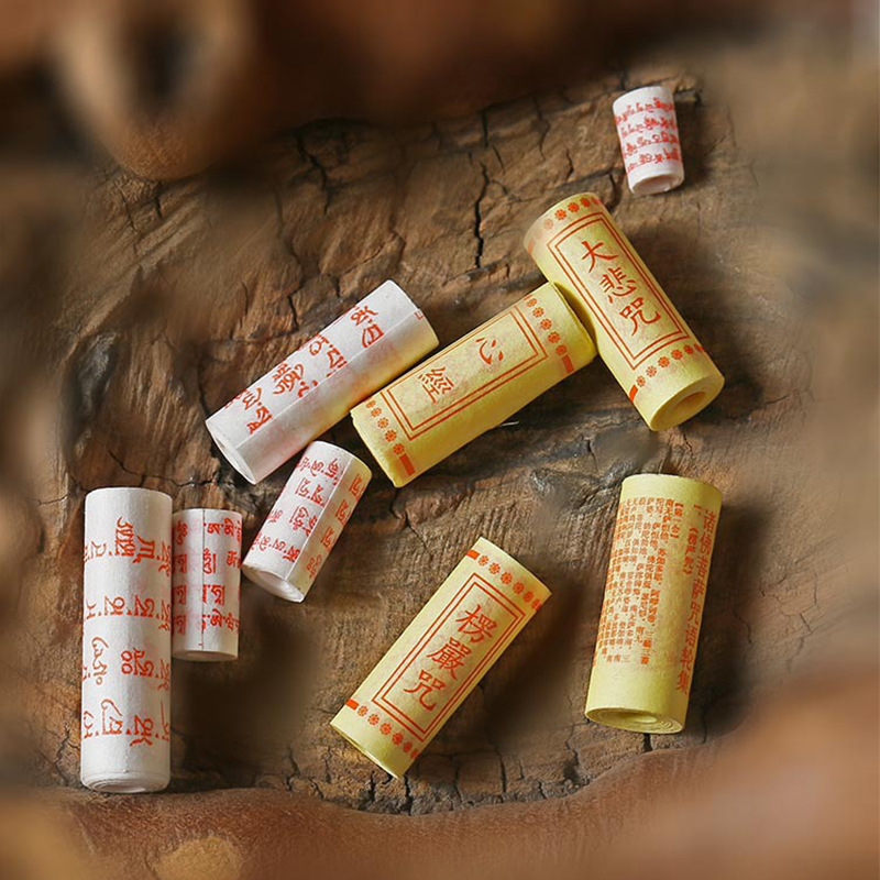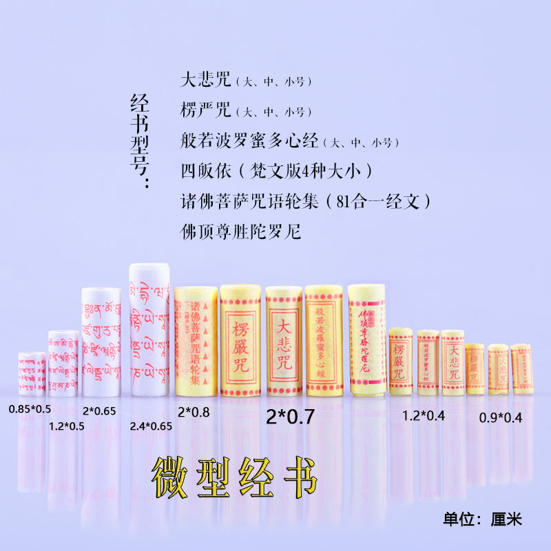 Сутра Сердца-Большая (2*0,7 см); Сутра сердца-средний (1,2*0,4 см); Сутра сердца-маленькая (0,9*0,4 см); Мантра «Большое сострадание» — большая (2*0,7 см); Мантра «Большое сострадание»-средний размер (1,2*0,4 см); Мантра «Большое сострадание» — маленькая (0,9*0,4 см); Мантра Шурангама-большая (2*0,7 см); Шурангама Мантра-средний (1,2*0,4 см); Шурангама Манта-Маленькая (0,9*0,4 см); Четыре убежища-большого размера (2,4*0,65); Четыре убежища-среднего размера (2*0,65); Четыре аспирации-маленький размер (1,2*0,5 см); XS Small Four Refuges-санскритский (0,85*0,5 см); Верхняя святая Дхарани Будды — большая (2*0,7 см); Верхняя священная дхарани Будды, маленькая (1,2*0,4 см); Коллекция колес мантры Будд и Бодхисаттв (2*0,75 см)