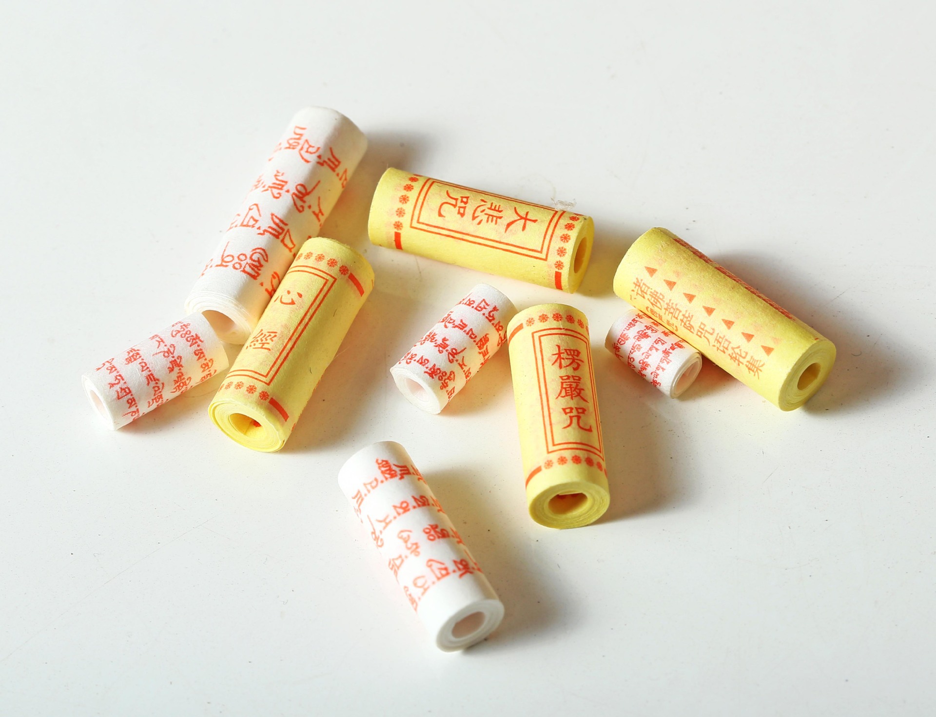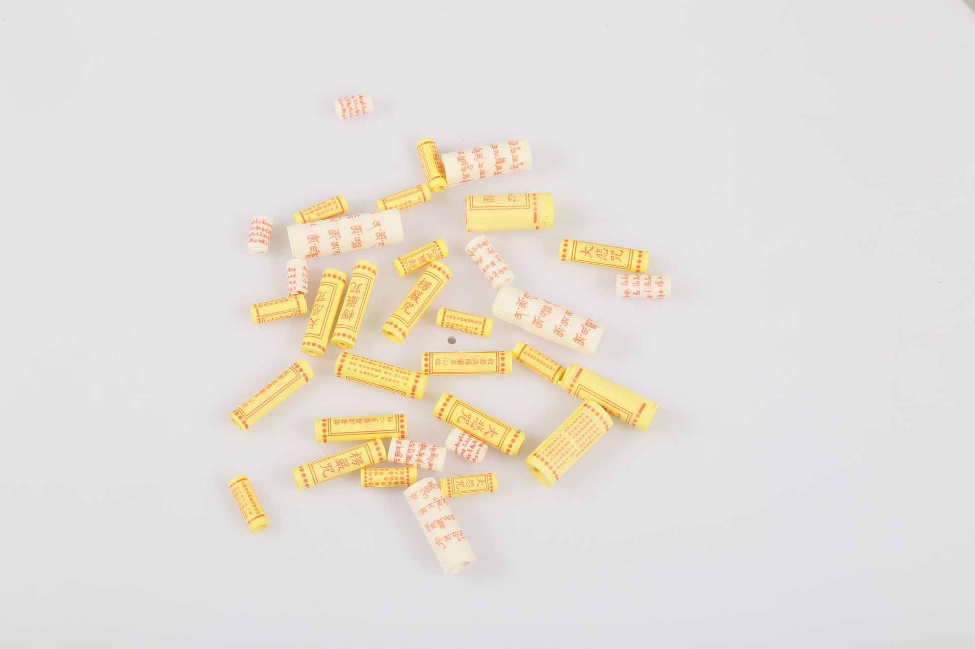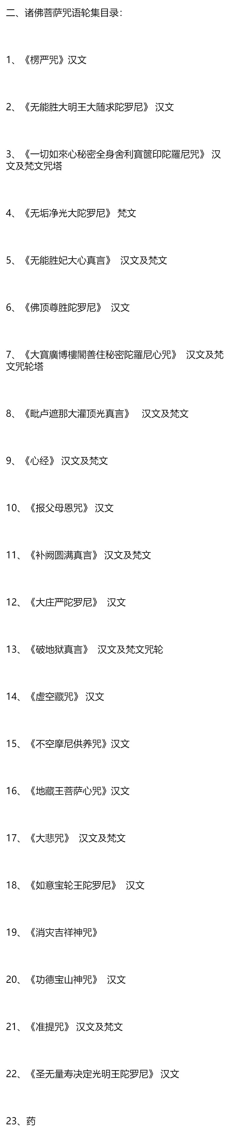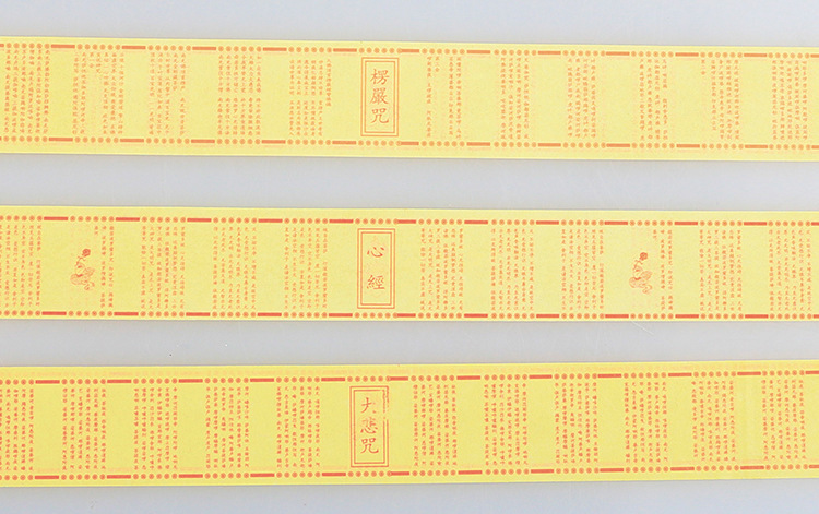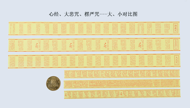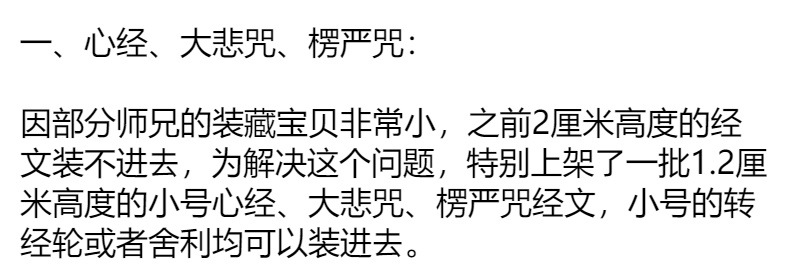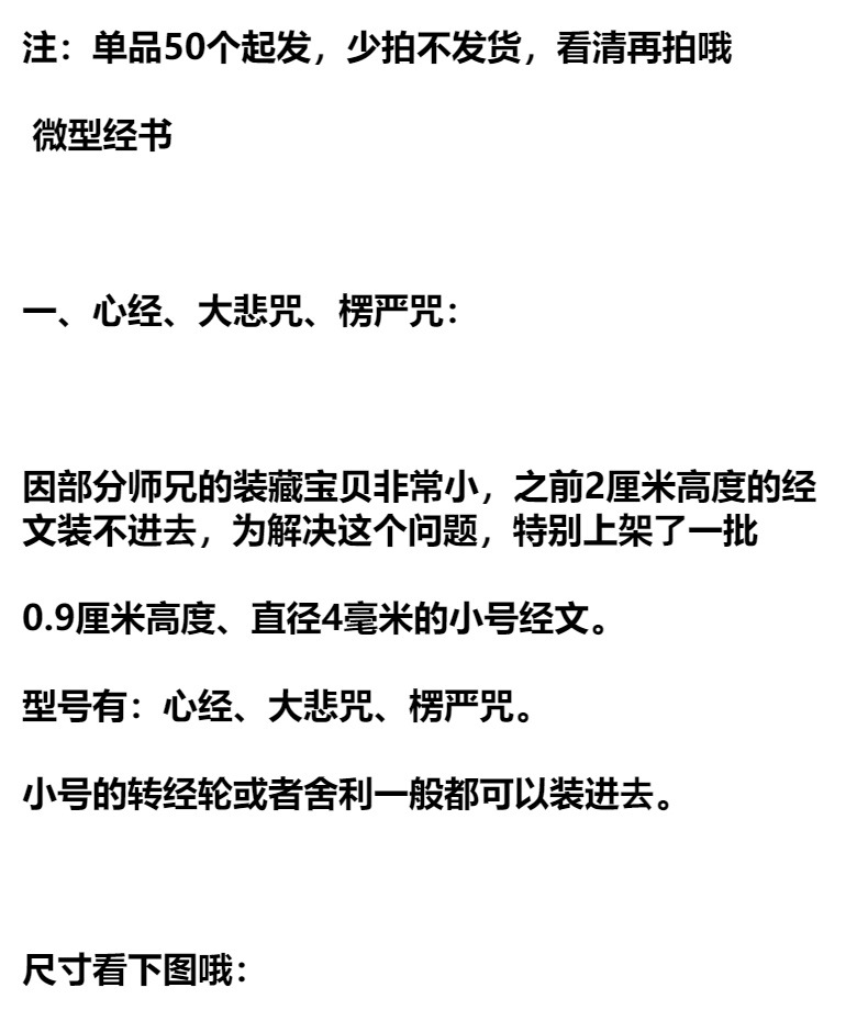 Сутра Сердца-Большая (2*0,7 см); Сутра сердца-средний (1,2*0,4 см); Сутра сердца-маленькая (0,9*0,4 см); Мантра «Большое сострадание» — большая (2*0,7 см); Мантра «Большое сострадание»-средний размер (1,2*0,4 см); Мантра «Большое сострадание» — маленькая (0,9*0,4 см); Мантра Шурангама-большая (2*0,7 см); Шурангама Мантра-средний (1,2*0,4 см); Шурангама Манта-Маленькая (0,9*0,4 см); Четыре убежища-большого размера (2,4*0,65); Четыре убежища-среднего размера (2*0,65); Четыре аспирации-маленький размер (1,2*0,5 см); XS Small Four Refuges-санскритский (0,85*0,5 см); Верхняя святая Дхарани Будды — большая (2*0,7 см); Верхняя священная дхарани Будды, маленькая (1,2*0,4 см); Коллекция колес мантры Будд и Бодхисаттв (2*0,75 см)