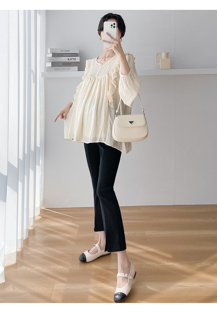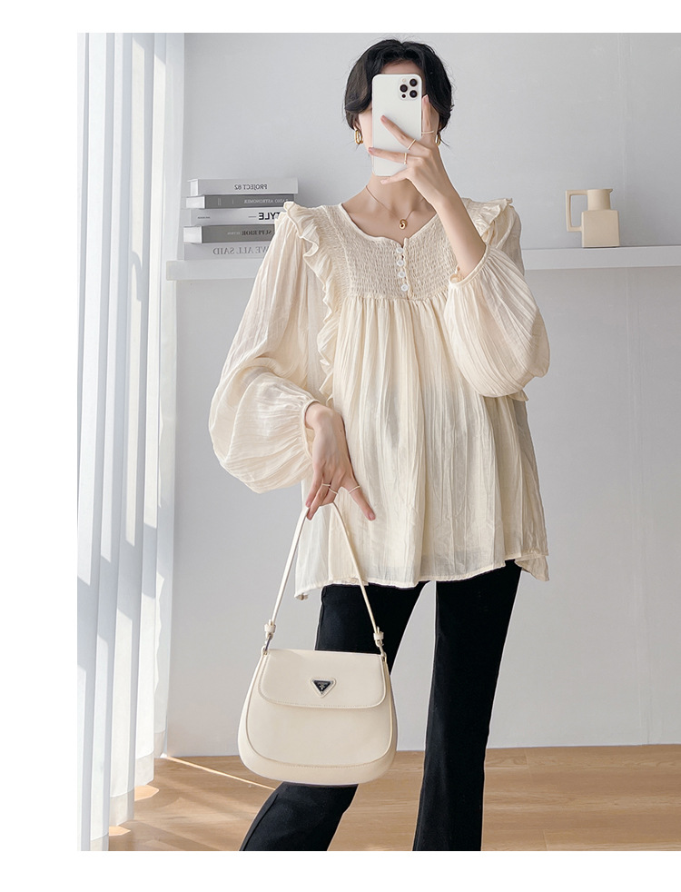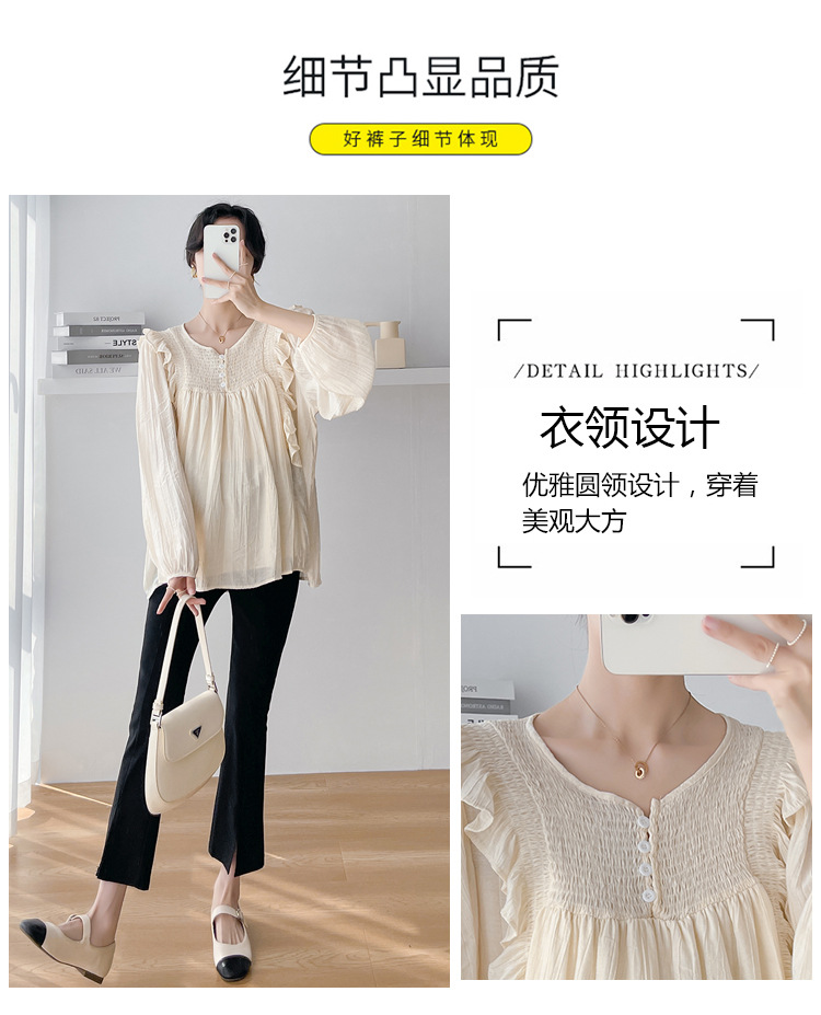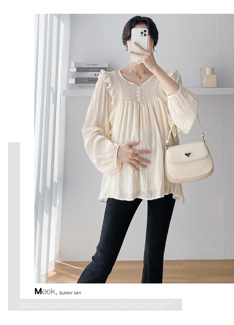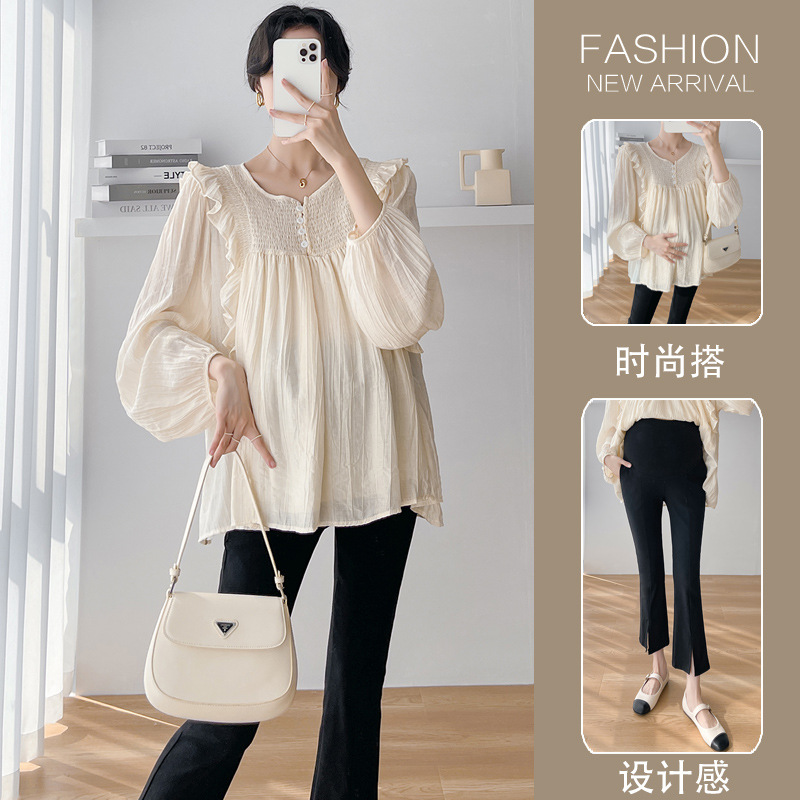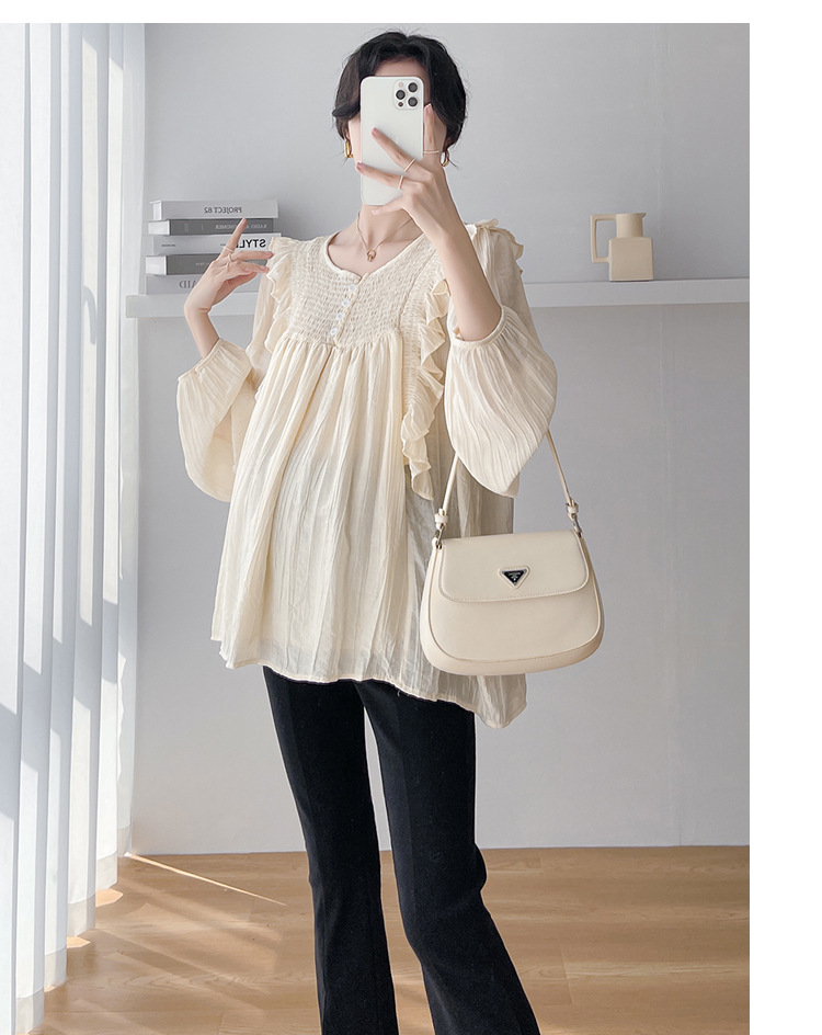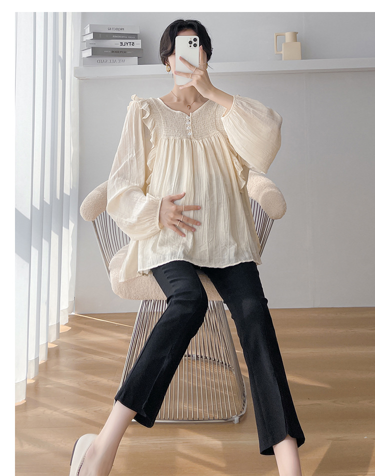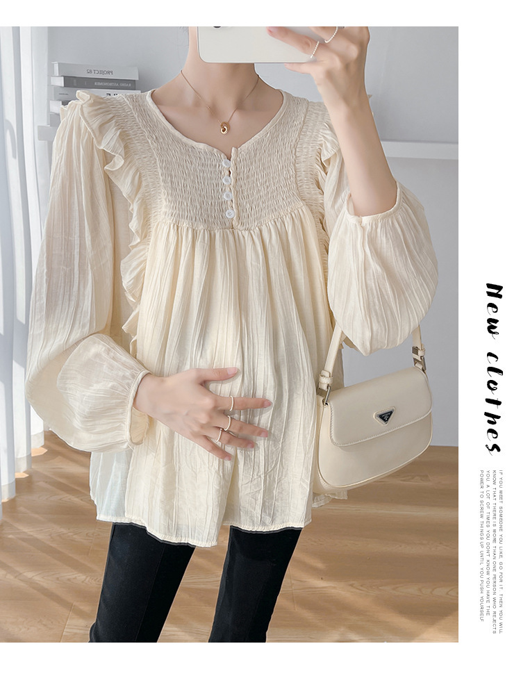 Новая весенне-осенняя одежда для беременных: свободный топ-рубашка с рюшами, V-образным вырезом и длинными рукавами