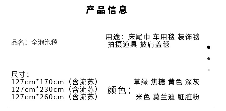 127cm * 170cm (с кисточками) 1,2 м Кровать; 127cm * 230cm (с кисточками) 1,8 м Кровать; 127cm * 260cm (с бахромой) 2 м Кровать; 70cm * 230cm (с бахромой); 70cm * 260cm (с бахромой); Наволочка Наволочка (один); Пузырь один наволочка