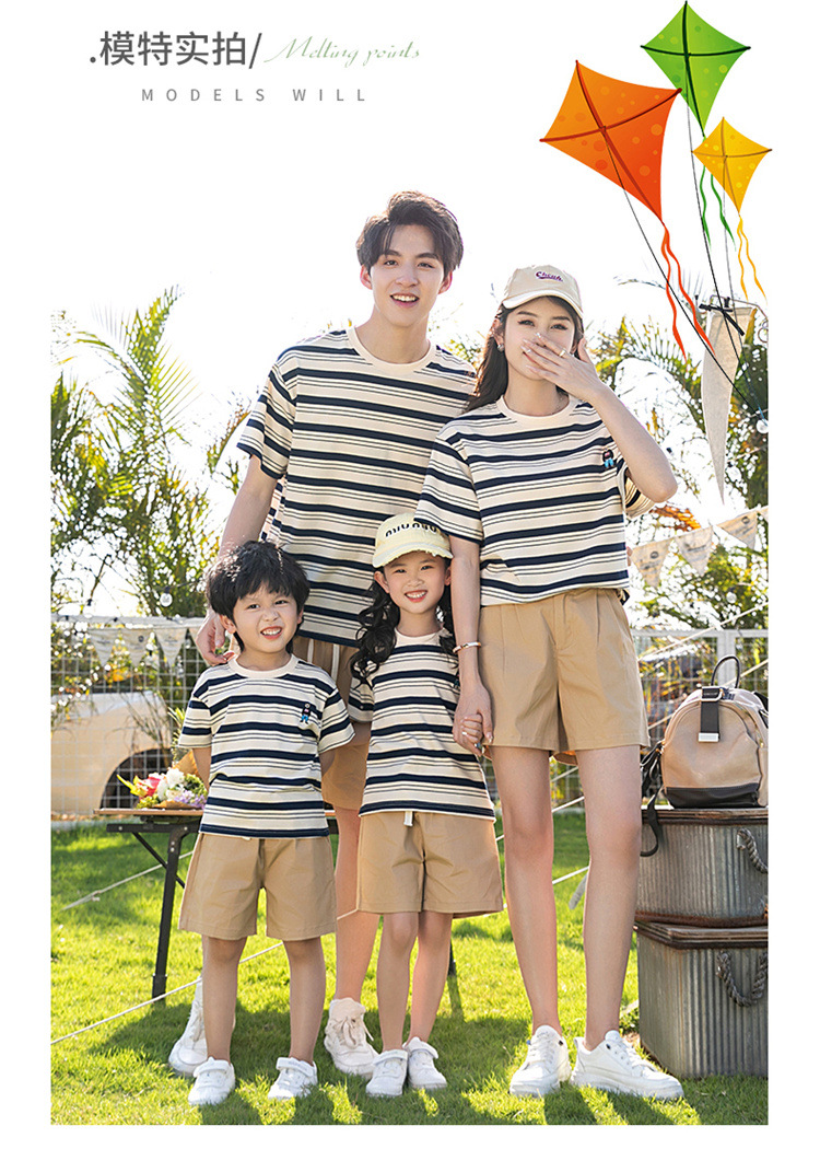 Модный бренд в полоску для родителей и детей с короткими рукавами, семейная одежда для родителей и детей с тремя ртами и четырьмя ртами, тяжелая вышивка, круглый вырез, футболка больших размеров, полное украшение для дома