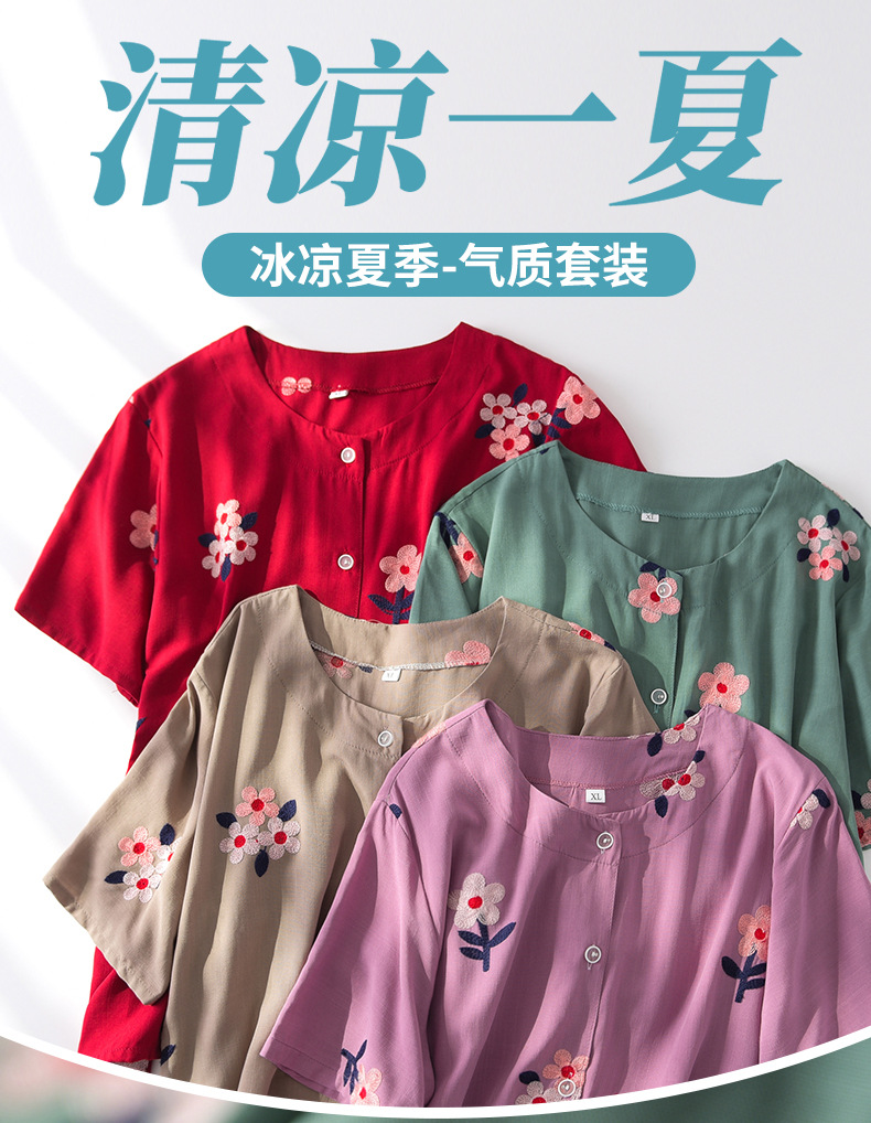 Летний кардиган для матери с короткими рукавами, женский свободный костюм для среднего и пожилого возраста, рубашка, хлопковый Шелковый комплект из двух предметов для бабушки