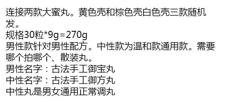 Мужские таблетки 30*9 таблеток (древние таблетки Юбао ручной работы); Нейтральные таблетки 30*9 таблеток (древние ручные Royal Pills); Мужская таблетка 30*9 таблетки (Древняя королевская таблетка ручной работы) с маркировкой ① ②; красная оболочка