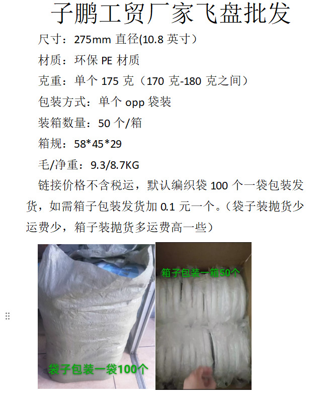 本店链接飞盘都是批发价格不含税运的价格,默认编织袋装发货,如需箱子58*45*29装50个发货单价加0.1元一个。