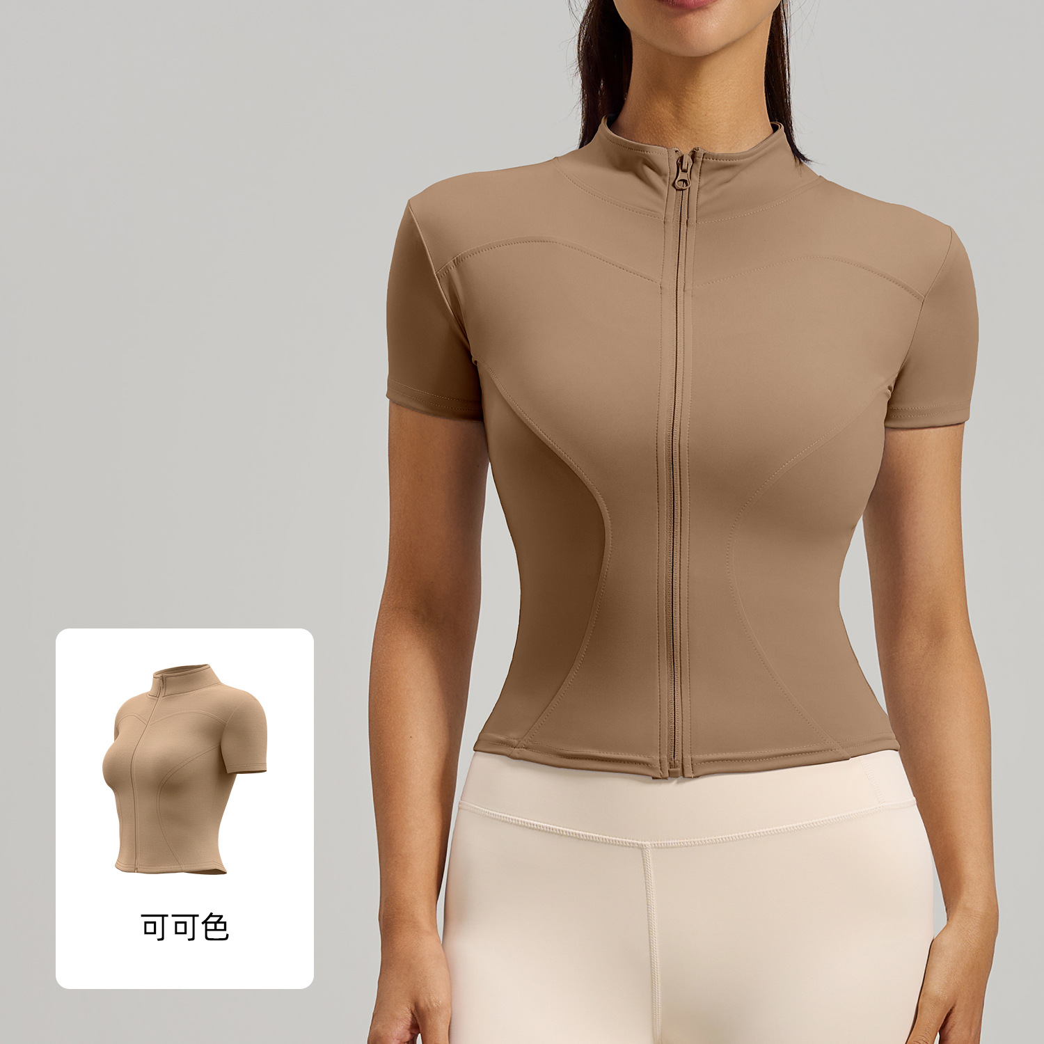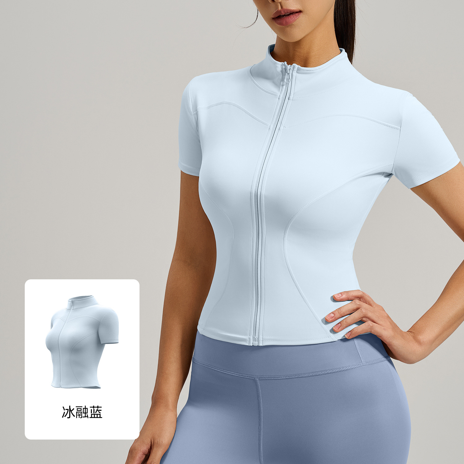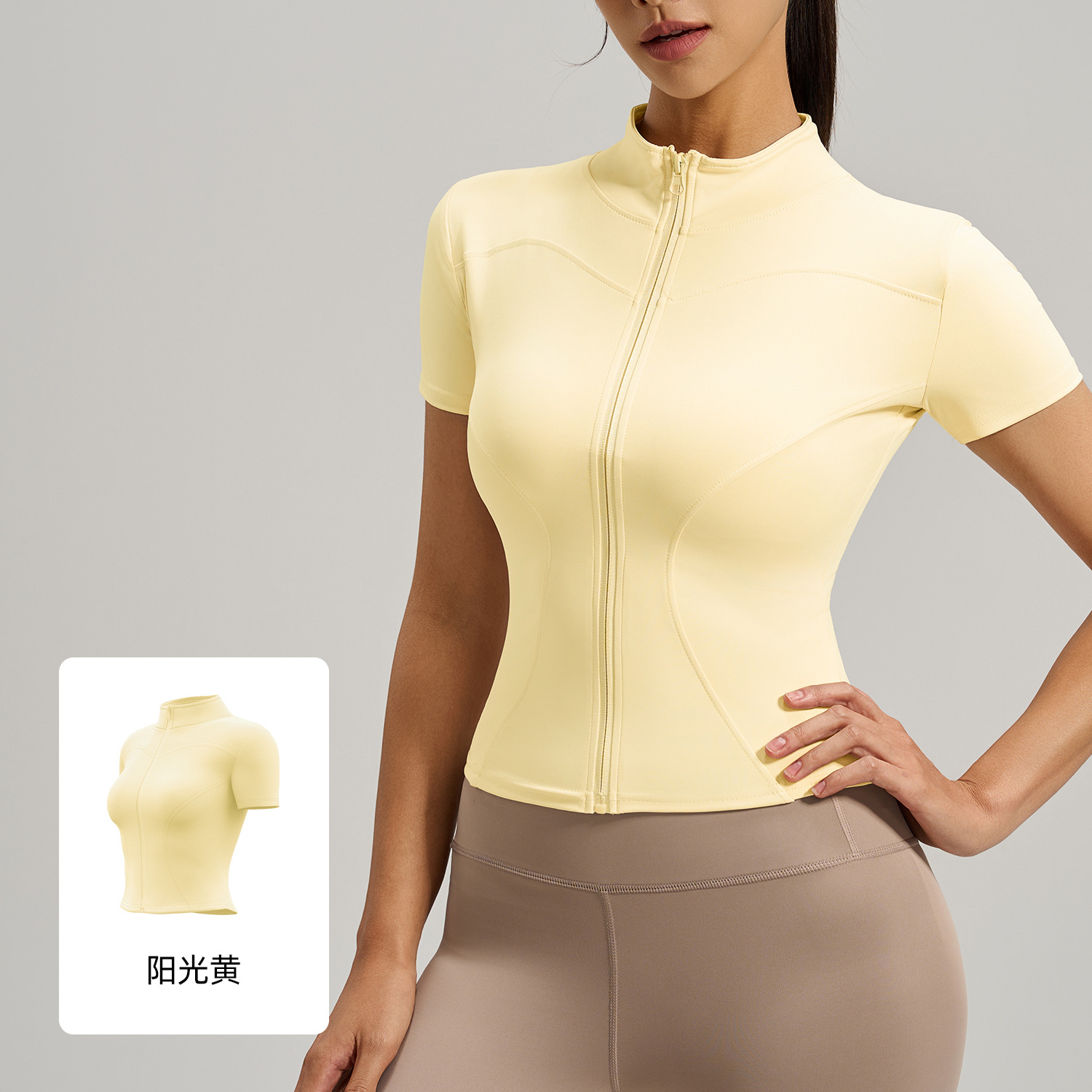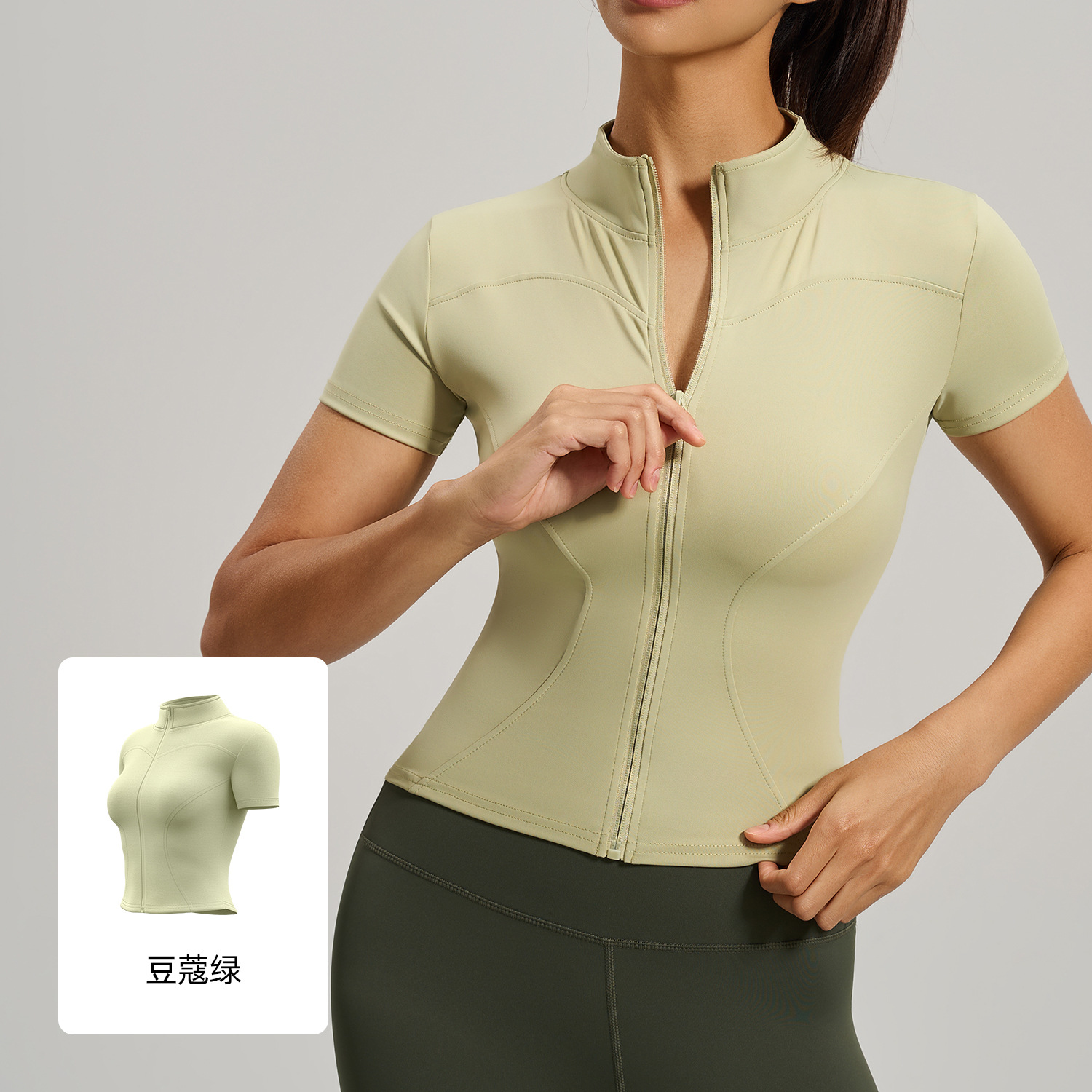 Спортивный топ Juyitang для йоги, облегающий, с эффектом «второй кожи», воротник-стойка, на молнии, с коротким рукавом