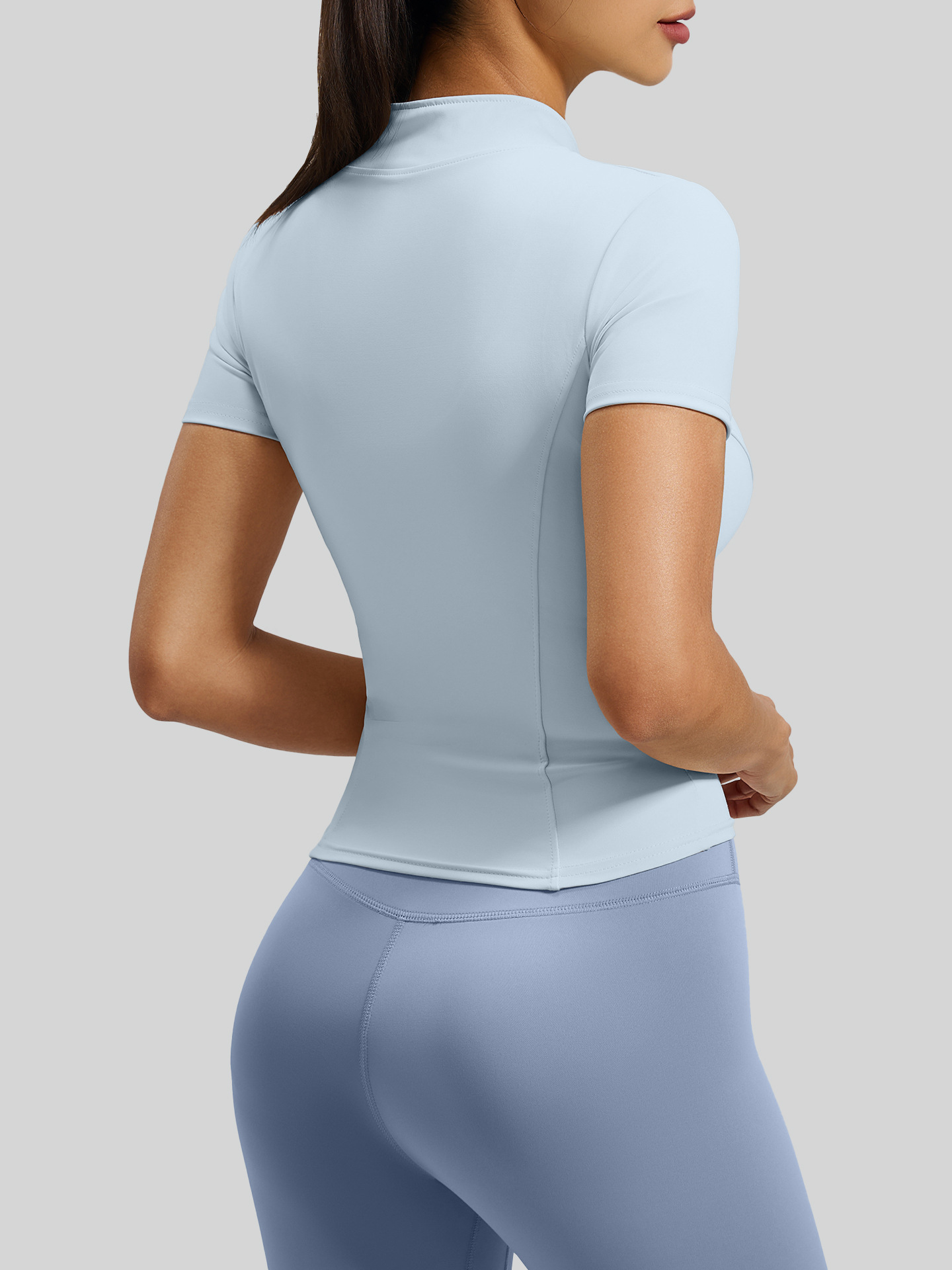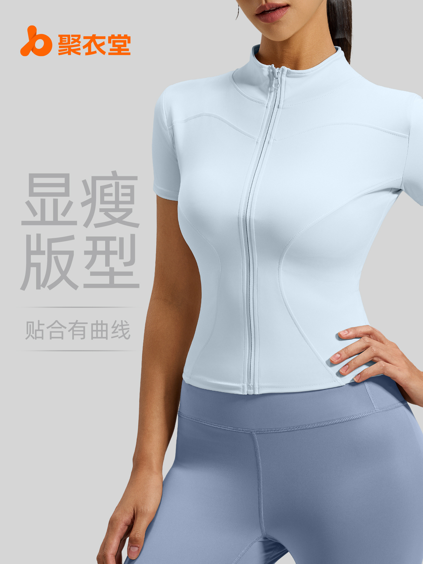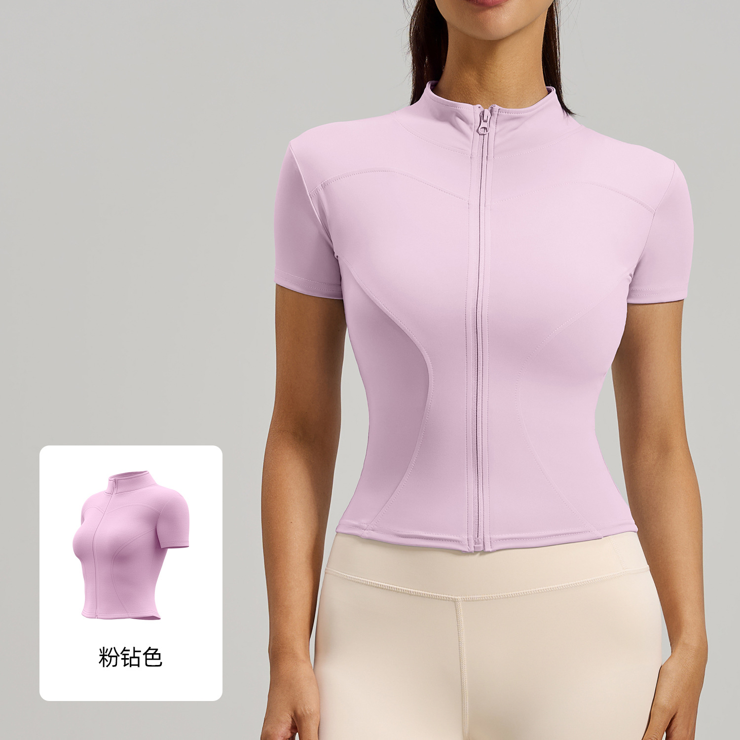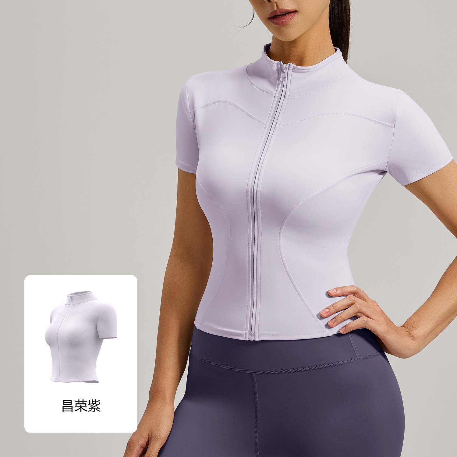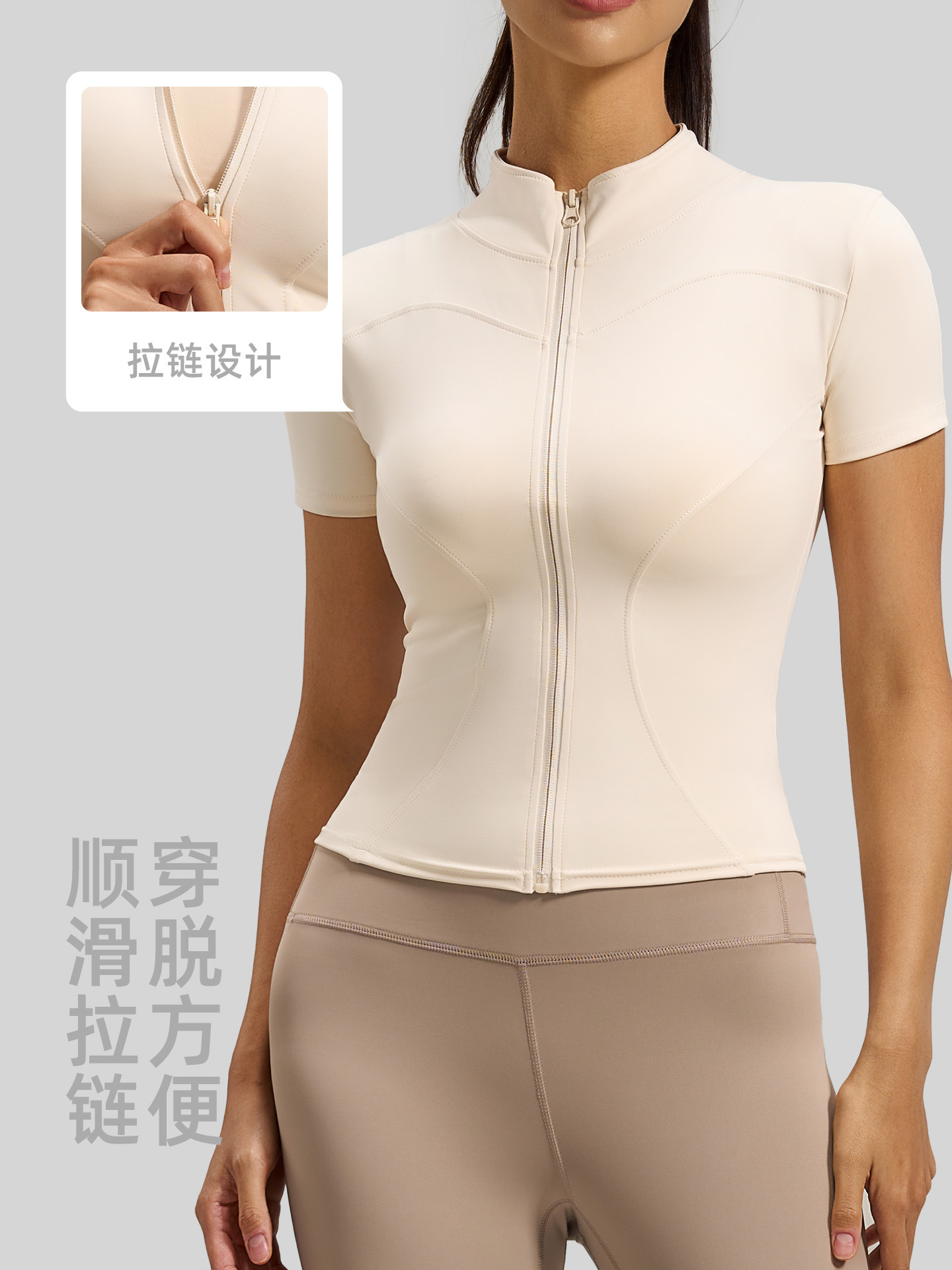 Спортивный топ Juyitang для йоги, облегающий, с эффектом «второй кожи», воротник-стойка, на молнии, с коротким рукавом