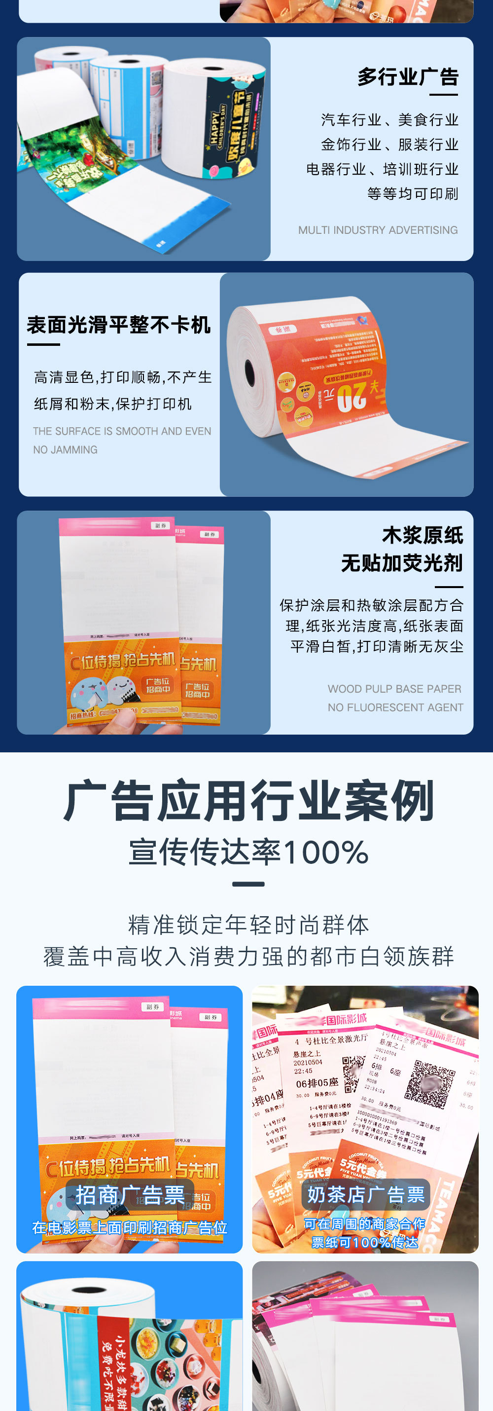 采用80G 超光滑显色好热敏纸,纸张光滑,显色好,打印顺畅!不损打印机!