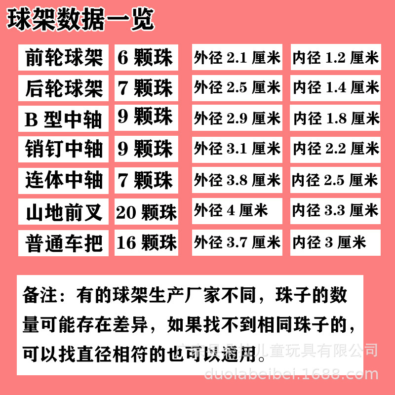 Наружный диаметр 2,1 см (шариковый держатель передней оси) 1 шт.; Наружный диаметр 2,5 см (шариковый держатель задней оси) 1 шт.; Наружный диаметр 3,1 см (общий средний вал) 1 шт.; Наружный диаметр 3,7 см (стойка для шариков передней вилки) 1 шт.; Наружный диаметр 3,8 см (соединенный средний вал) 1 шт.; Внешний диаметр 4 см (стойка для мячей для горного велосипеда) 1 шт.; Наружный диаметр 2,9 см (средний вал B-типа) 1 шт.