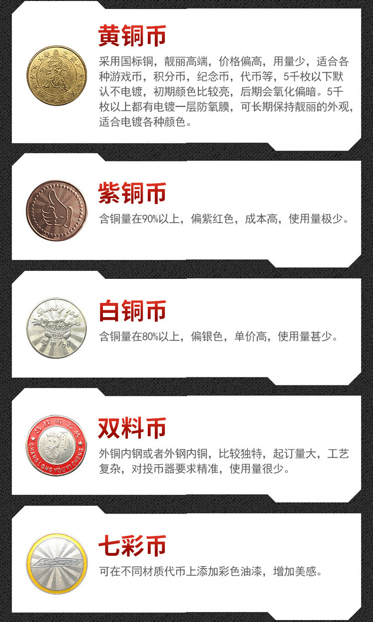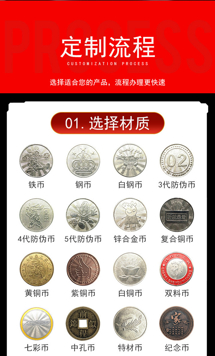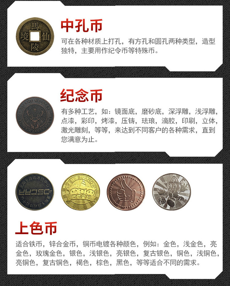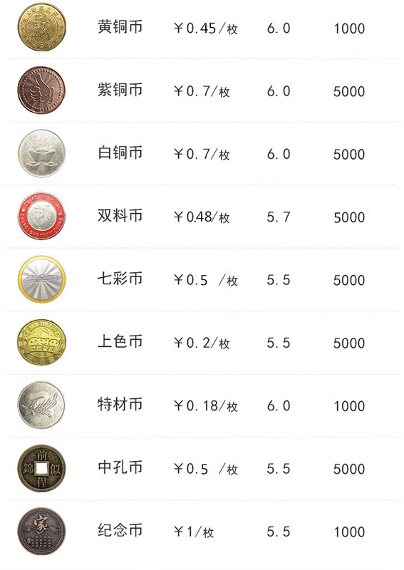 Монета железа; Монета нержавеющей стали; Белая стальная монета; Специальная монета; Цветные монеты (гальваника); Цинкового сплава монета; 3 поколения монет по борьбе с подделками; 4 поколения монет по борьбе с подделками; 5 поколений монет по борьбе с подделками; 6 поколений монет по борьбе с подделками; Латунные монеты; Фиолетовая медная монета; Белая медная монета; Чжунконг Монета; Цветные монеты; Двойная монета; Памятные монеты