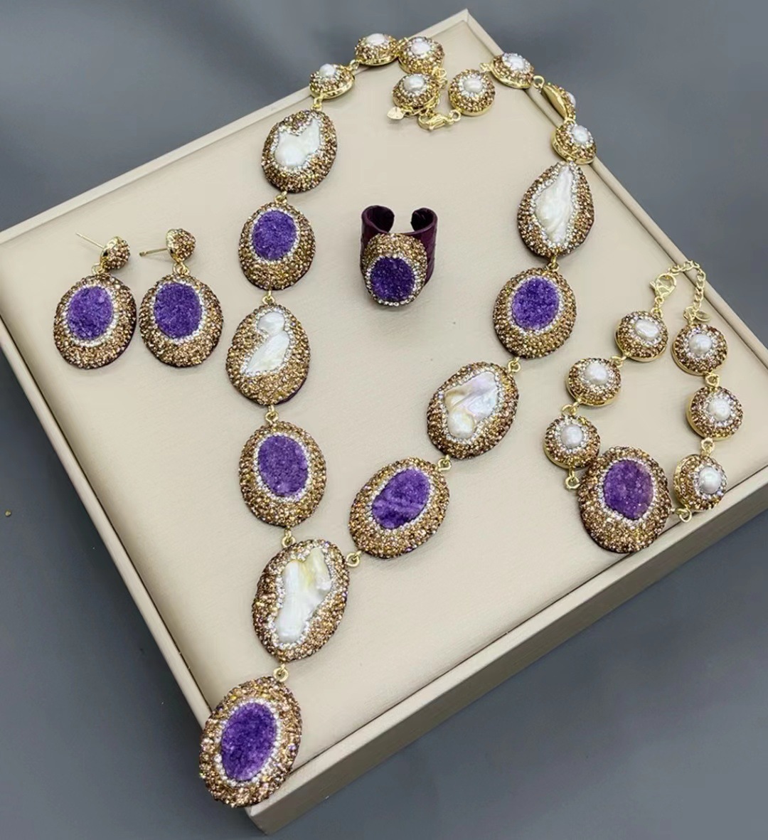 Новый европейский и американский трансграничный натуральный кристалл Зубы барокко Жемчуг Костюм Браслет Серьги геометрический темперамент универсальная оптовая продажа