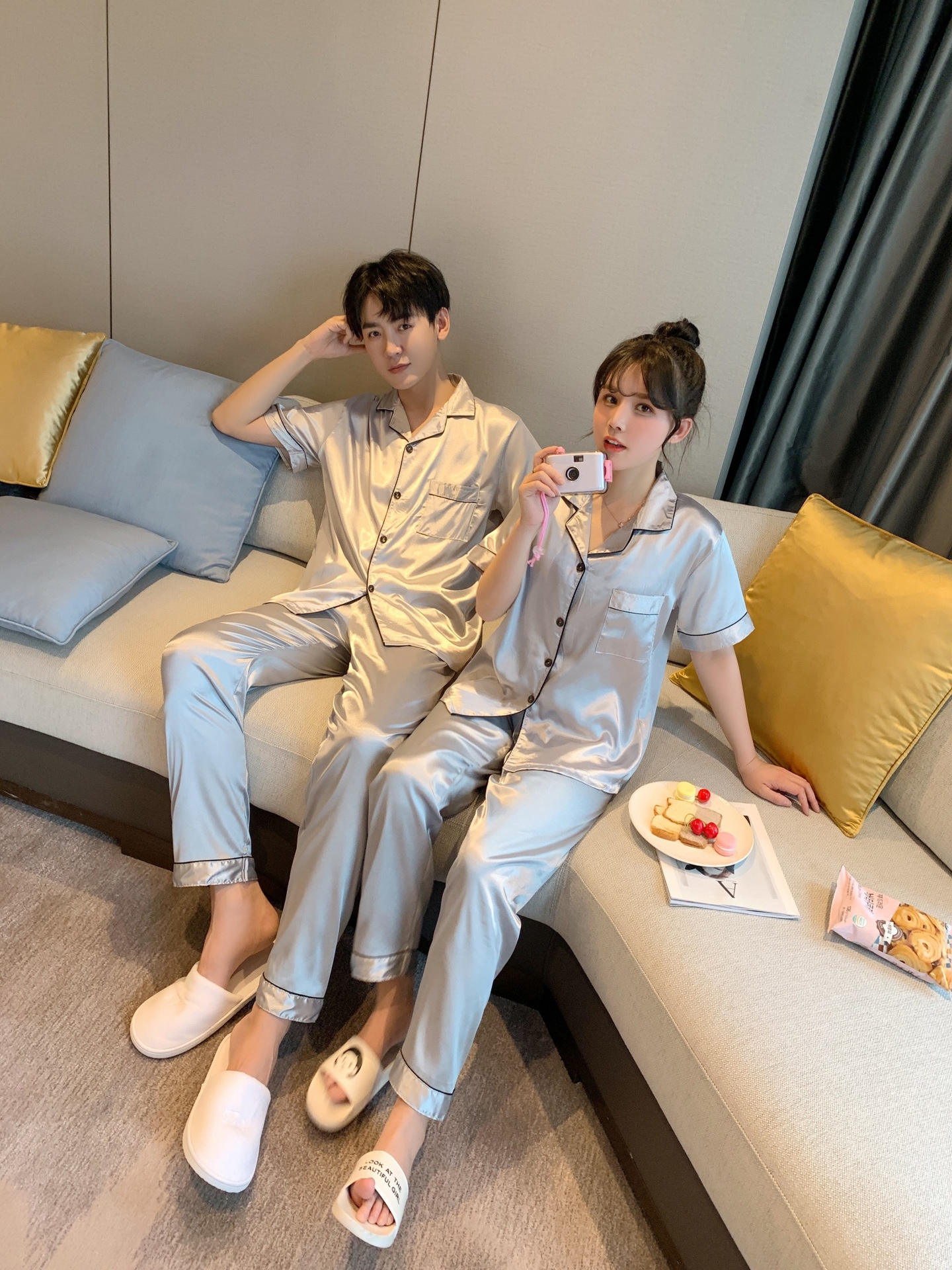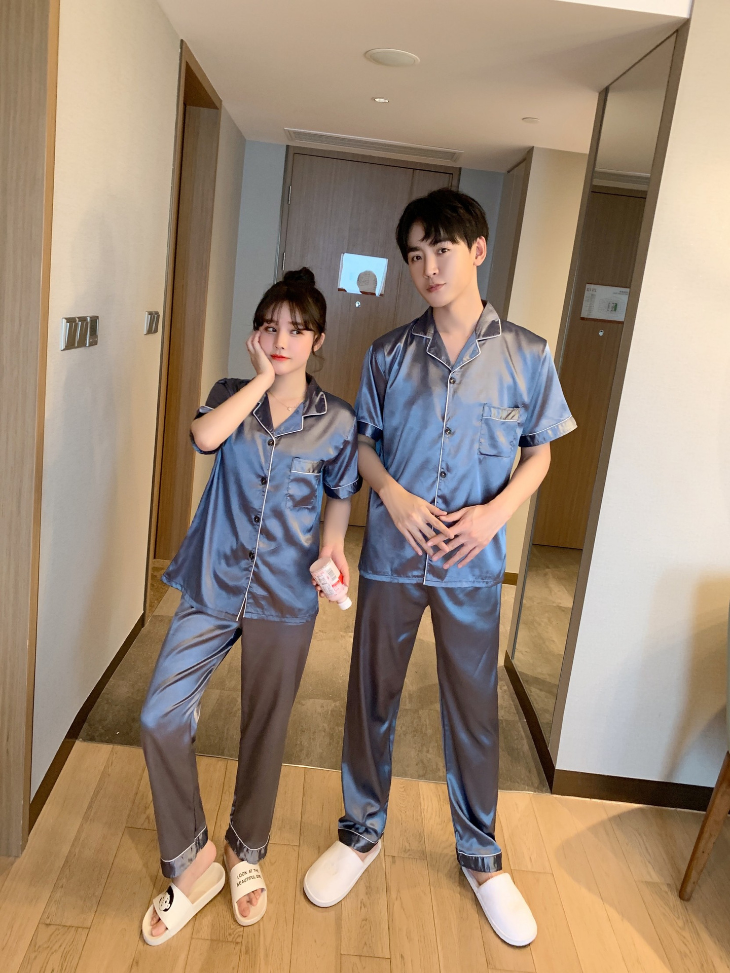 Пижамы для пар из ледяного шелка, летний женский кардиган с длинными рукавами, повседневная свободная весенне-осенняя мужская домашняя одежда больших размеров для людей среднего и молодого возраста