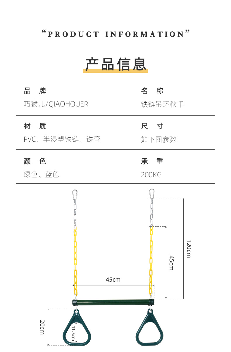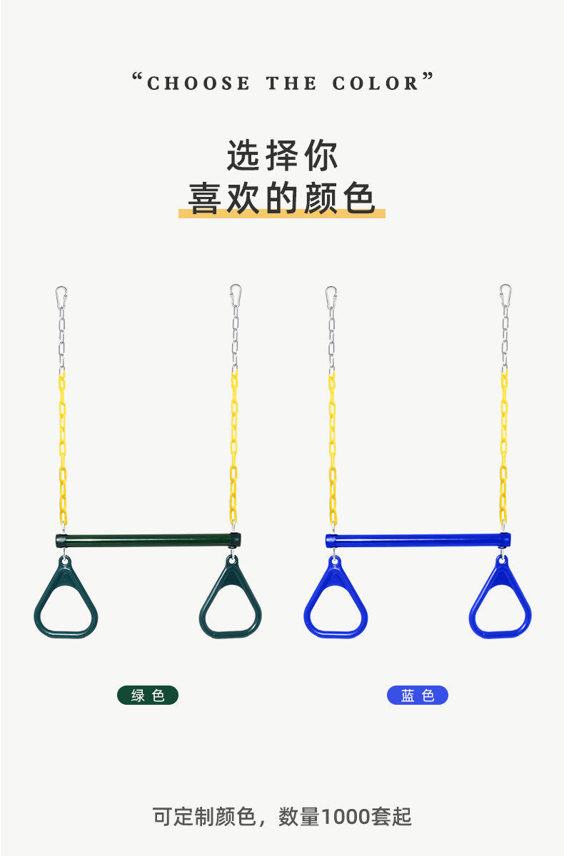 请注意:此链接包含吊环、铁管、环保包塑链条;链条尺寸有:45cm链条、1.2m、1.5m、1.68m链条。默认1.2m链条。