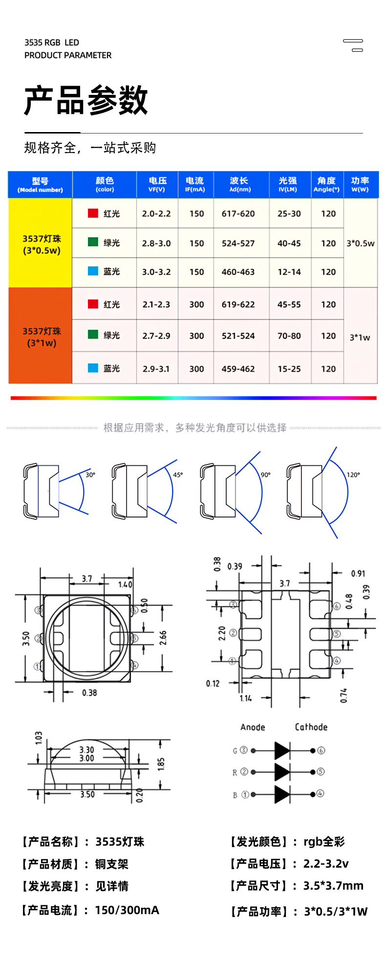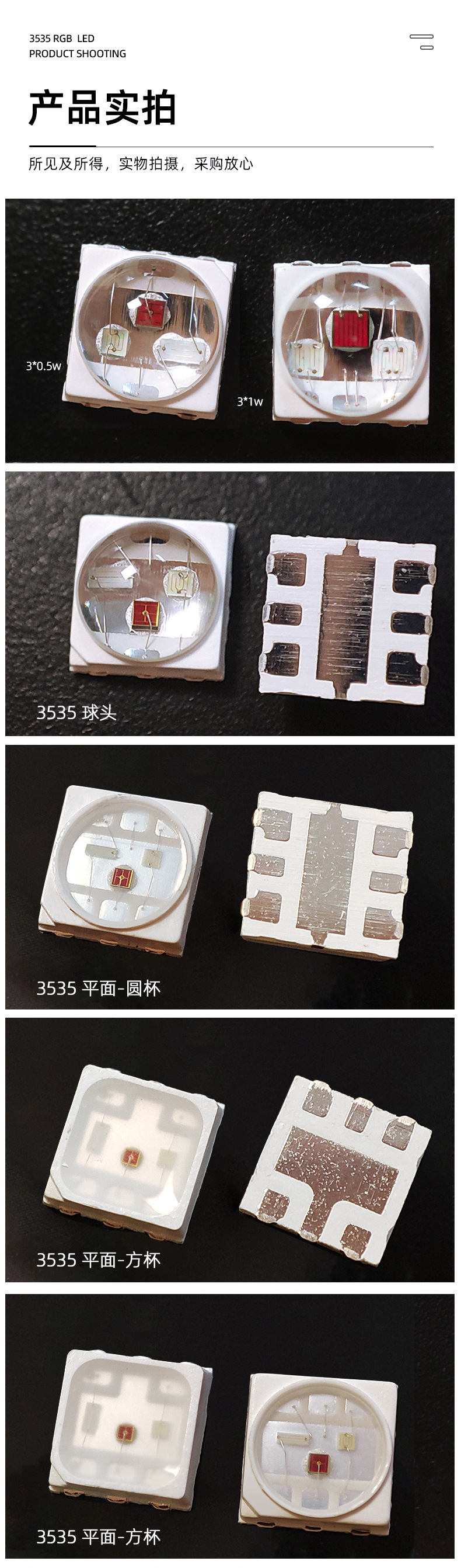3535RGB 1,5 Вт (3*0,5 Вт) шаровая головка; 3535RGB 3W (3*1W) шаровая головка; 3535RGB 1,5 Вт (плоская квадратная чашка); 3535RGB 1,5 Вт (плоская круглая чашка); 3535 красота трехъядерный 520+660+450нм (шаровая головка); 3535 красота трехъядерный 520+590+450нм (шаровая головка); 3535 красота трехъядерный 520+570+450нм (шаровая головка); 3535RGB 3 Вт (3*1 Вт) плоский