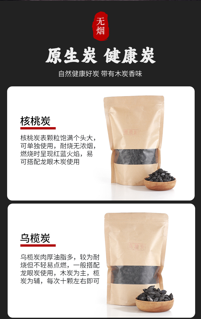 Высококачественный комбинированный уголь (1 кг); Один пакет древесного угля из лонгана (0.5kg упаковка); Мешок оливкового угля (1 кг); Пакет грецкого ореха с углем (1 кг); Мешок миндального угля (1 кг); Сумка с древесным углем мармелад (1 кг); Мешок с углем из хризантемы (0.5kg упаковка); Улан угольный мешок (1 кг)