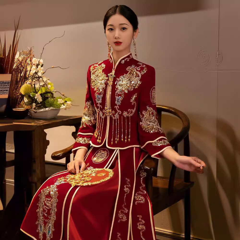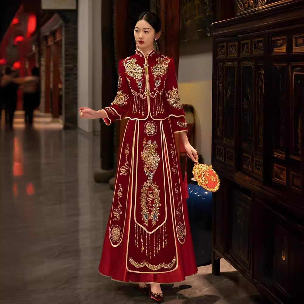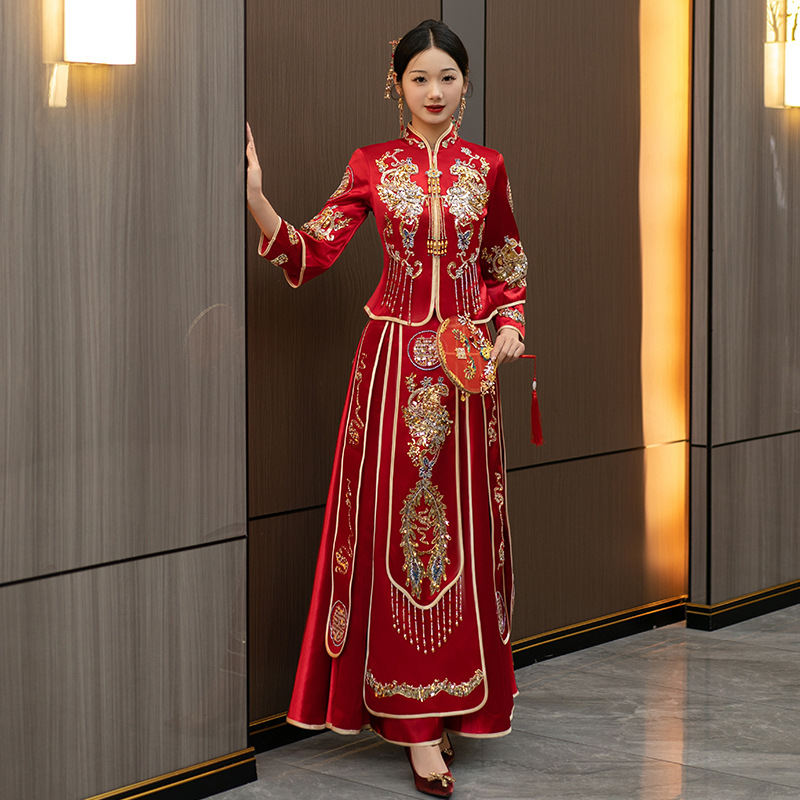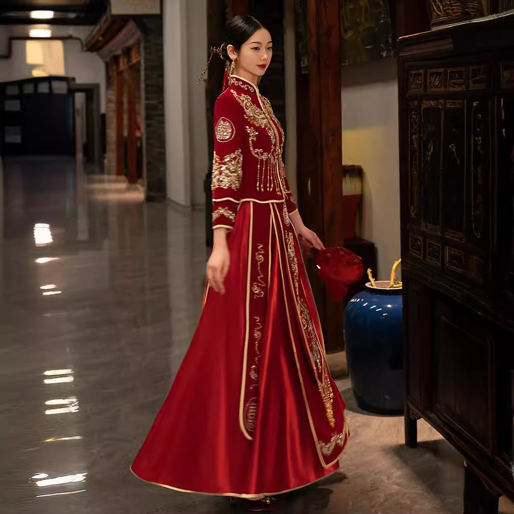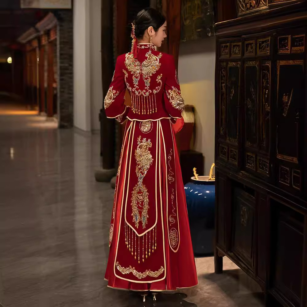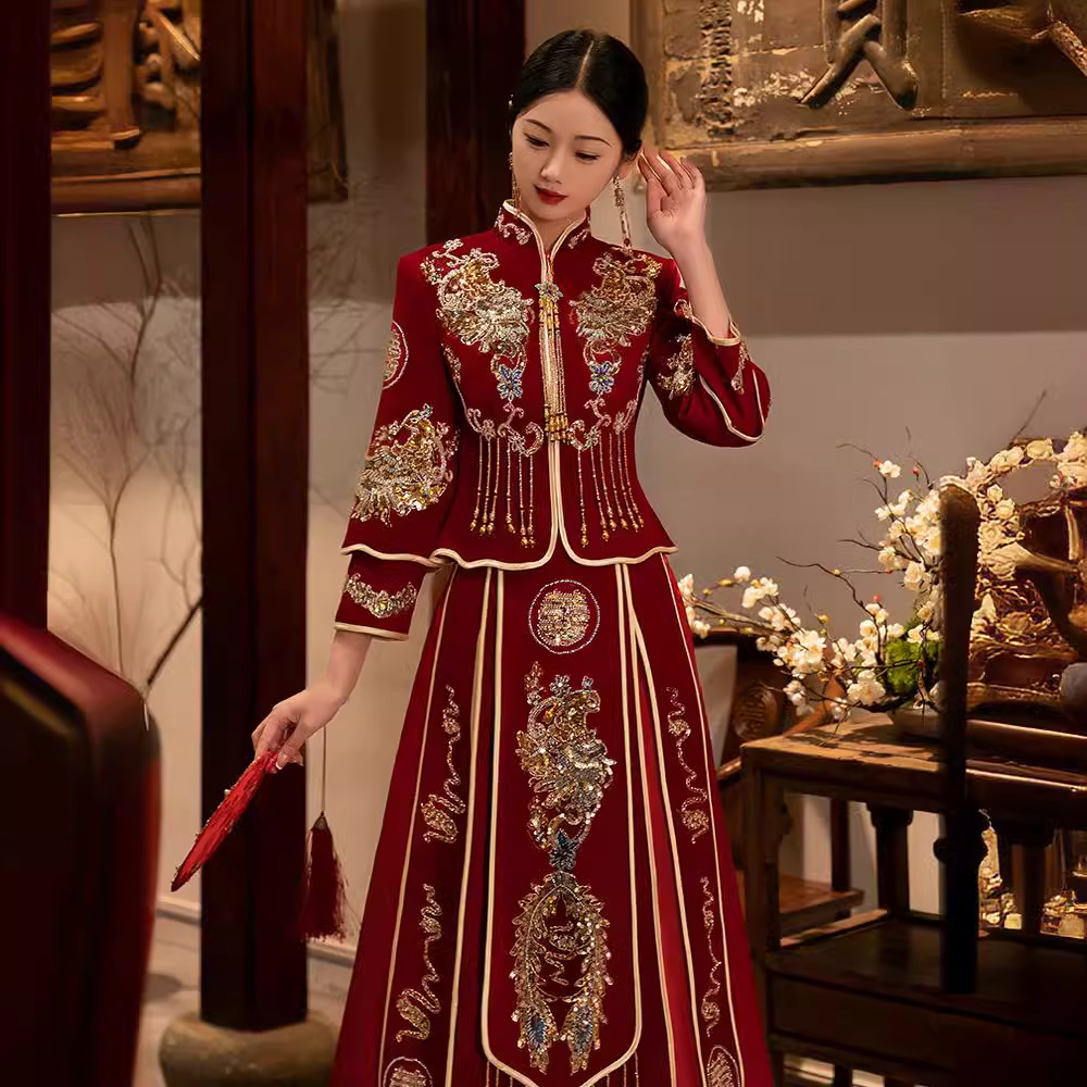 Свадебное платье Xiuhe 2025: Новинка, китайский стиль, с узором дракон и феникс, для невесты, короткое, для женщин