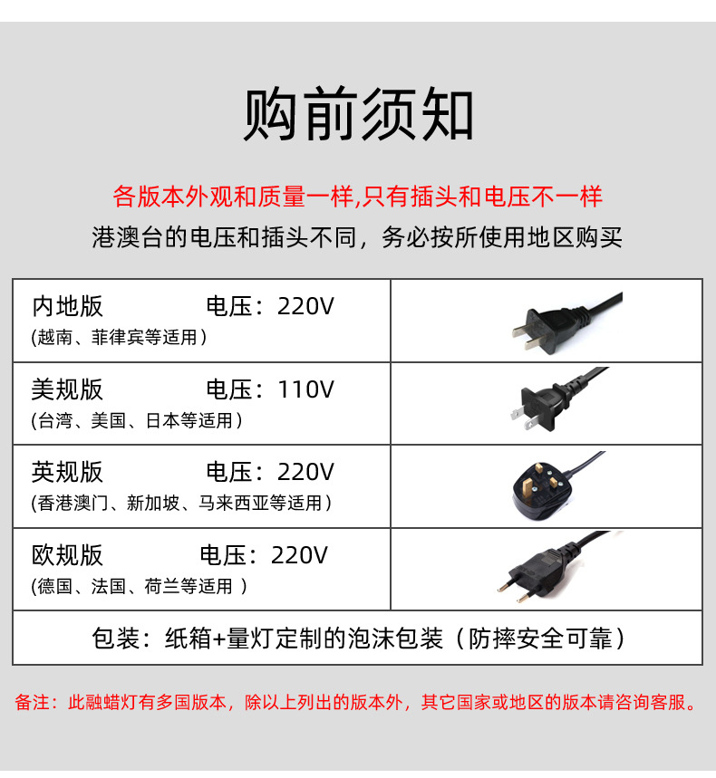 Материковая версия-220В; Версия для США-110 В~120 В; Тайваньская версия-110В; Британская версия-220В; Европейская версия-220В; Японская версия-110В; Австралийская версия-220В