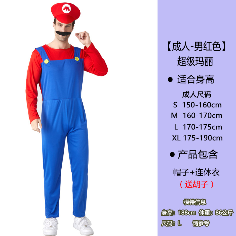 Марио-мальчик красный; Марио-мальчик зеленый; Марио девушка красная; Марио-девушка зеленая; Марио мужчина взрослый красный; Марио мужской взрослый зеленый; Марио женский взрослый красный; Марио женский взрослый зеленый; Марио для мужчин и взрослых красные + перчатки; Марио для мужчин, взрослых, зеленые + перчатки; Марио-Хлопчик красный + перчатки; Зеленые + перчатки Марио для мальчиков
