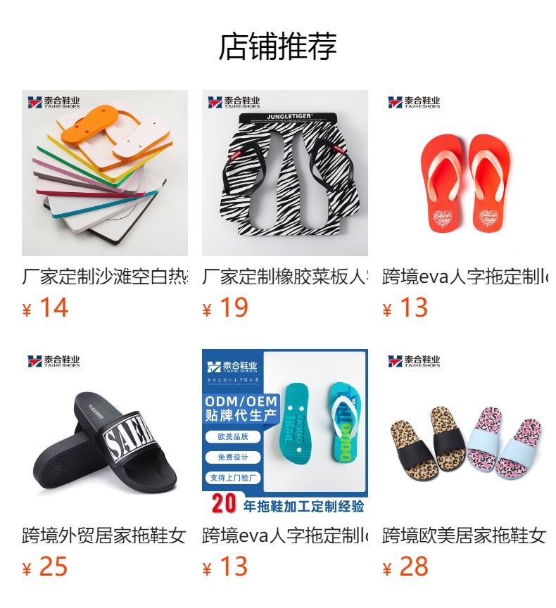 因为定制产品款式众多,具体报价请咨询客服旺旺或电话联系我们!我们一定给您生产具有高品质性价比的人字拖鞋。订货找我,人字拖定制请找准泰合鞋业,厂家直销价格更低!选择EVA、橡胶、PVC等环保材质,专注鞋材发泡技术,产品主要出口欧美、中东、东南亚等国家,均可通过环保检测。