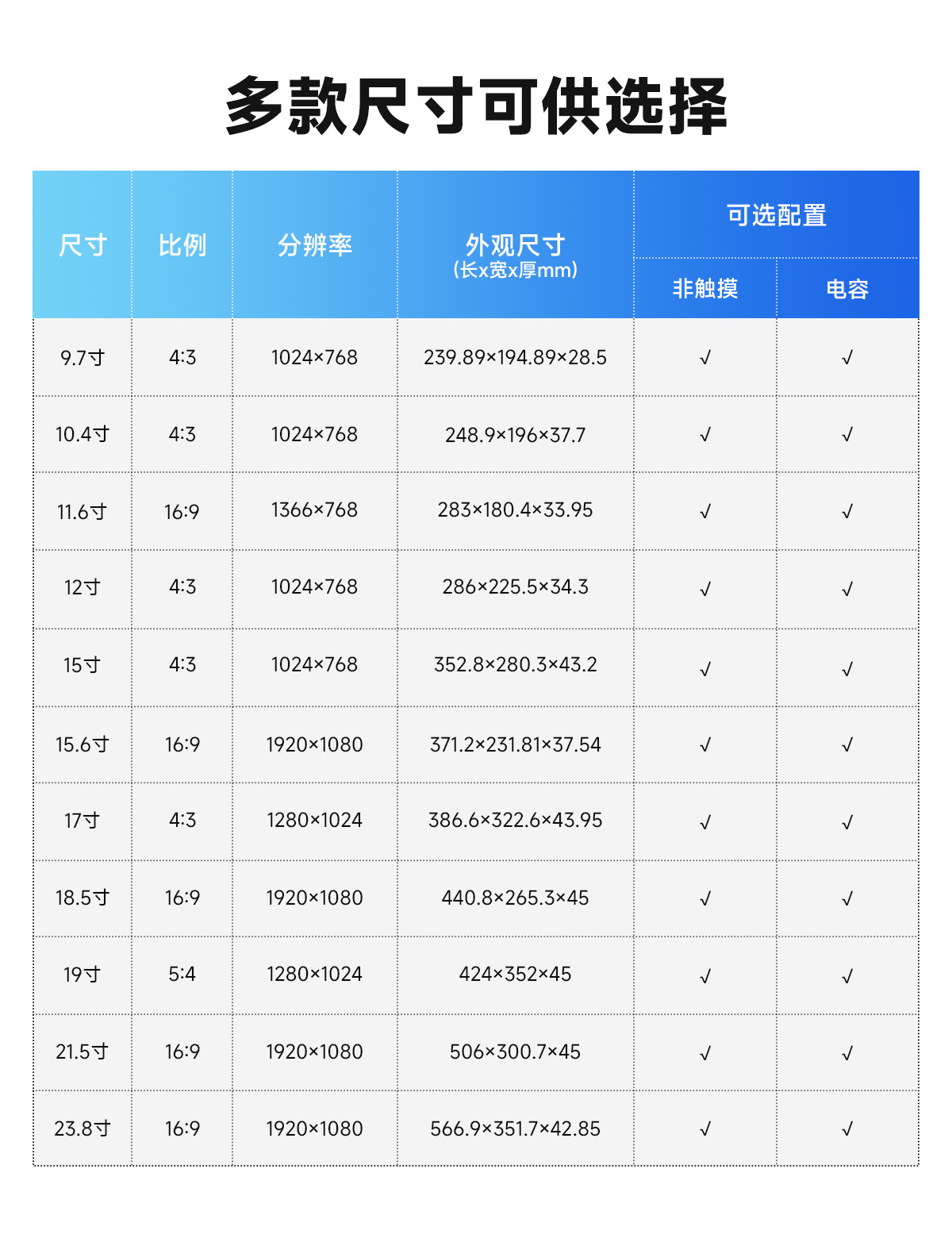 9.7inch -1024×768 (пластиковая основа); 10.4inch -1024×768 (пластиковая основа); 11.6inch -1366×768 (пластиковая основа); 11.6inch -1920×1080 (пластиковая основа); 12inch -1024×768 (пластиковая основа); 15inch -1024×768 (пластиковая основа); 15.6inch -1600×900 (пластиковая основа); 15.6inch -1920×1080 (пластиковая основа); 17inch -1280×1024 (пластиковая основа); 18.5inch -1366×768 (пластиковая основа; 18.5inch -1920×1080 (пластиковая основа); 19inch -1280×1024 (пластиковая основа); 21.5inch -1920×1080 (пластиковая основа); 23.8inch -1920×1080 (пластиковая основа); 9.7inch -1024×768 (металлическая основа); 10.4inch -1024×768 (металлическая основа); 11.6inch -1366×768 (металлическая основа); 11.6inch -1920×1080 (металлическая основа); 12inch -1024×768 (металлическая основа); 15inch -1024×768 (металлическая основа); 15.6inch -1600×900 (металлическая основа); 15.6inch -1920×1080 (металлическая основа); 17inch -1280×1024 (металлическая основа); 18.5inch -1366×768 (металлическая основа); 18.5inch -1920×1080 (металлическая основа); 19inch -1280×1024 (металлическая основа); 21.5inch -1920×1080 (металлическая основа); 23.8inch -1920×1080 (металлическая основа)