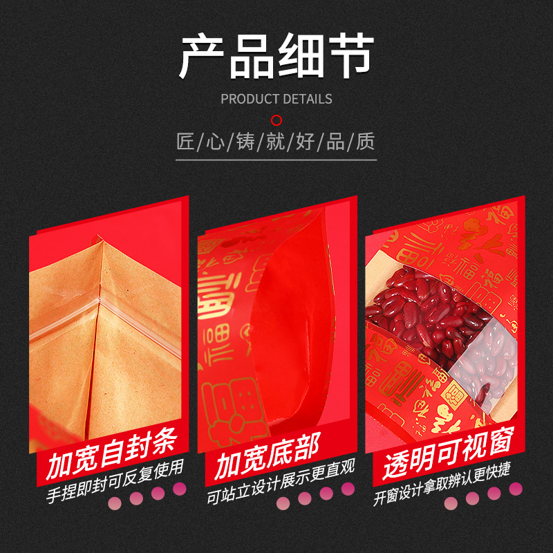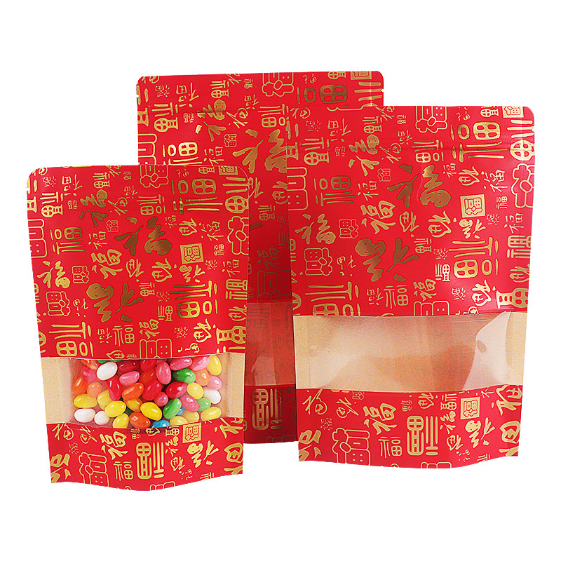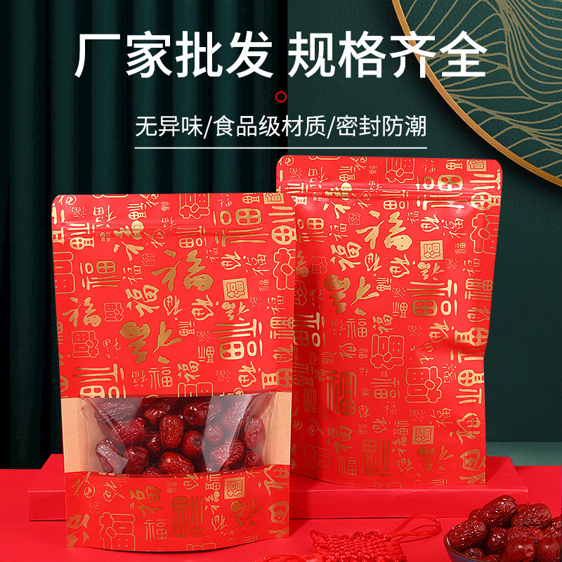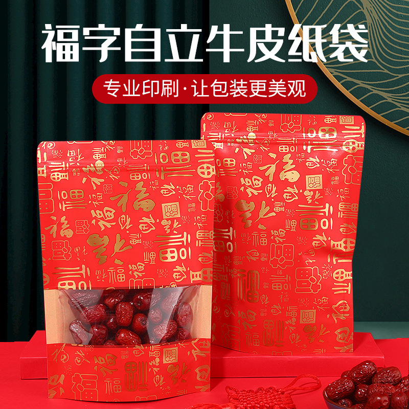 Fu Zi Новогодние товары Happy Bag Крафт-бумага Самоуплотняющиеся пищевые закуски Орехи Сухофрукты Самонесущая упаковочная сумка Красная Герметичная сумка