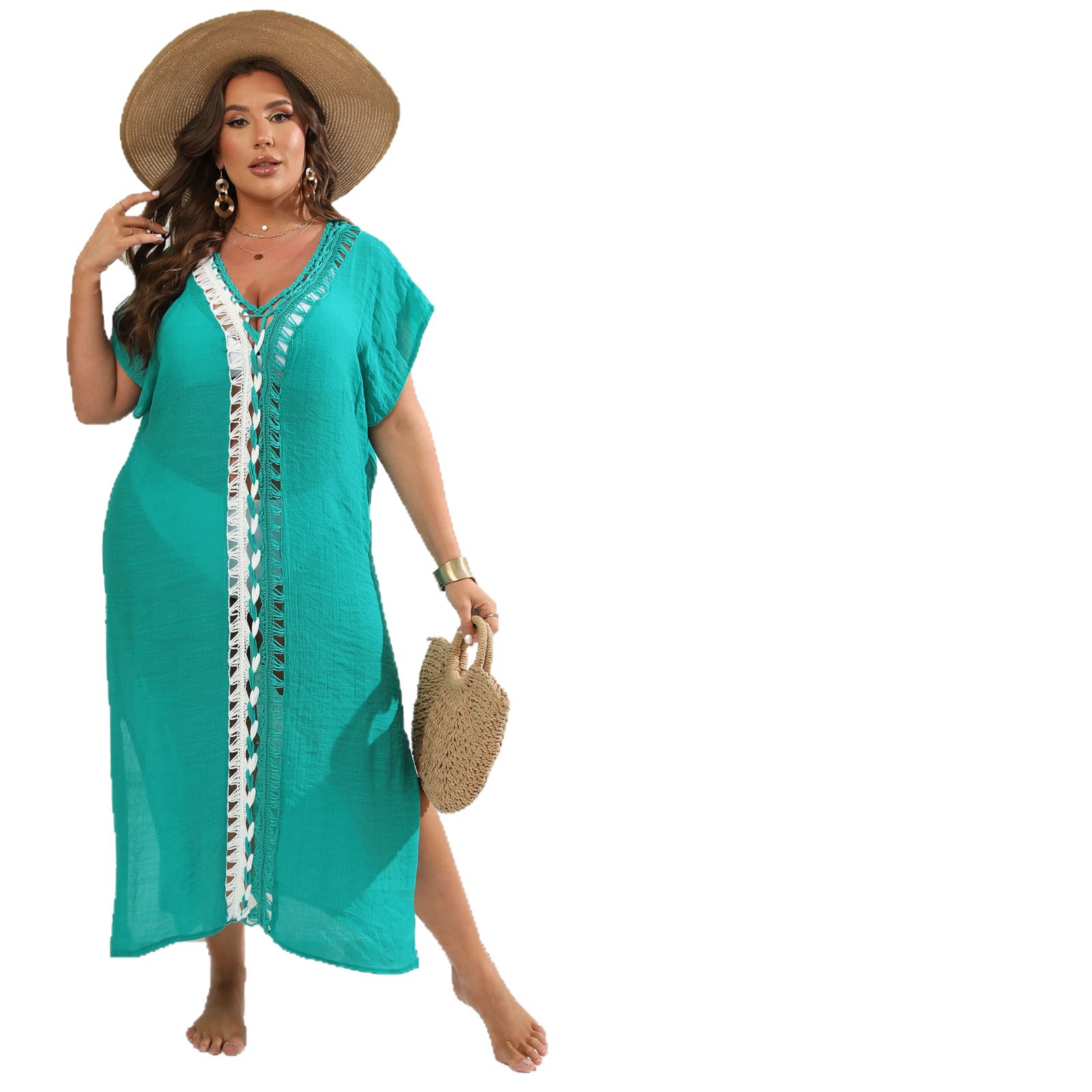 Праздничная пляжная блузка трансграничная Европейская и американская Женская большого размера с крючком, контрастная цветная строчка, платье с глубоким V-образным вырезом 200250