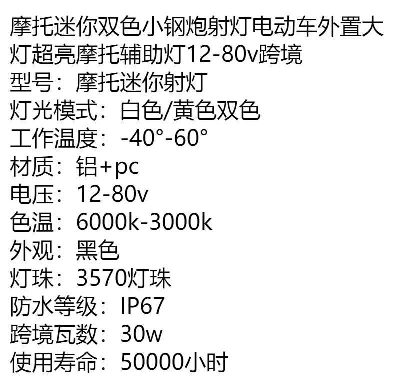 Мотоциклетные мини-двухцветные маленькие стальные Прожекторы для пистолета, Внешние фары для электромобилей, супер яркие Вспомогательные фары для мотоциклов, 12-80 В, трансграничные