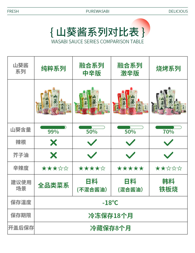 Васаби (содержание ≥ 50%), хрен, растительное масло, вода, пищевая соль, Лактоза, сорбит, ксантановая камедь, лимонно-желтый, ярко-синий, съедобные специи