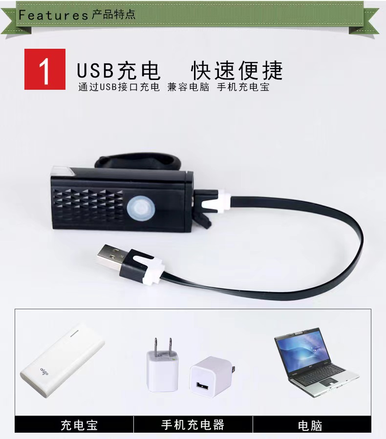 产品配件:前灯+USB数据线+硅胶绑带