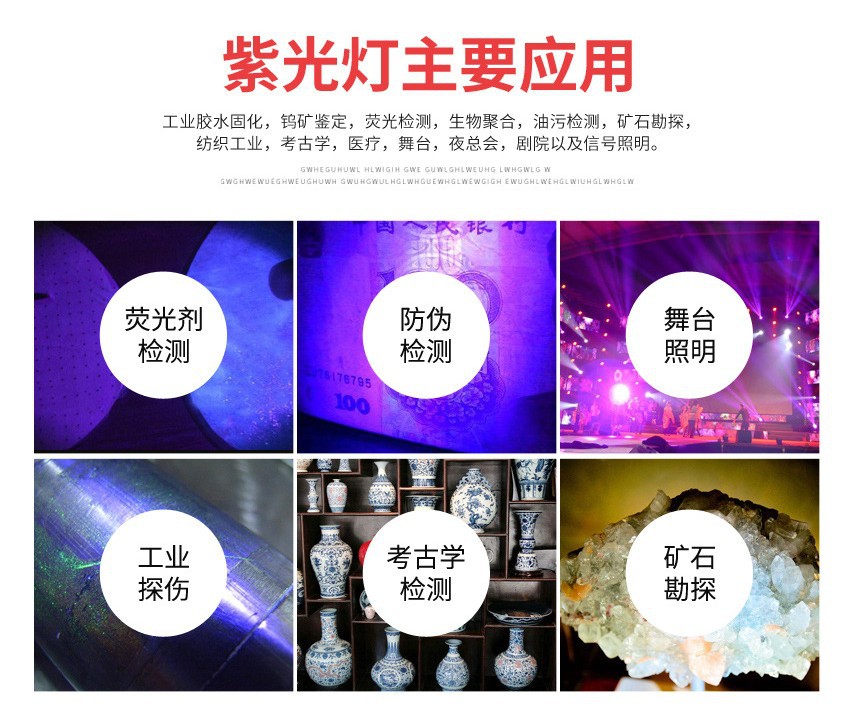 产品特点: 波长为300nm-400nm,波峰值为365nm,具有荧光效应;特殊深蓝色荧光粉,使可见光及有害紫外线,但不会影响发光效果;可吸收可见光,并可透过紫外线,在暗的视线下看得到灯光,故容易识别。