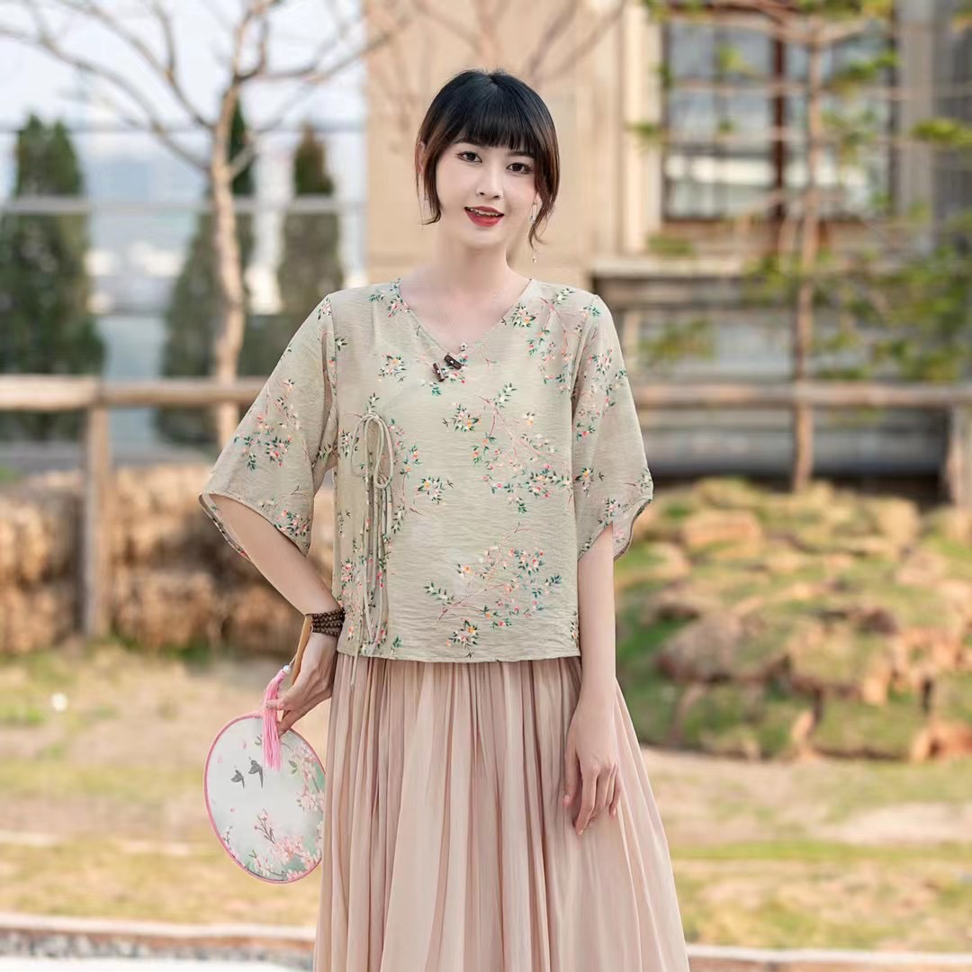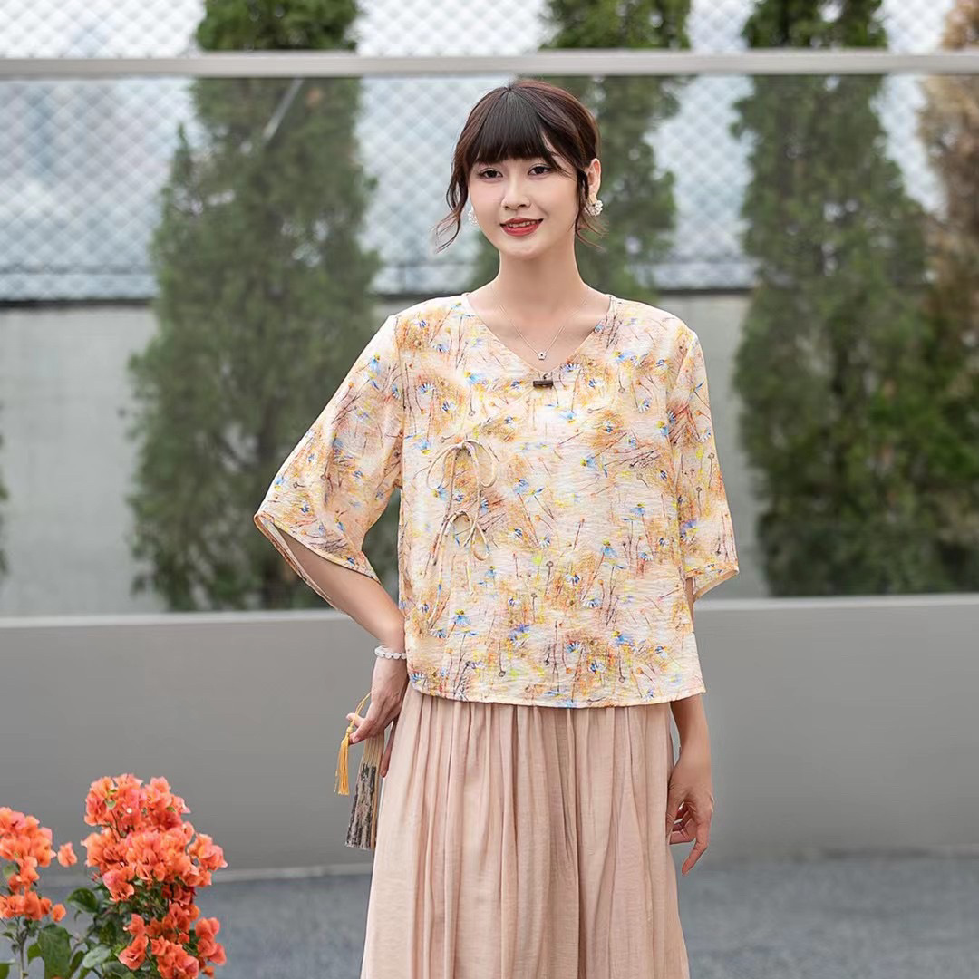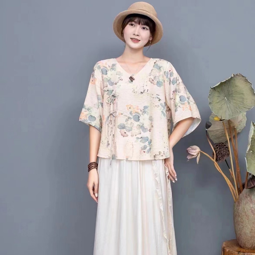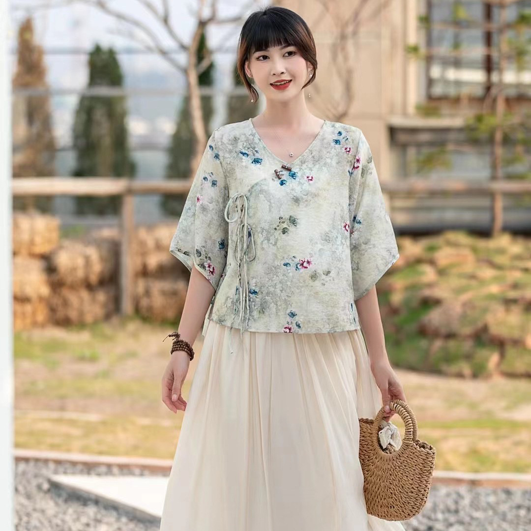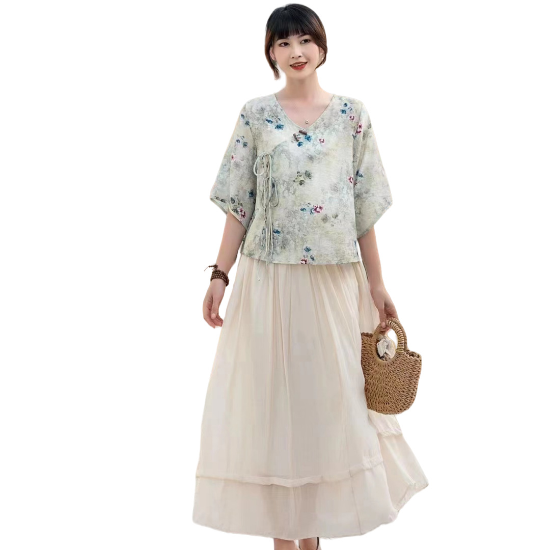 Костюм Hanfu, новинка лета 2024 года, улучшенный хлопковый и льняной костюм с принтом Hanfu, повседневный свободный костюм с юбкой в стиле ретро.