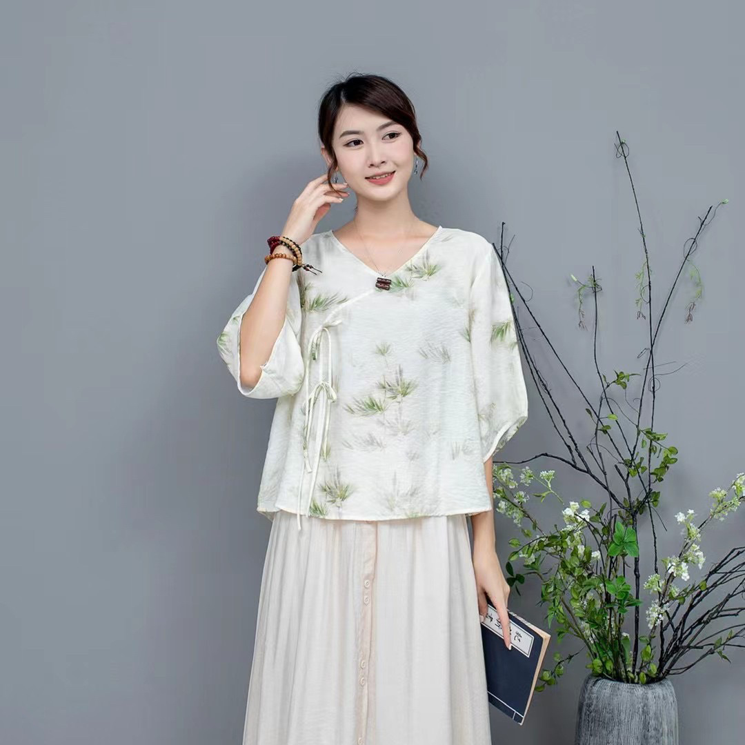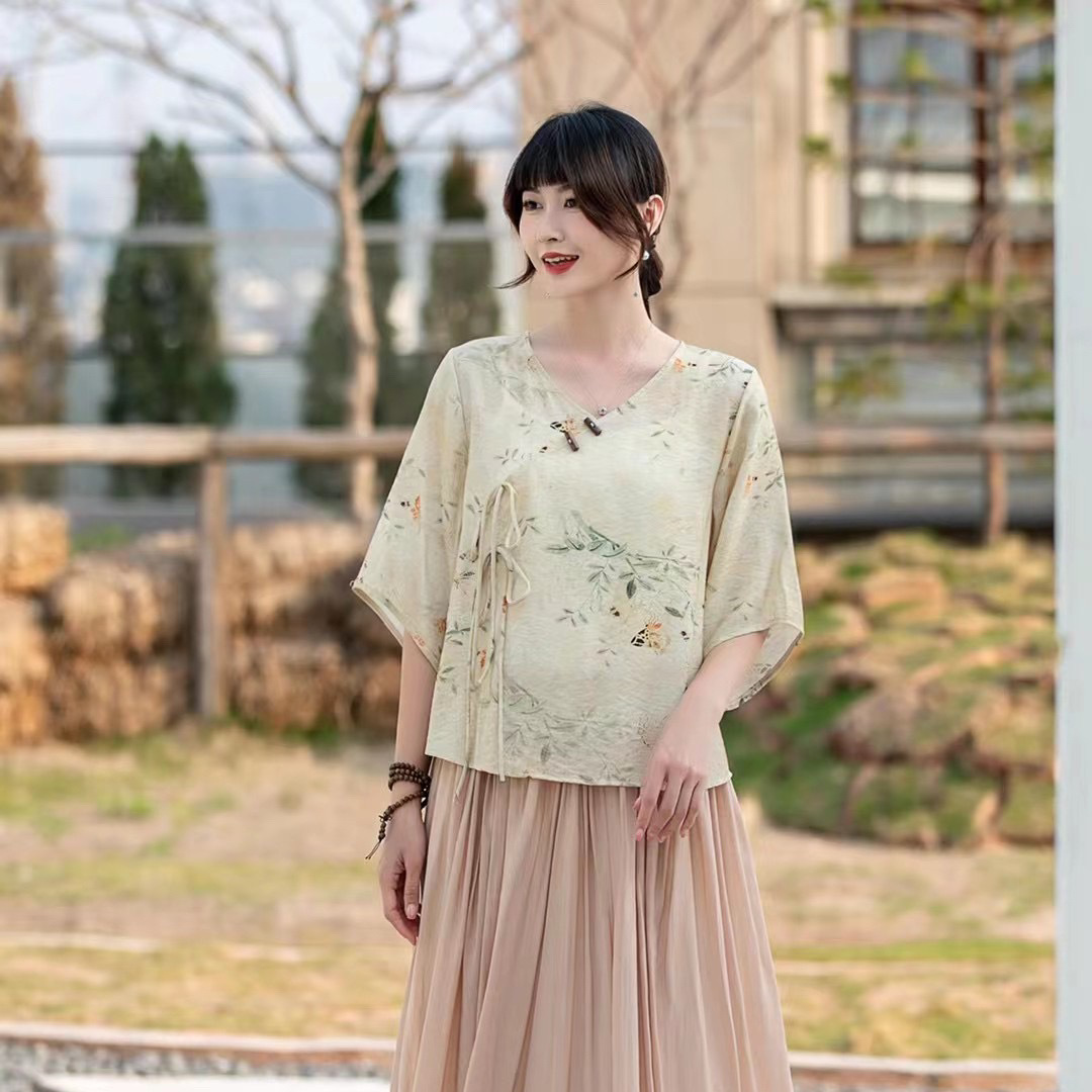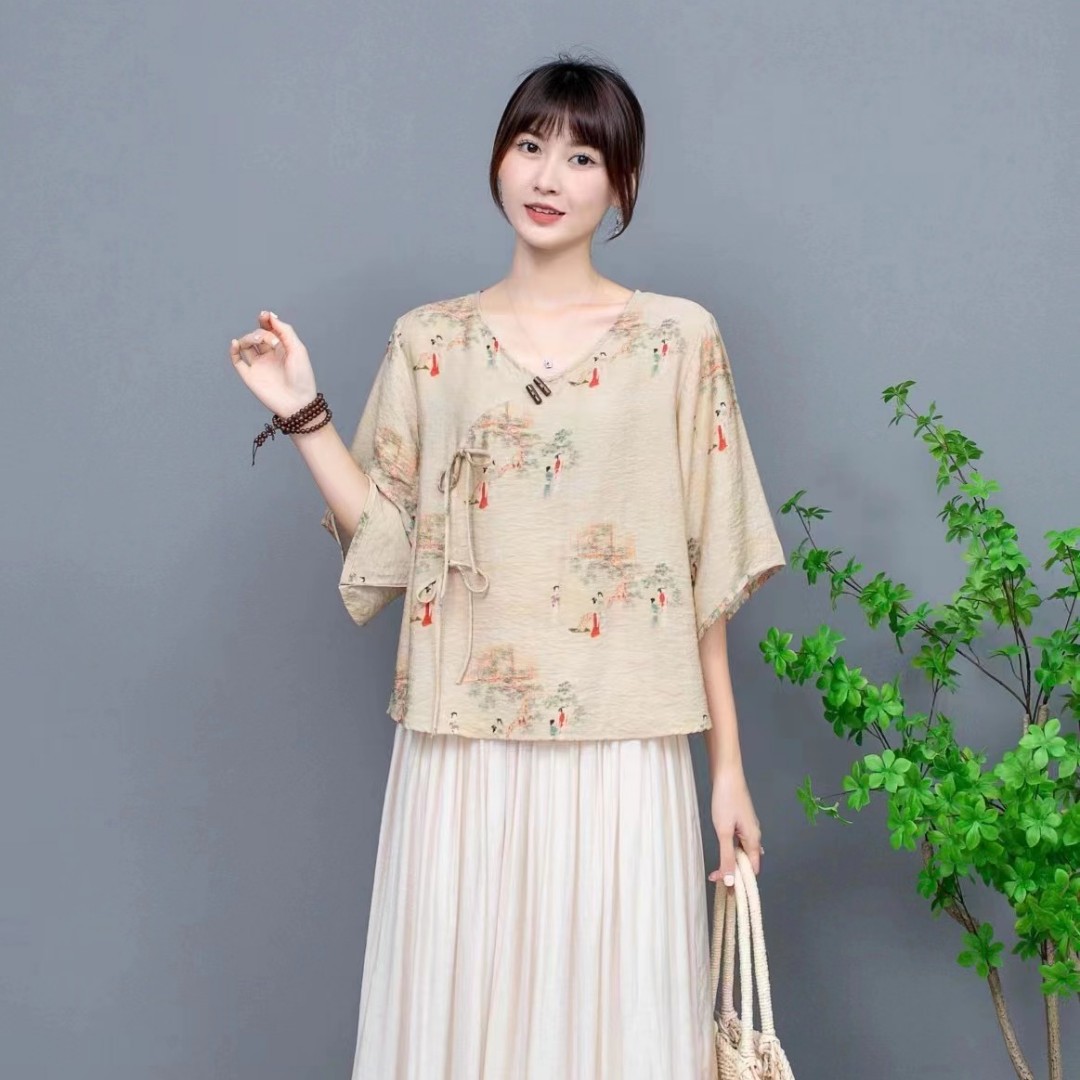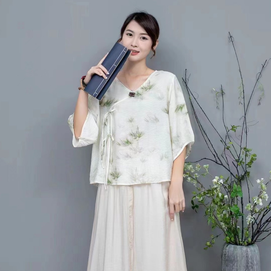 Костюм Hanfu, новинка лета 2024 года, улучшенный хлопковый и льняной костюм с принтом Hanfu, повседневный свободный костюм с юбкой в стиле ретро.