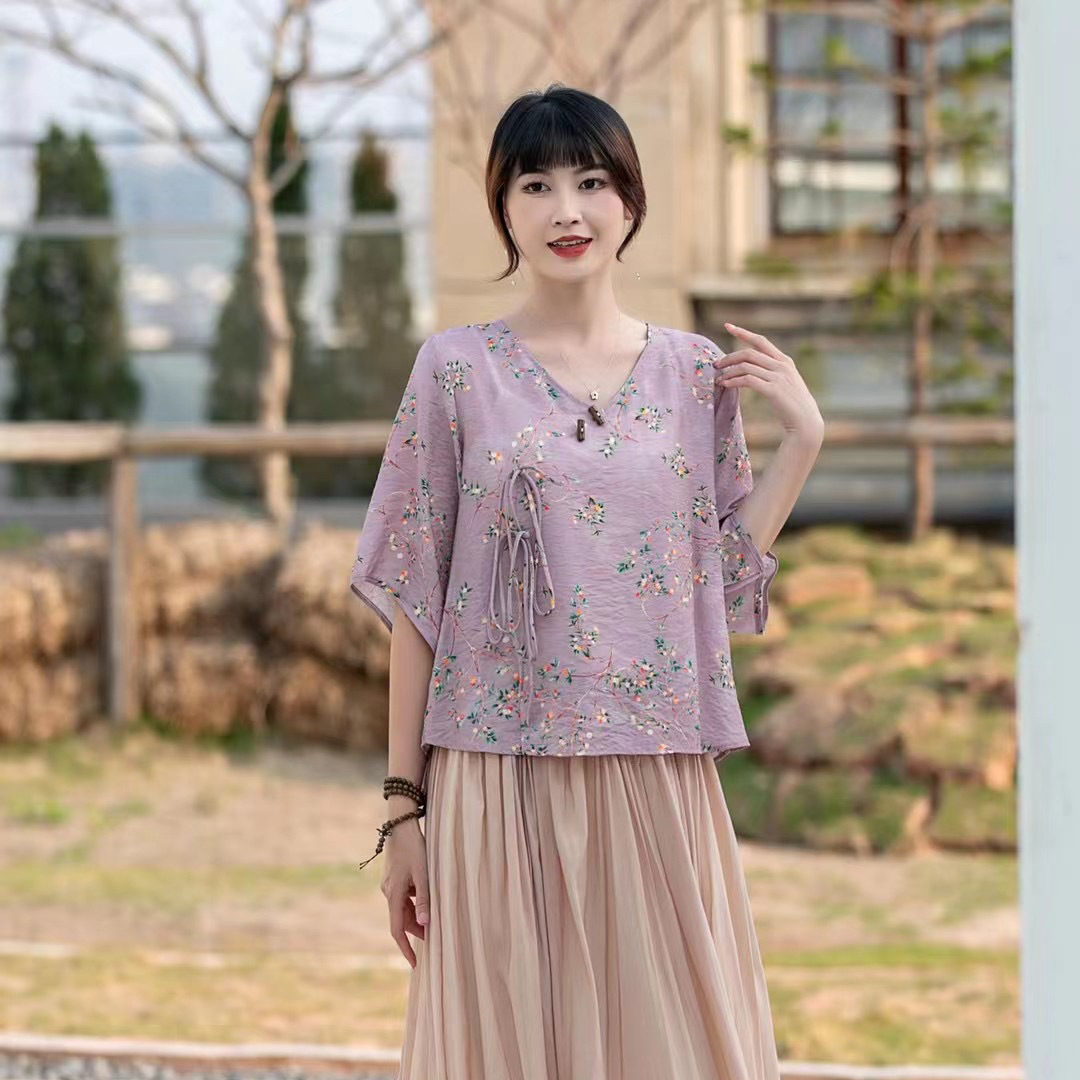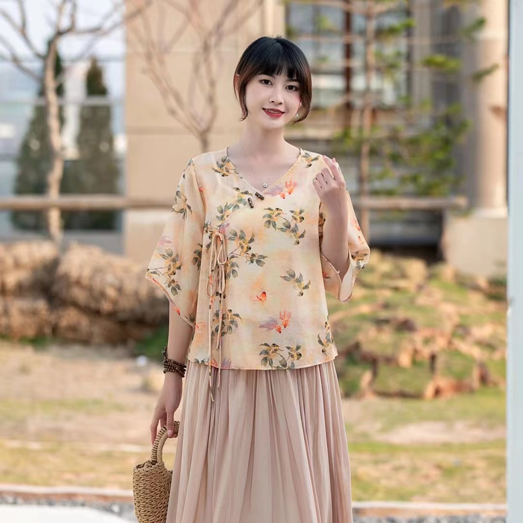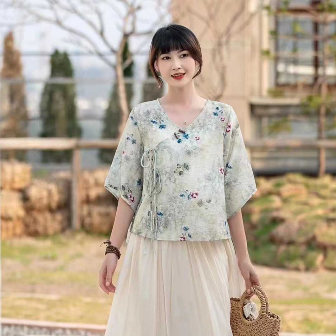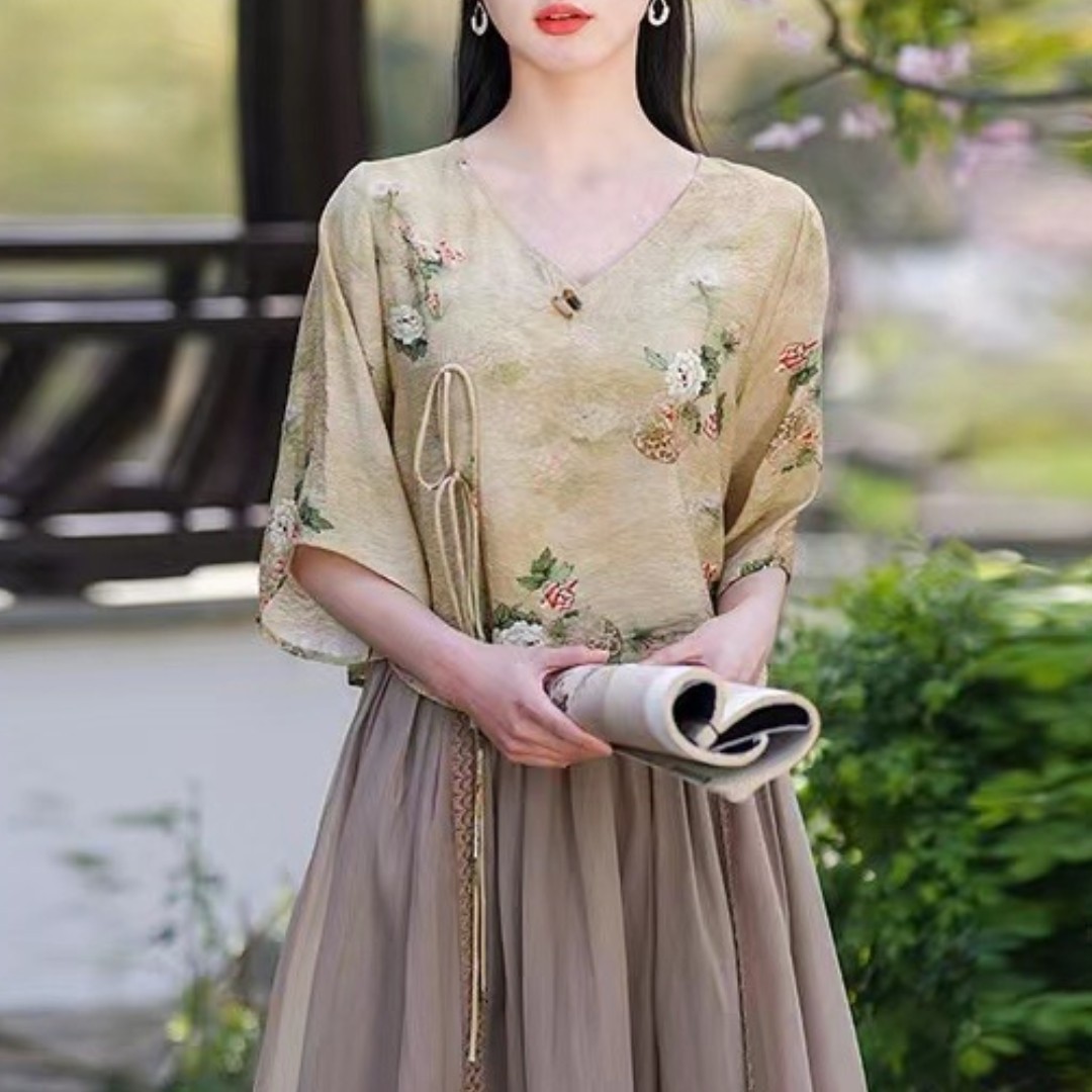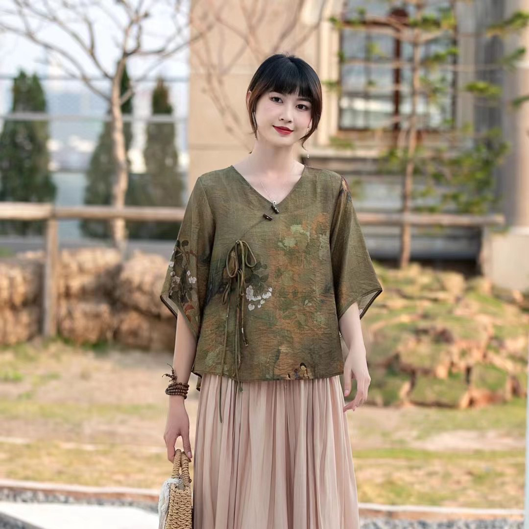 Костюм Hanfu, новинка лета 2024 года, улучшенный хлопковый и льняной костюм с принтом Hanfu, повседневный свободный костюм с юбкой в стиле ретро.