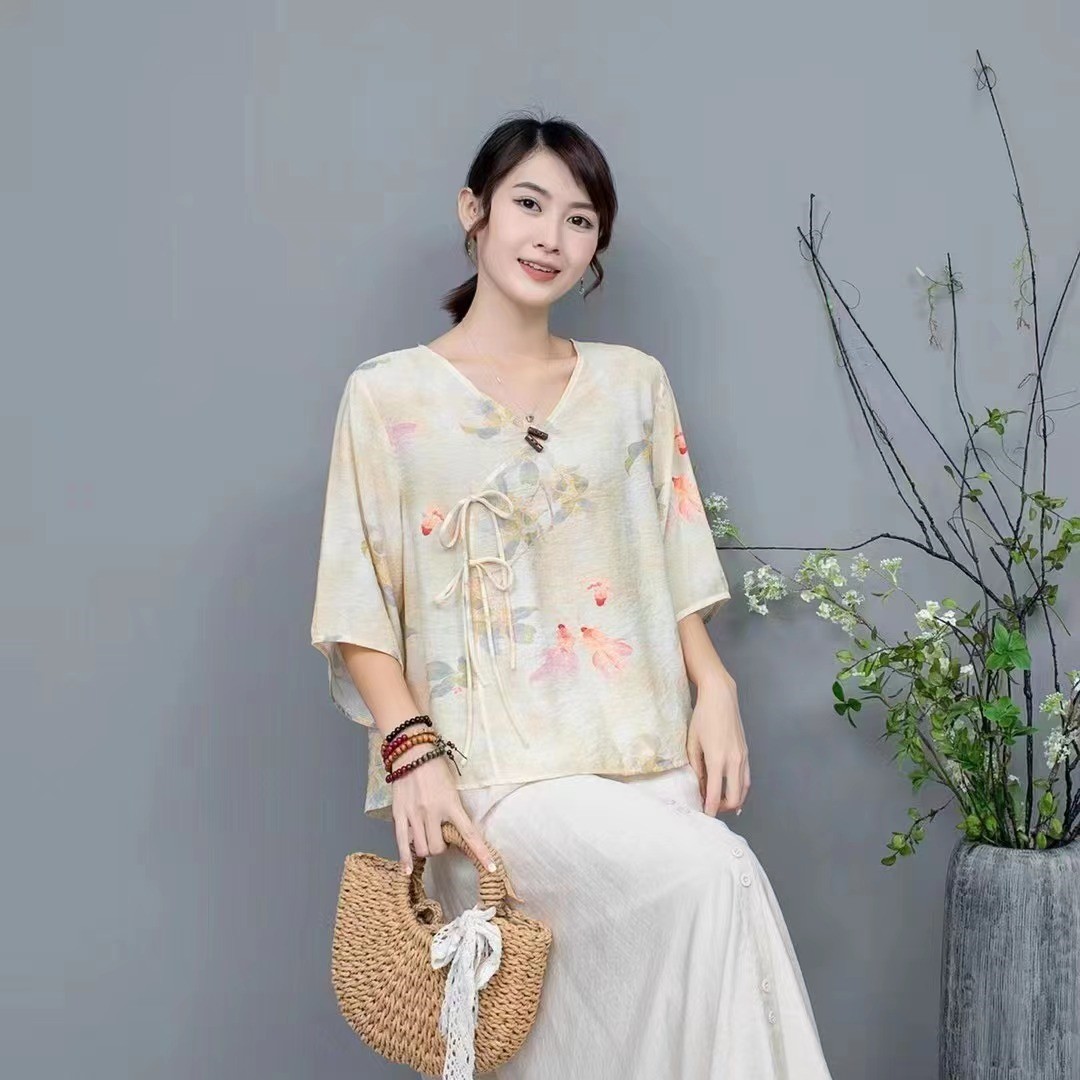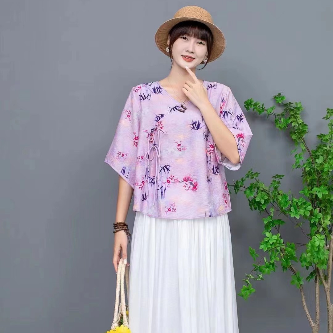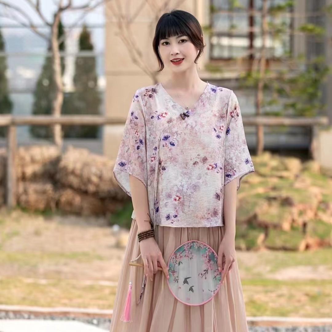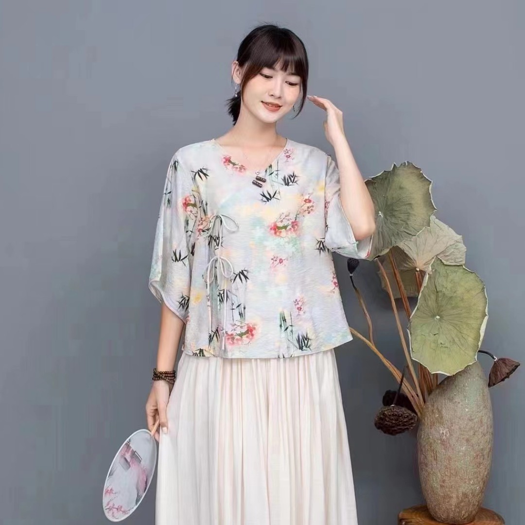 Костюм Hanfu, новинка лета 2024 года, улучшенный хлопковый и льняной костюм с принтом Hanfu, повседневный свободный костюм с юбкой в стиле ретро.
