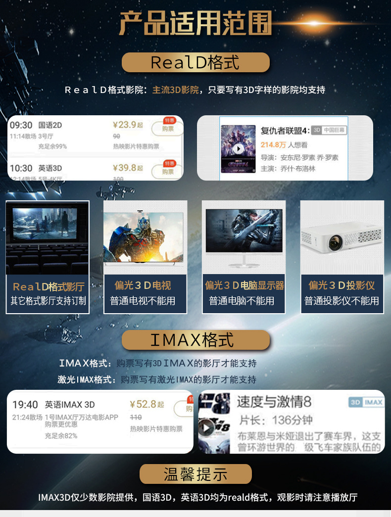 Улучшенный металлический квадрат RealD; IMAX металлический Модернизированный квадрат; RealD металлический модернизированный круглый; IMAX металлический Модернизированный круглый; RealD обычный черный квадрат; Обычный черный квадрат IMAX; RealD обычный черный круглый; IMAX обычный черный круглый; Лазерный IMAX формат Черный квадрат; Прозрачная коробка клип