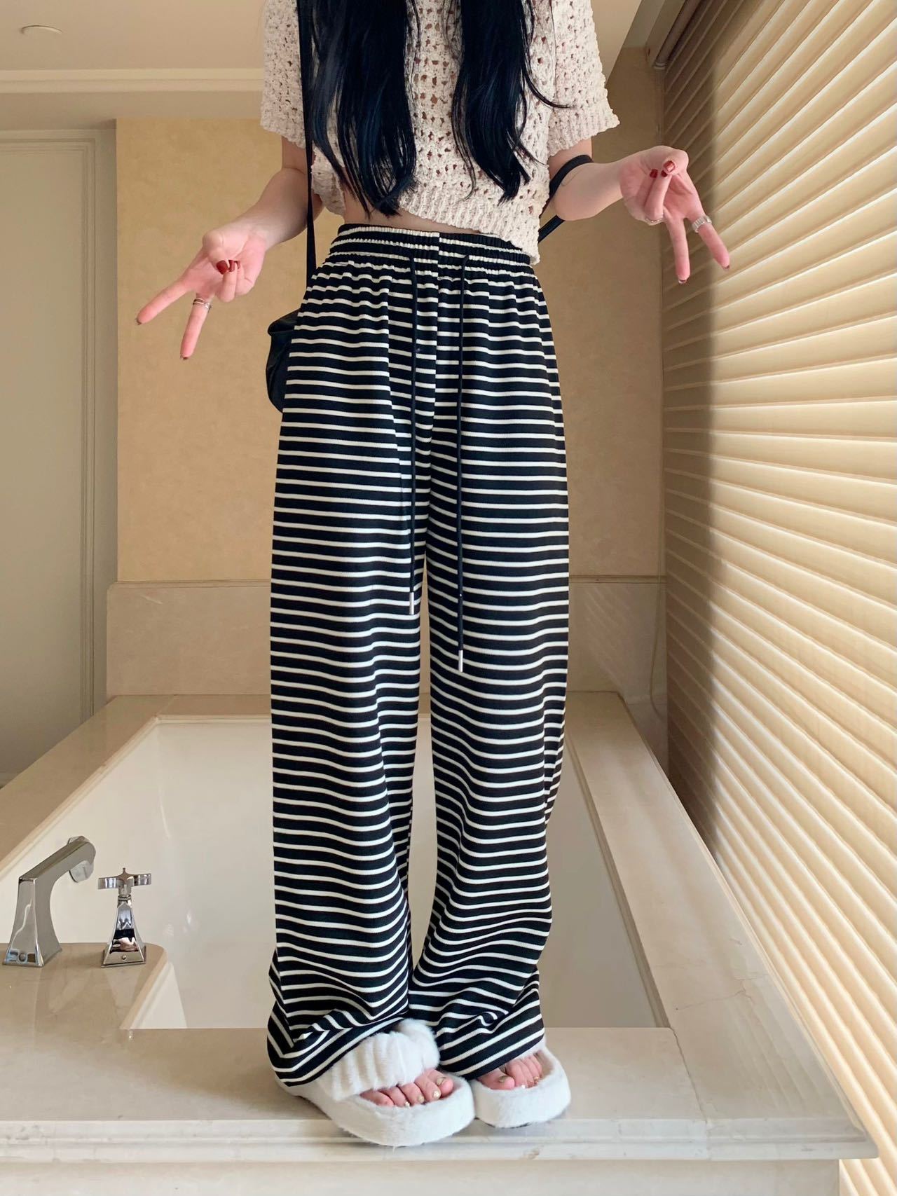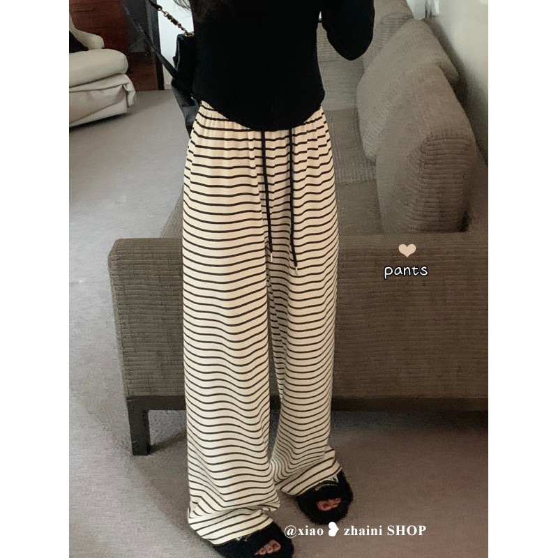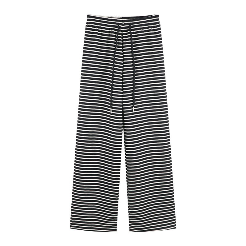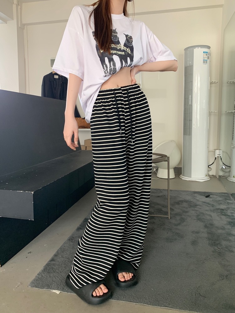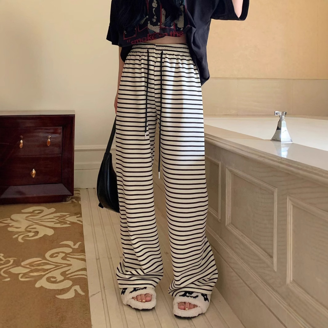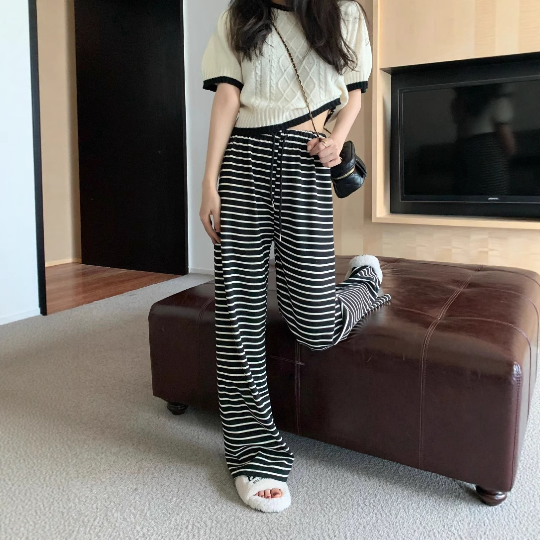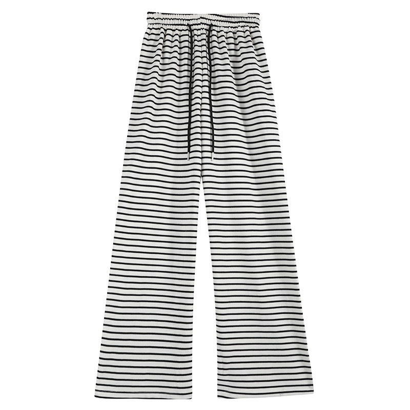 Новые черно-белые легкие эластичные свободные брюки с широкими штанинами в гонконгском стиле в горизонтальную полоску, узкие брюки с драпировкой и высокой талией