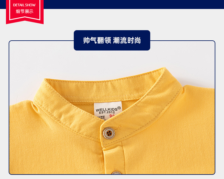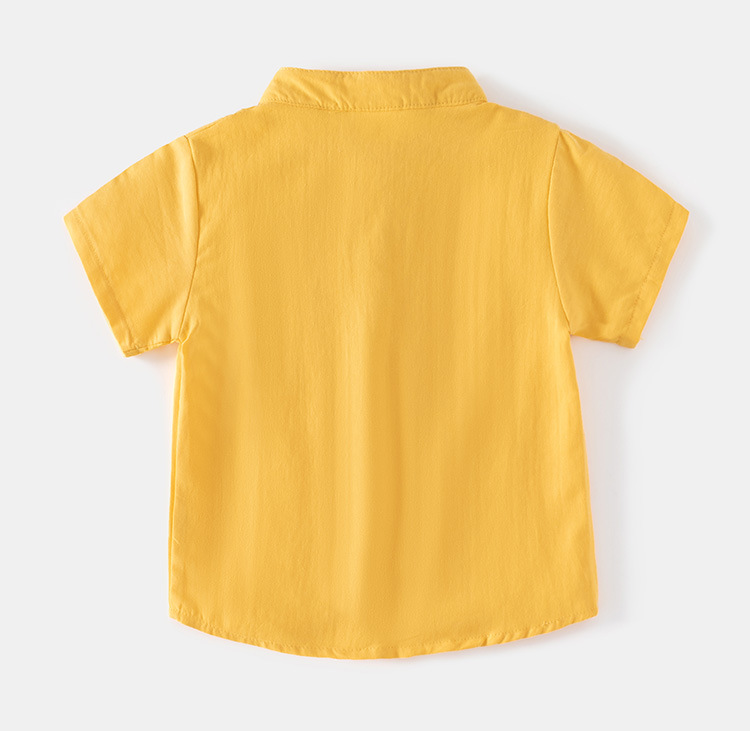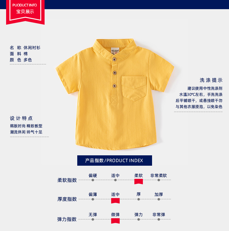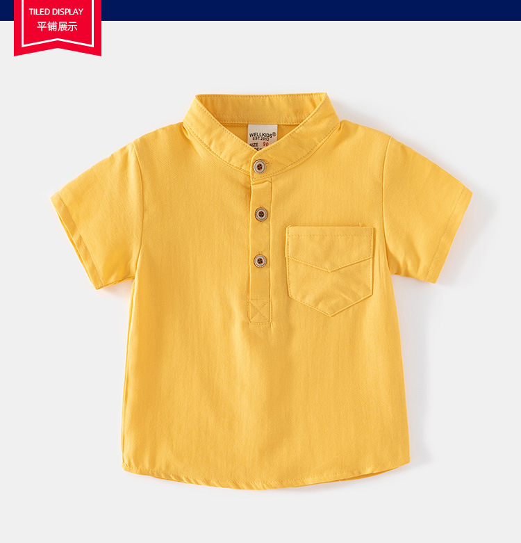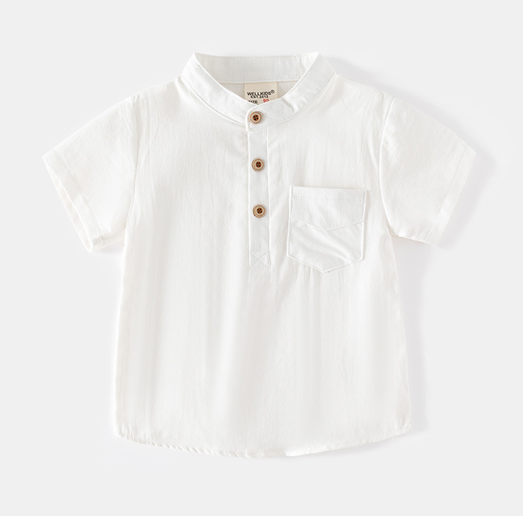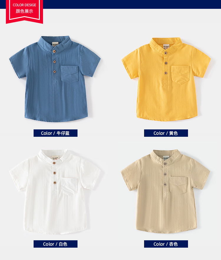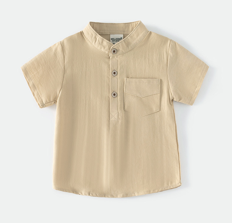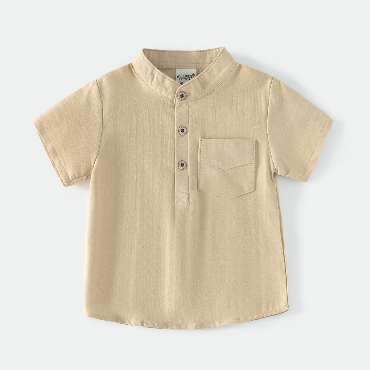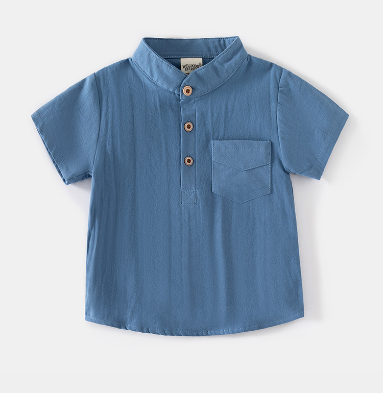 Летняя новинка 2025: хлопковая рубашка для мальчиков с воротником-стойкой, коротким рукавом, повседневного стиля, приятная к телу, комфортная, влагоотводящая