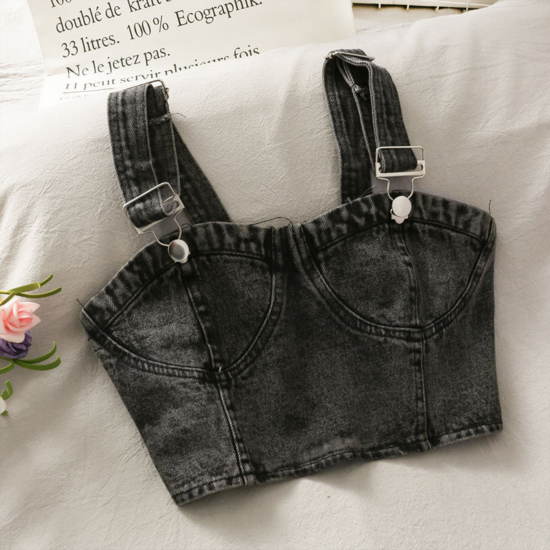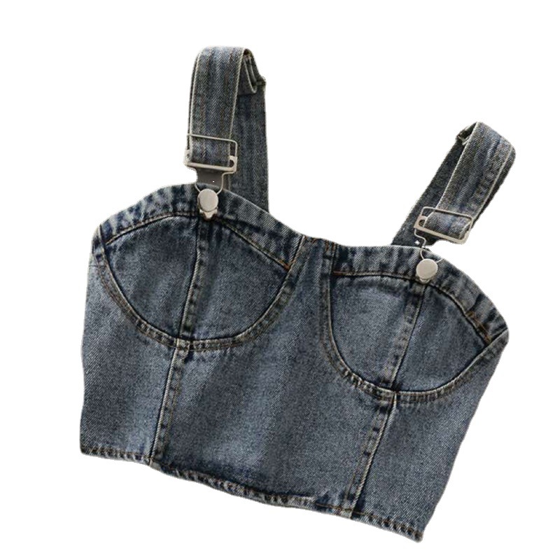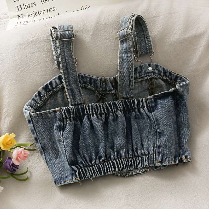Летний короткий пупок для девочек Джинсовая маленькая спинка корейский стиль назад эластичный регулируемый плечевой ремень плиссированный ремешок жилет Мода