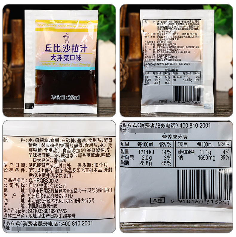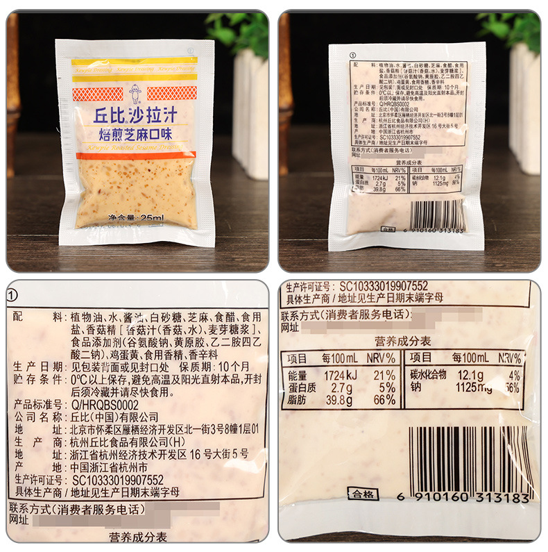配料表:植物油、水、酱油、白砂糖、芝麻、食醋、食用盐、香菇精[香菇汁(香菇、水)、麦芽糖浆]、食品添加剂(谷氨酸钠、黄原胶、乙二胺四乙酸二钠)、鸡蛋黄、食用香精、香辛料等,以产品外包装实际信息为准。
