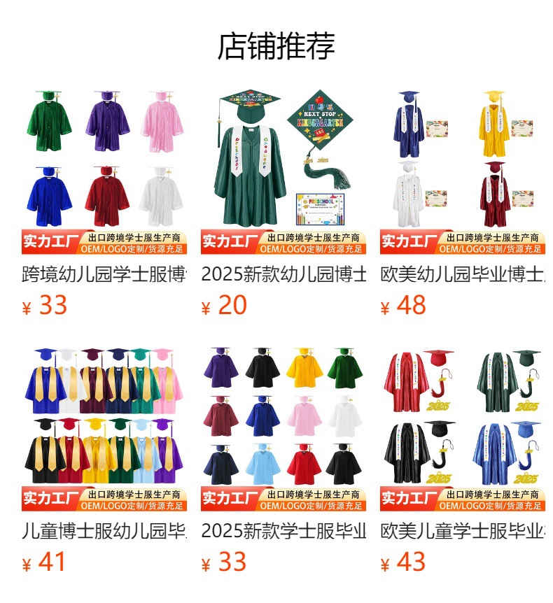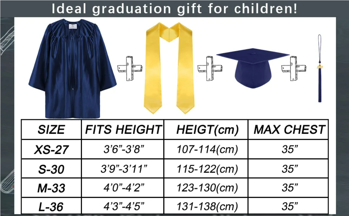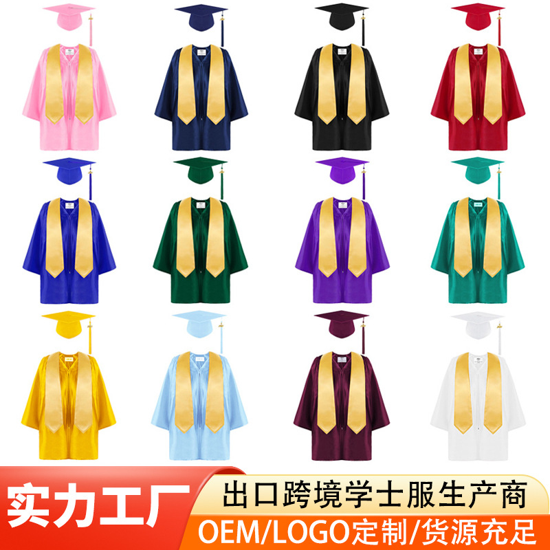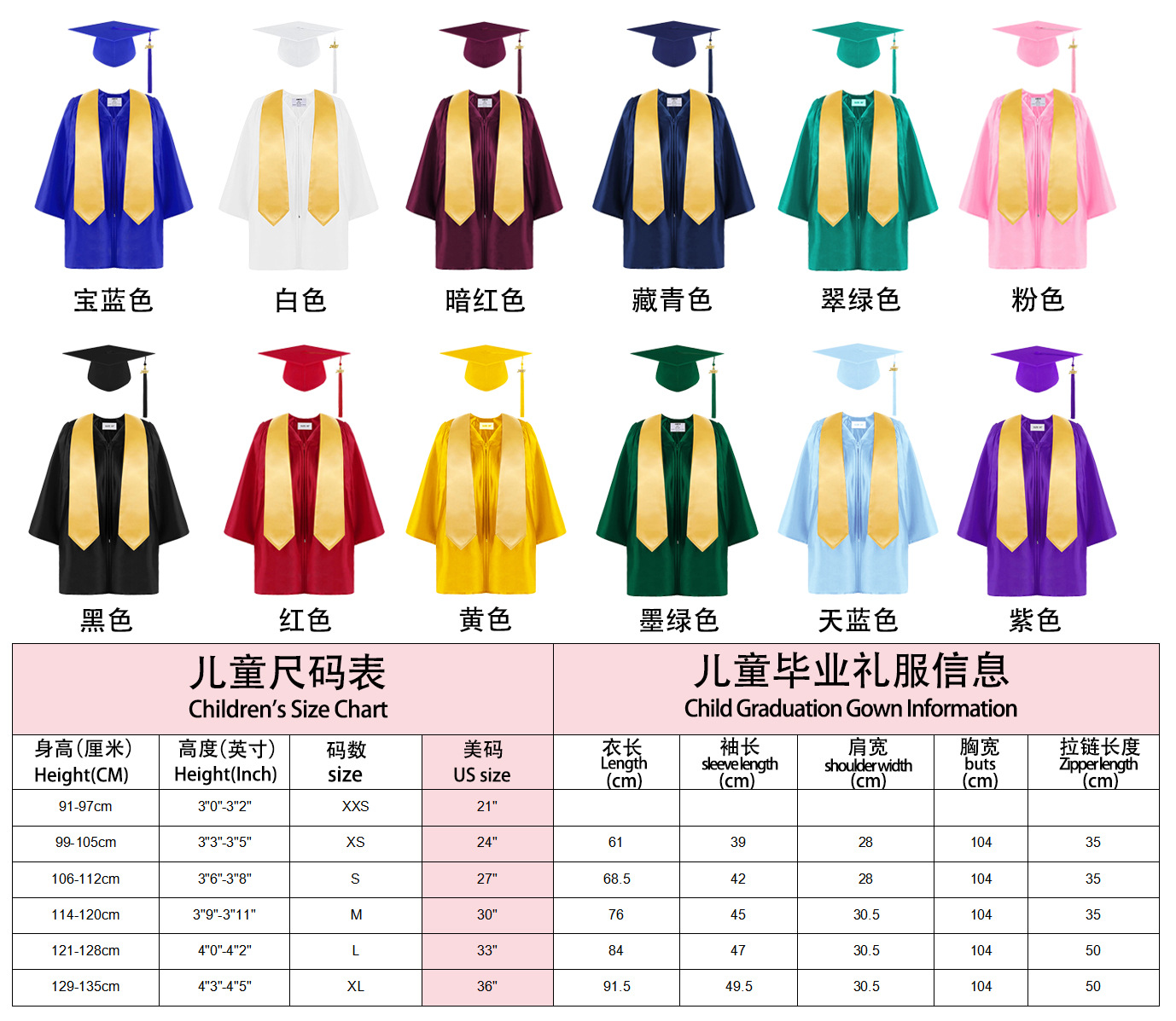 Белый (халат бакалавра + кепка + шаль); Розовый (униформа бакалавра + шляпа + шаль); Жёлтый (униформа бакалавра + кепка + шаль); Красный (халат бакалавра + кепка + шаль); Фиолетовый (униформа бакалавра + кепка + шаль); Черный (академический мантия + шапочка + шаль); Травянисто-зеленый (униформа бакалавра + шляпа + шаль); Небесно-голубой (униформа бакалавра + шляпа + шаль); Темно-зеленый (униформа бакалавра + шапка + шаль); Темно-красный (униформа бакалавра + шляпа + шаль); Темно-синий (академическая форма + шляпа + шаль); Королевский синий (униформа бакалавра + шляпа + шаль)