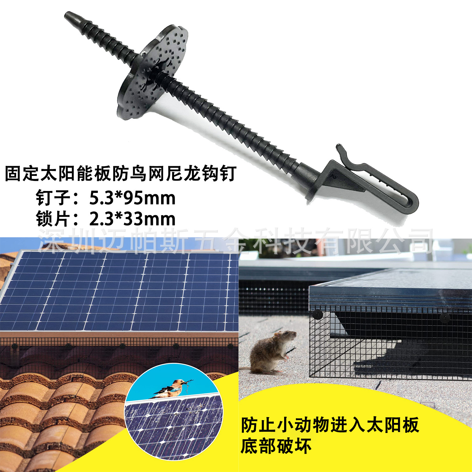 太阳能电池板网夹钩钉包含自锁式垫圈和J型挂钩。它们用于固定太阳能电池板的金属丝网,从而形成物理屏障,使鸟类远离太阳能电池阵列。