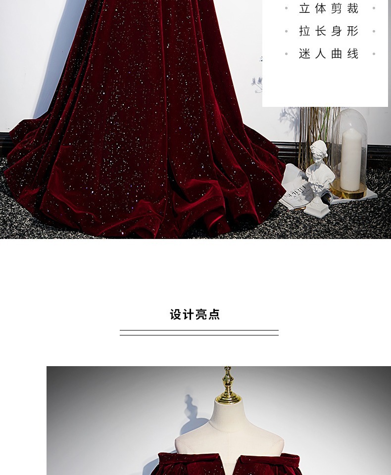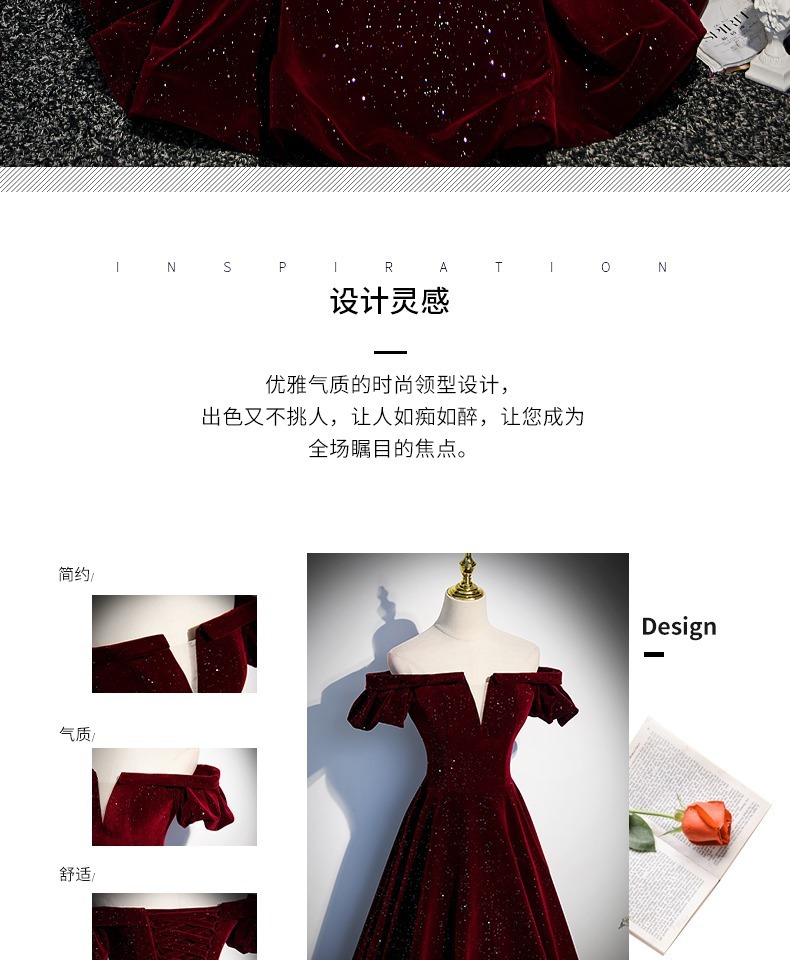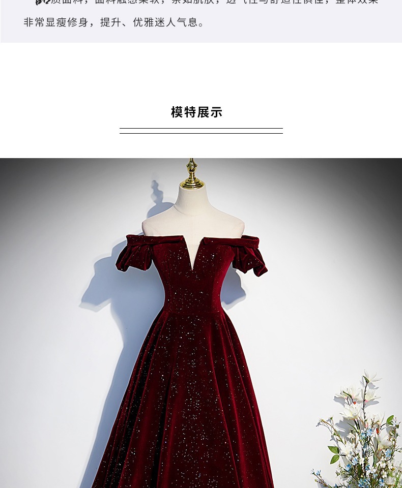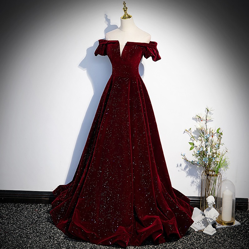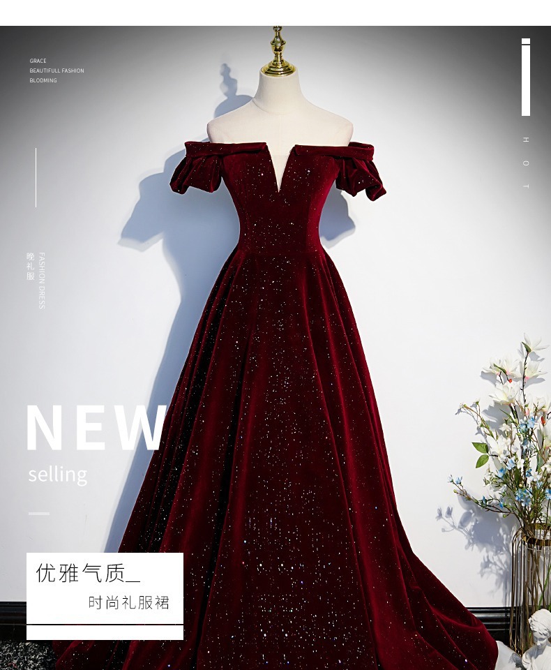 Off-плечи винно-красный бархат вечернее платье женское исполнение фортепиано хозяин высокого класса тост платье невесты Высокое чувство