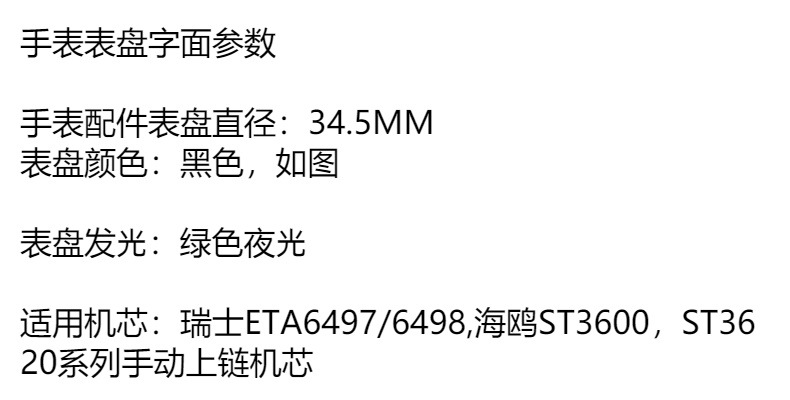 Циферблат часов подходит для сборки ST3600 ET6497 и другого ручного механизма 34,5 мм с зеленым светящимся циферблатом.