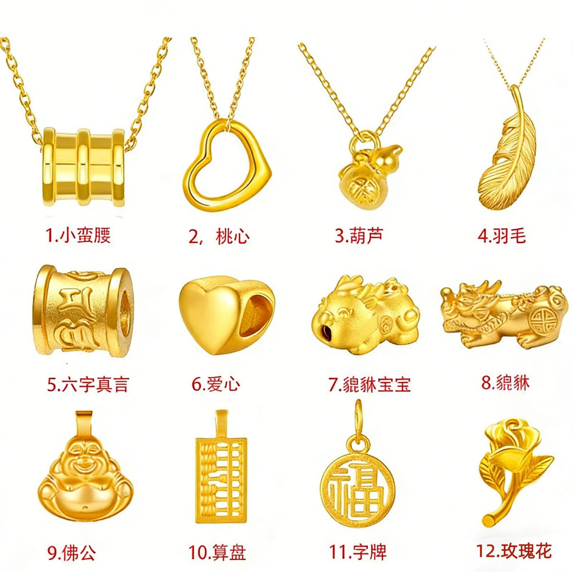 Рыбий хвост; Клевер; Гинкго жемчуг; Восемь сторон, чтобы заработать; Большая доска; 8N кошачий глаз; Маленькая талия; Абака; Перья; Большая карта благословения; Шестизначная правда; Гинкго; Будда; 18к тыквы; Любовь; Геометрия; Полая любовь; Благословение; Дуриан; Розы; Ветряная мельница с четырьмя листьями; Акация бобы; Цветение персика; Солнечный цветок; Маджонг