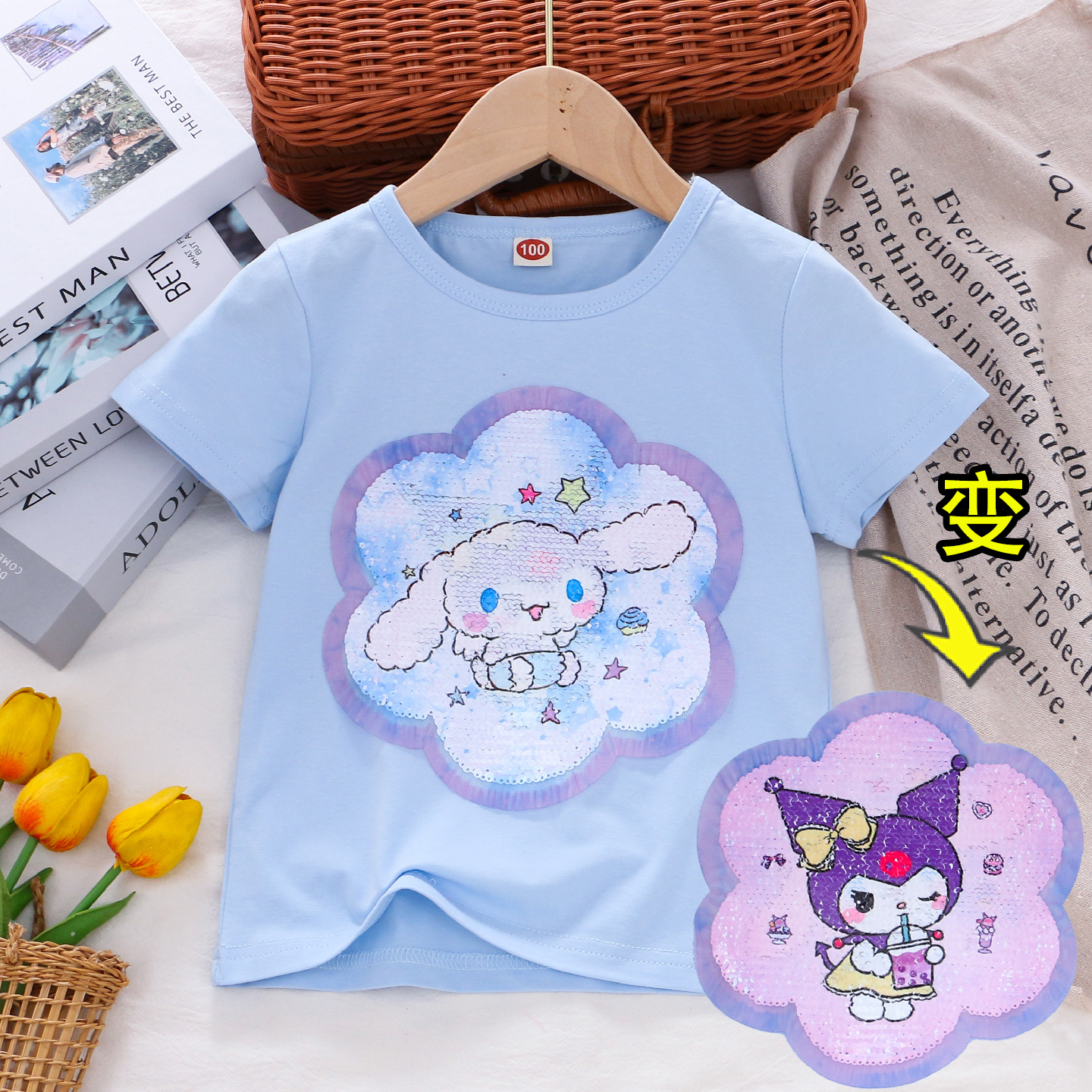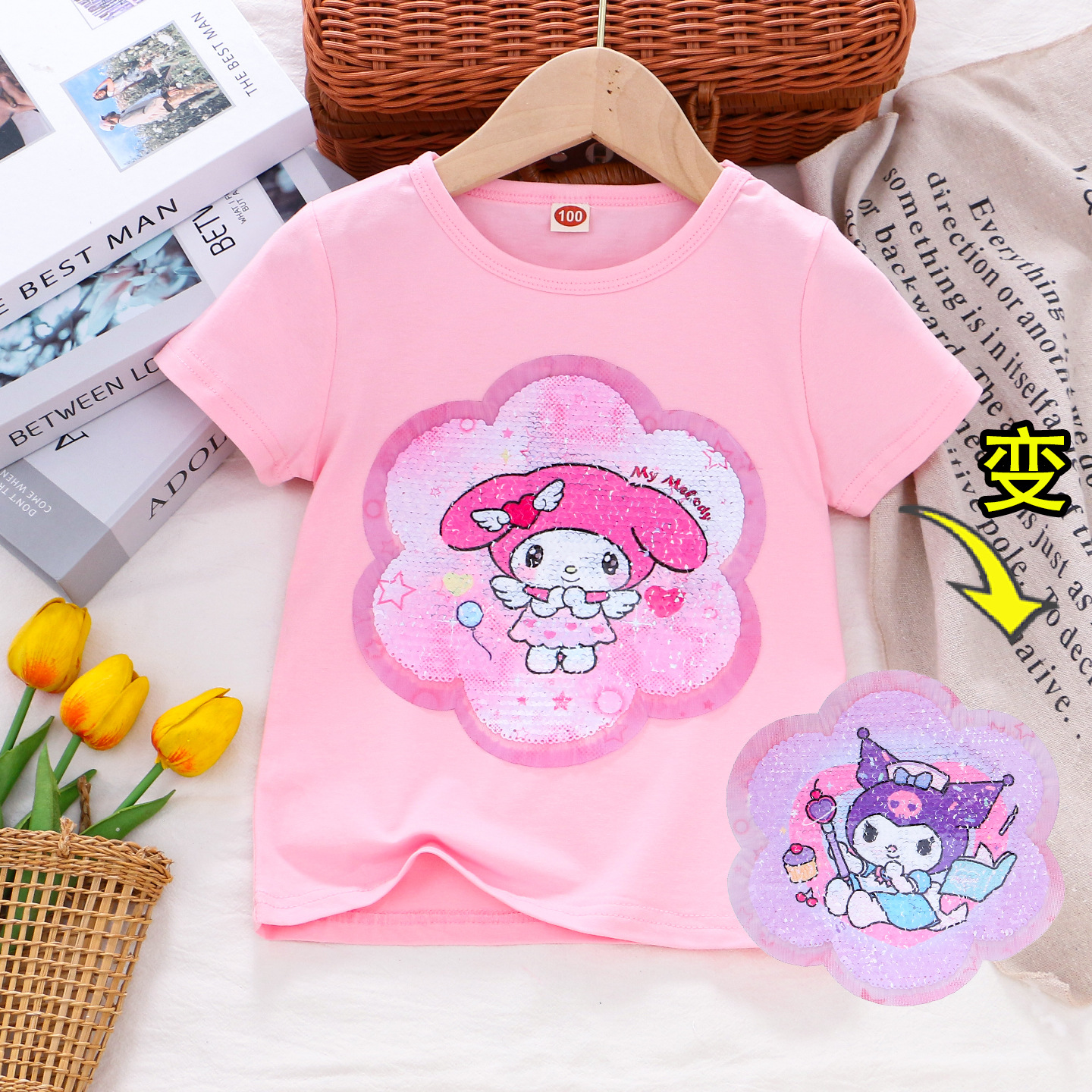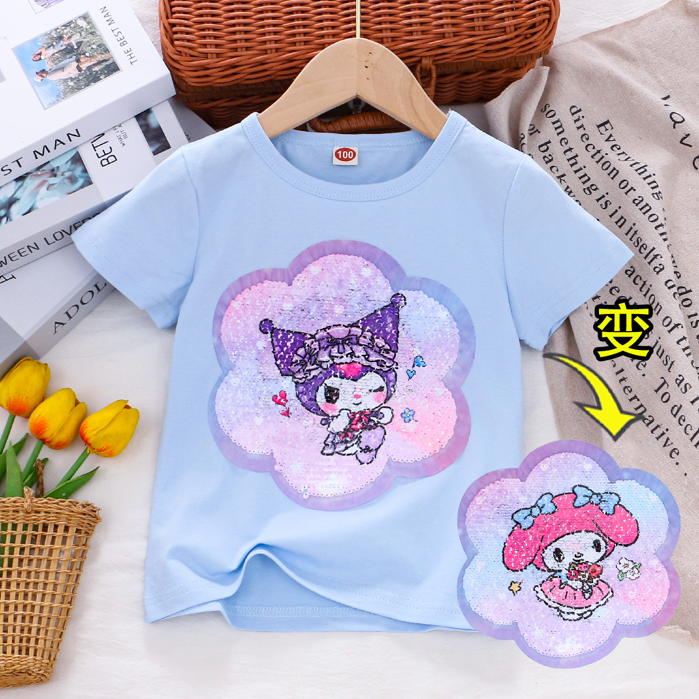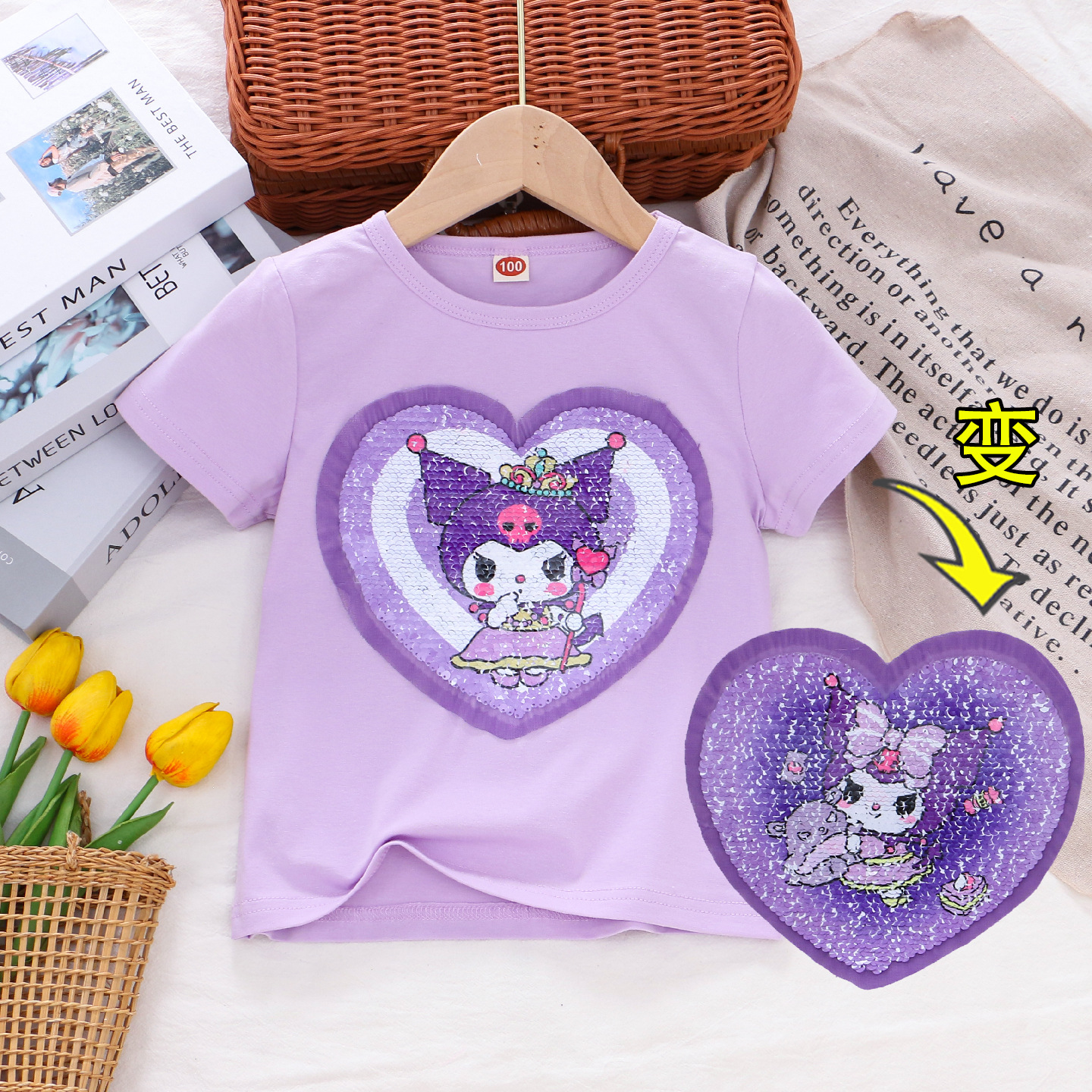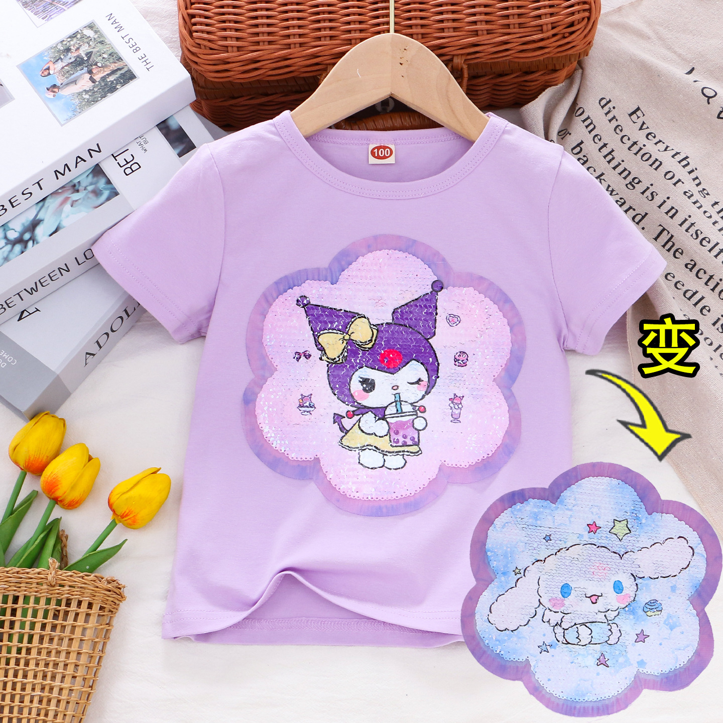 Базовая рубашка для девочек. 25 новой детской одежды. Летняя футболка с короткими рукавами и меняющими цвет пайетками для маленьких девочек. Базовая рубашка Kuromi.