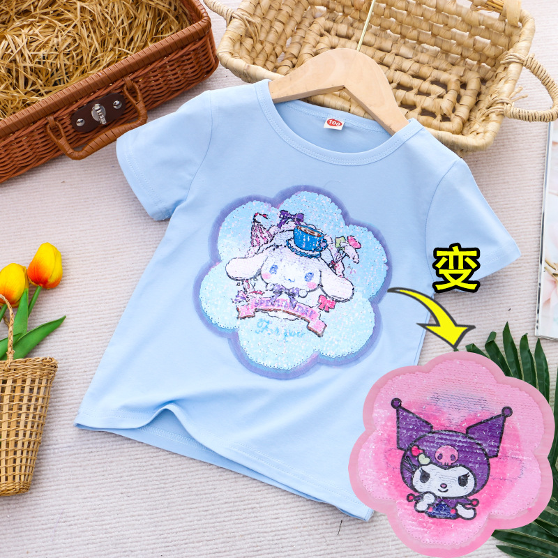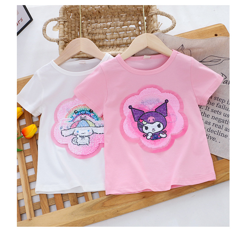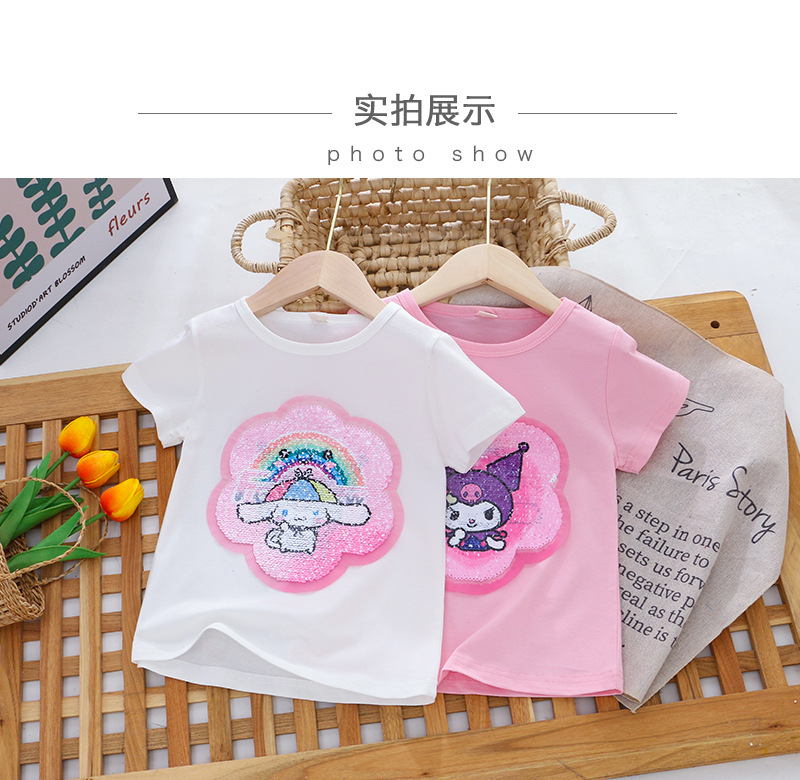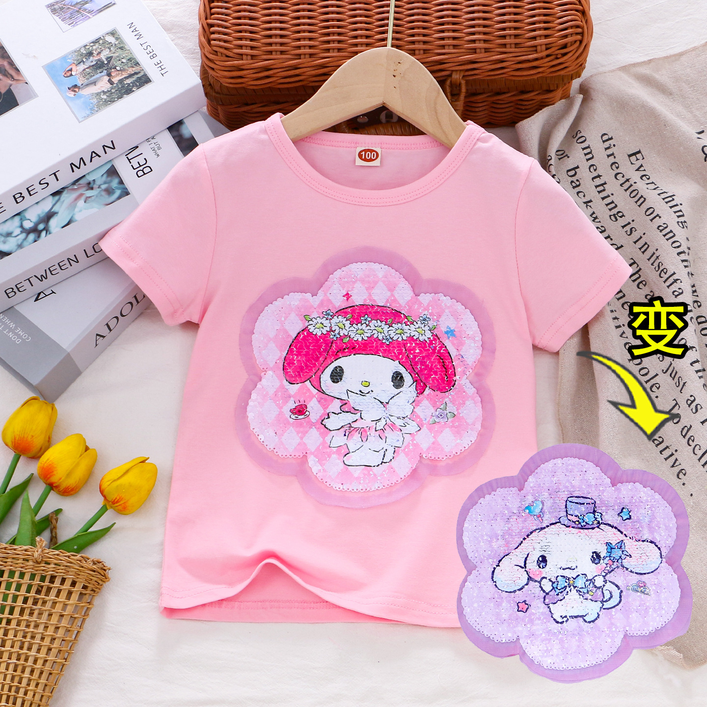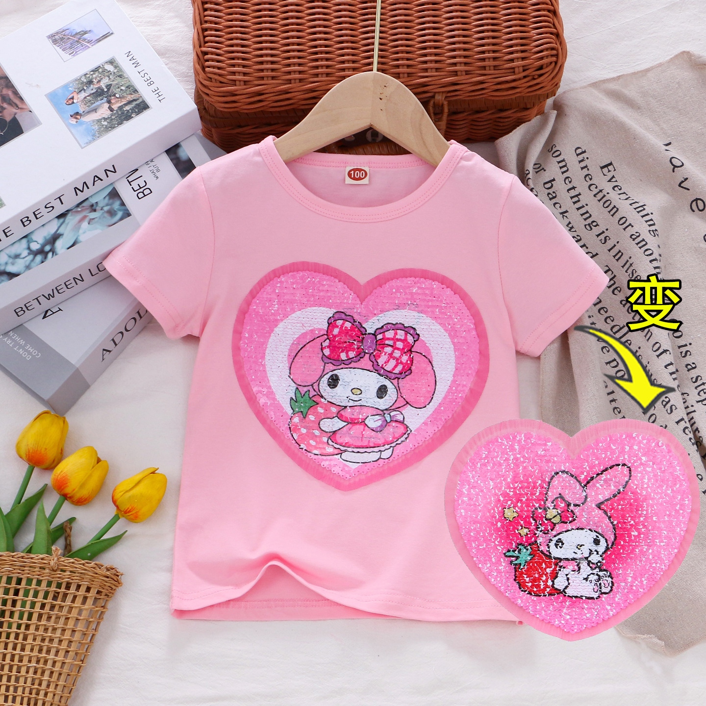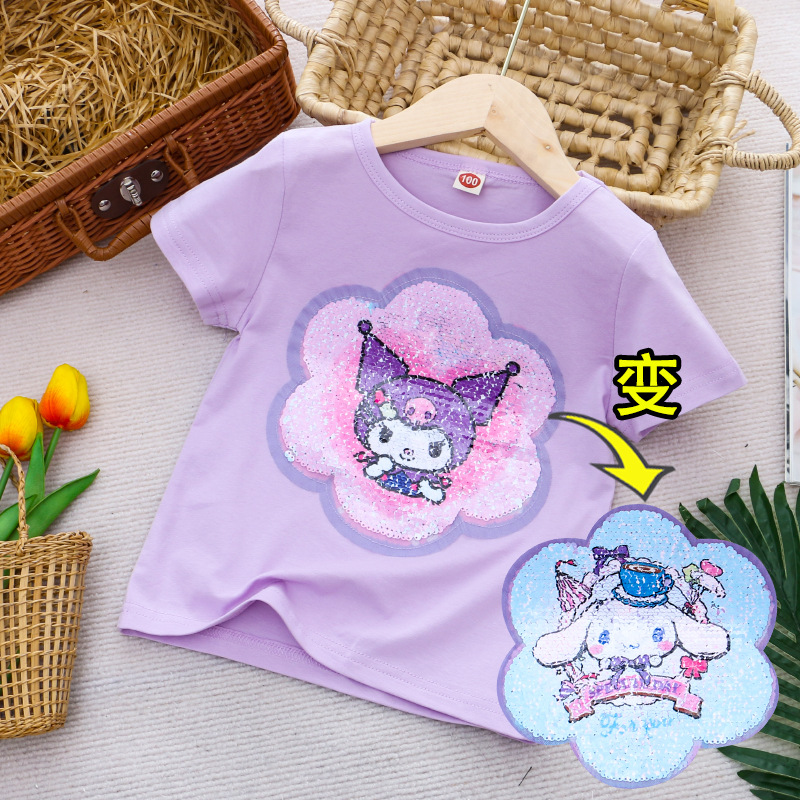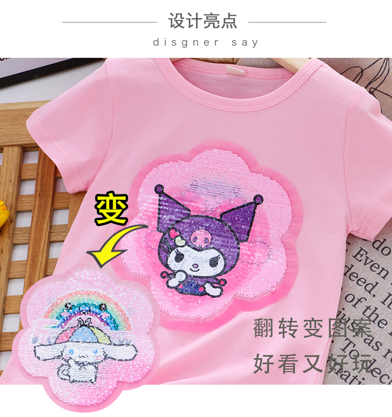 Базовая рубашка для девочек. 25 новой детской одежды. Летняя футболка с короткими рукавами и меняющими цвет пайетками для маленьких девочек. Базовая рубашка Kuromi.