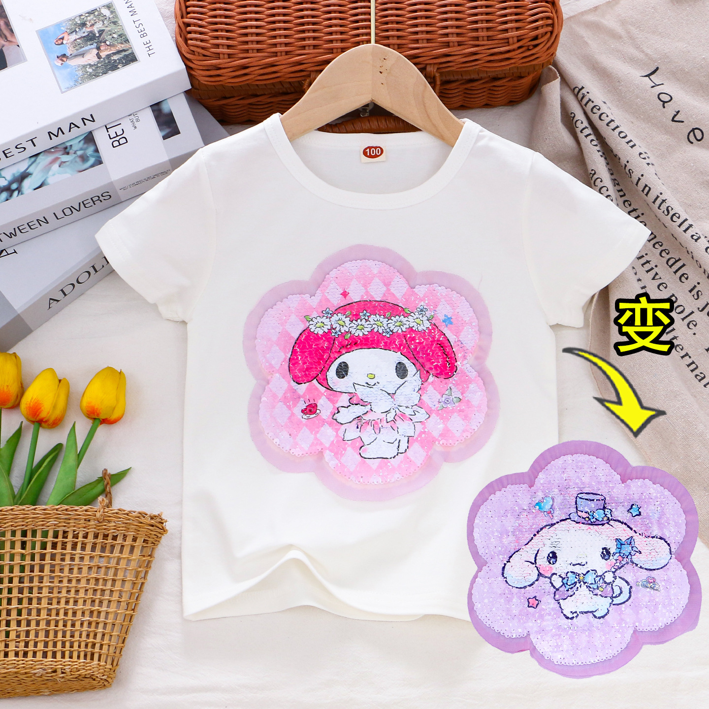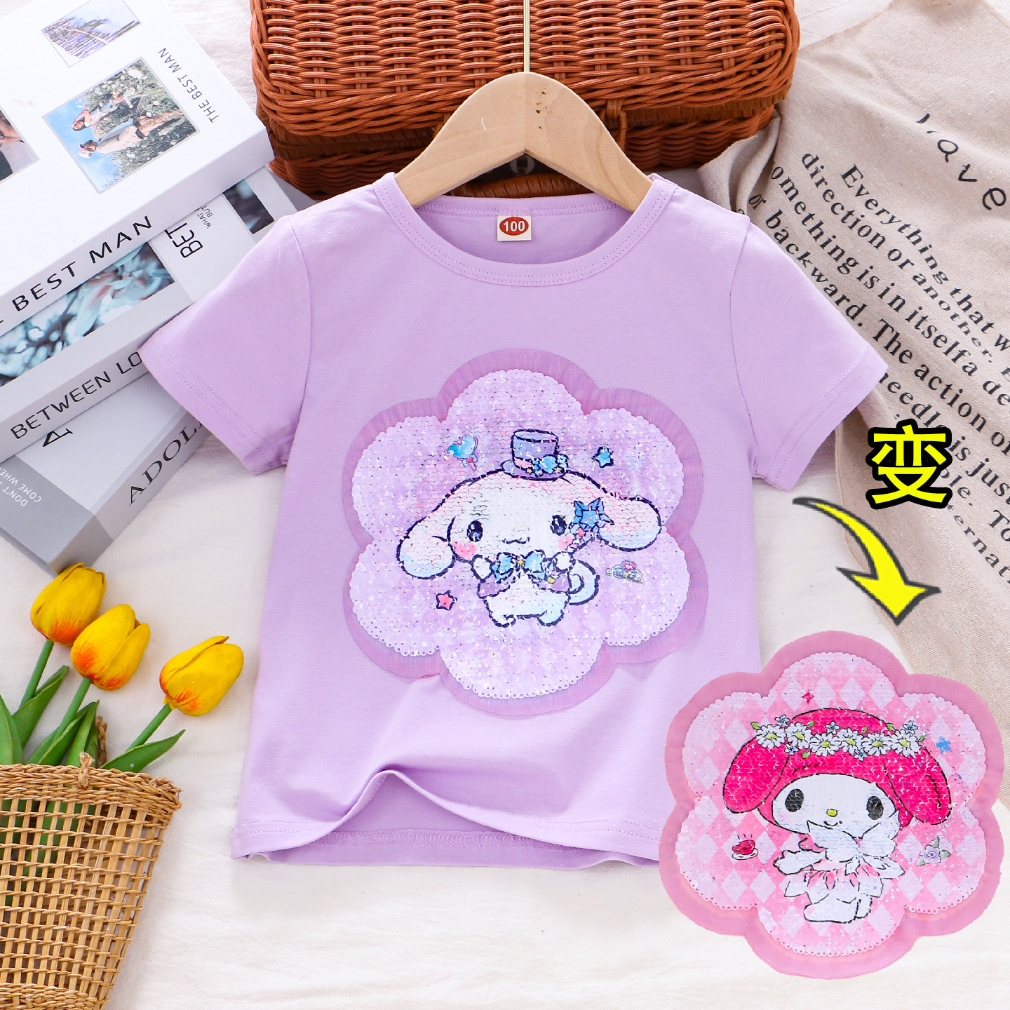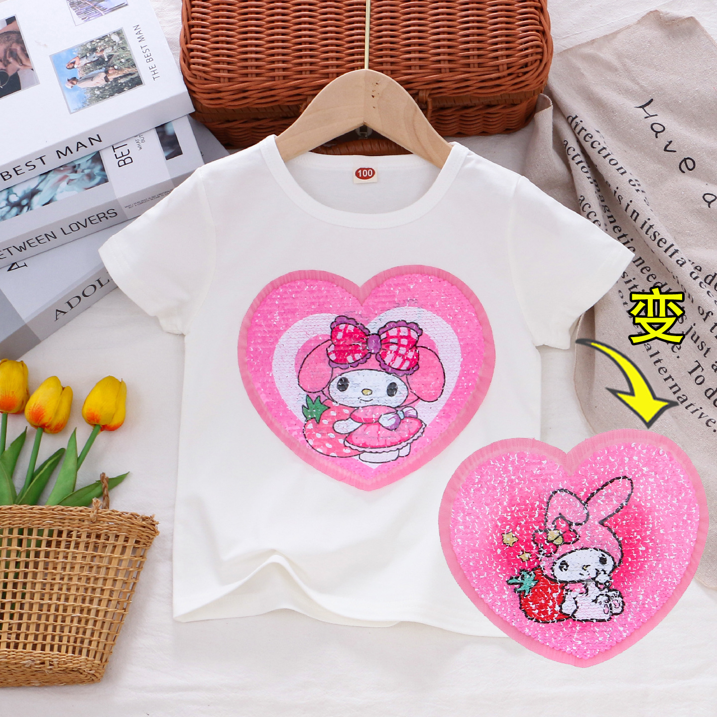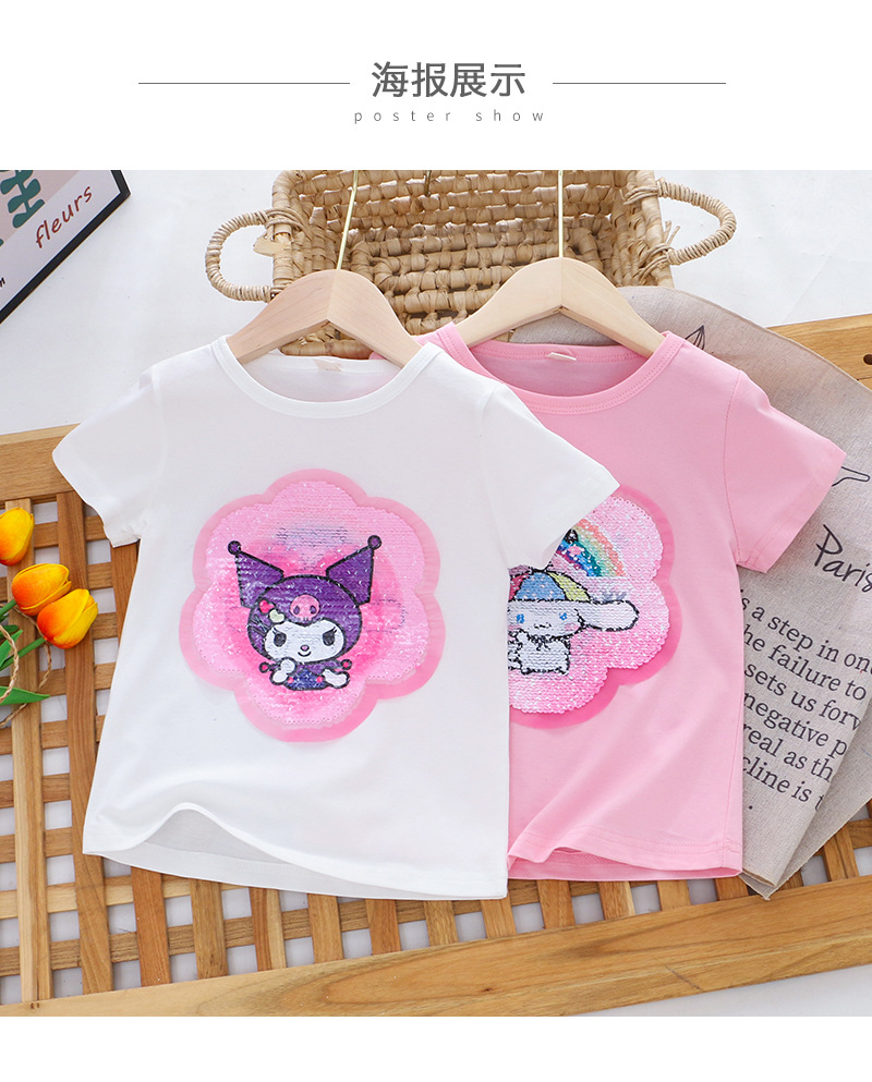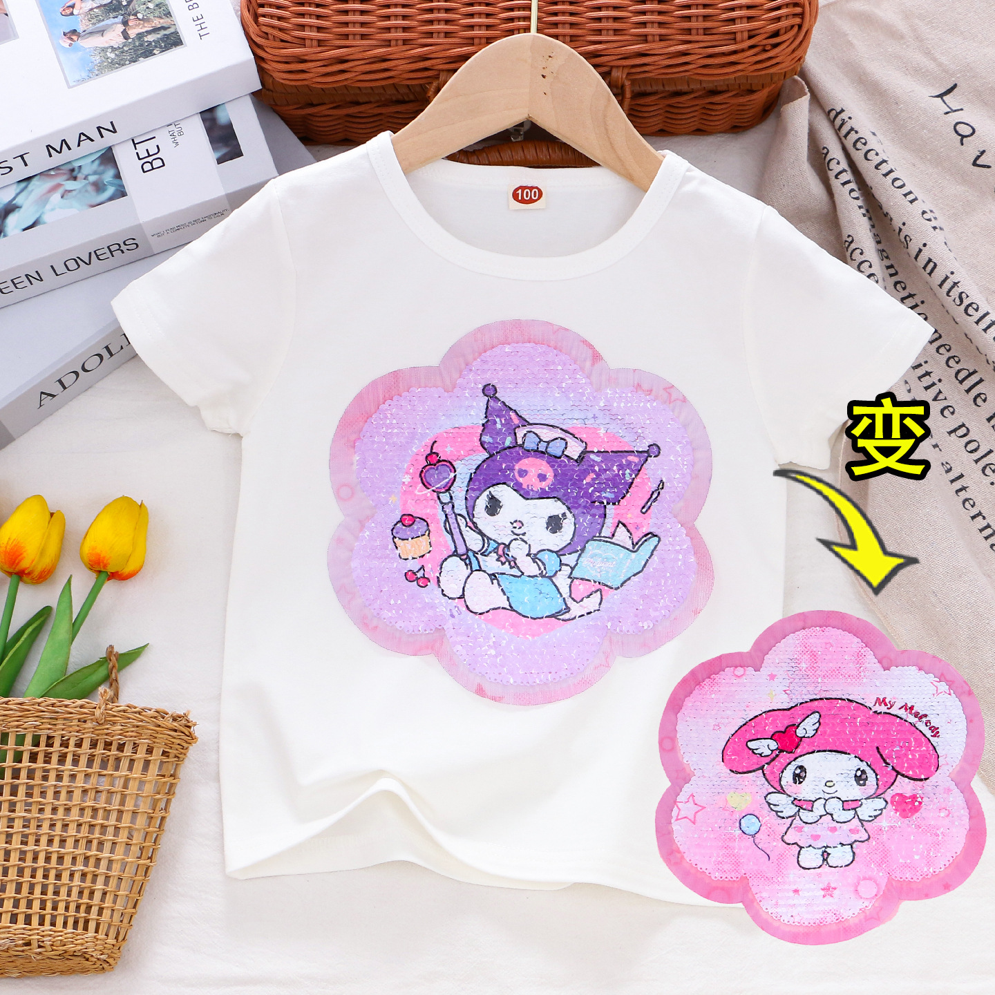 Базовая рубашка для девочек. 25 новой детской одежды. Летняя футболка с короткими рукавами и меняющими цвет пайетками для маленьких девочек. Базовая рубашка Kuromi.