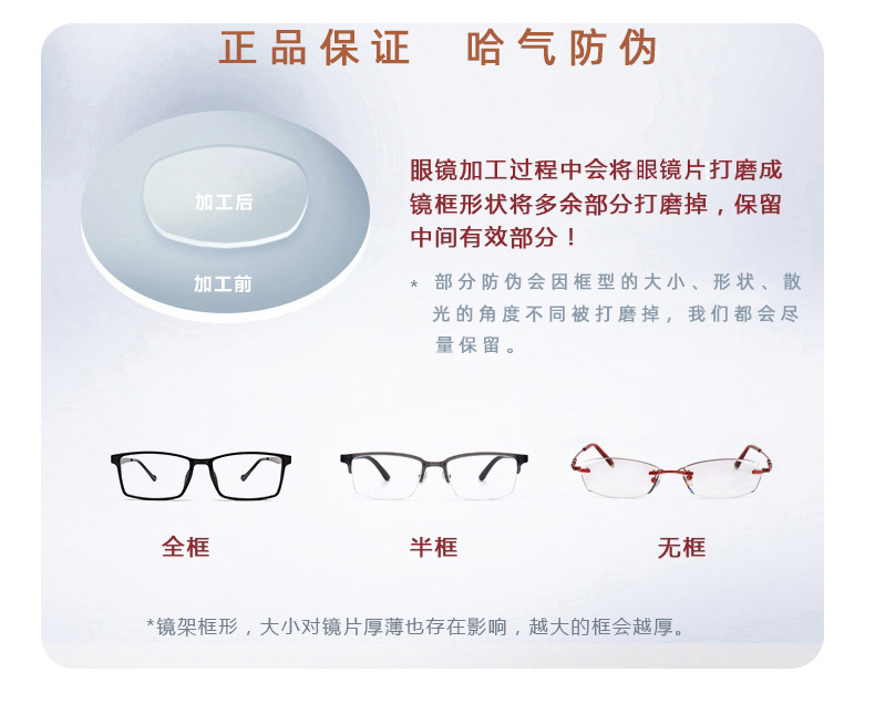 镜片属于定制产品,加工好以后就不能更改和退换了哦,配镜的朋友们请一定要提供准确的度数哦